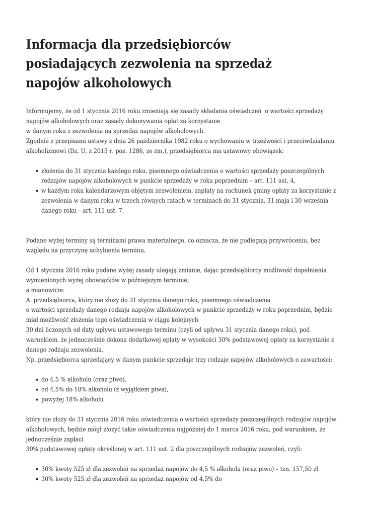 Informacja dla przedsiębiorców posiadających zezwolenia na sprzedaż napojów alkoholowych Informujemy, że od 1 stycznia 2016 roku zmieniają się zasady składania oświadczeń o wartości sprzedaży napojów alkoholowych oraz zasady dokonywania opłat za korzystanie w danym roku z zezwolenia na sprzedaż napojów alkoholowych. Zgodnie z przepisami ustawy z dnia 26 października 1982 roku o wychowaniu w trzeźwości i przeciwdziałaniu alkoholizmowi (Dz. U. z 2015 r. poz. 1286, ze zm.), przedsiębiorca ma ustawowy obowiązek: złożenia do 31 stycznia każdego roku, pisemnego oświadczenia o wartości sprzedaży poszczególnych rodzajów napojów alkoholowych w punkcie sprzedaży w roku poprzednim – art. 111 ust. 4, w każdym roku kalendarzowym objętym zezwoleniem, zapłaty na rachunek gminy opłaty za korzystanie z zezwolenia w danym roku w trzech równych ratach w terminach do 31 stycznia, 31 maja i 30 września danego roku – art. 111 ust. 7. Podane wyżej terminy są terminami prawa materialnego, co oznacza, że nie podlegają przywróceniu, bez względu na przyczynę uchybienia terminu. Od 1 stycznia 2016 roku podane wyżej zasady ulegają zmianie, dając przedsiębiorcy możliwość dopełnienia wymienionych wyżej obowiązków w późniejszym terminie, a mianowicie: A. przedsiębiorca, który nie złoży do 31 stycznia danego roku, pisemnego oświadczenia o wartości sprzedaży danego rodzaju napojów alkoholowych w punkcie sprzedaży w roku poprzednim, będzie miał możliwość złożenia tego oświadczenia w ciągu kolejnych 30 dni liczonych od daty upływu ustawowego terminu (czyli od upływu 31 stycznia danego roku), pod warunkiem, że jednocześnie dokona dodatkowej opłaty w wysokości 30% podstawowej opłaty za korzystanie z danego rodzaju zezwolenia. Np. przedsiębiorca sprzedający w danym punkcie sprzedaje trzy rodzaje napojów alkoholowych o zawartości: do 4,5 % alkoholu (oraz piwo), od 4,5% do 18% alkoholu (z wyjątkiem piwa), powyżej 18% alkoholu który nie złoży do 31 stycznia 2016 roku oświadczenia o wartości sprzedaży poszczególnych rodzajów napojów alkoholowych, będzie mógł złożyć takie oświadczenia najpóźniej do 1 marca 2016 roku, pod warunkiem, że jednocześnie zapłaci 30% podstawowej opłaty określonej w art. 111 ust. 2 dla poszczególnych rodzajów zezwoleń, czyli: 30% kwoty 525 zł dla zezwoleń na sprzedaż napojów do 4,5 % alkoholu (oraz piwo) – tzn. 157,50 zł 30% kwoty 525 zł dla zezwoleń na sprzedaż napojów od 4,5% do 18% alkoholu (z wyjątkiem piwa) – tzn. 157,50 zł 30% kwoty 2.100 zł dla zezwoleń na sprzedaż napojów powyżej 18% alkoholu, tzn. 630,0 zł. Niezłożenie oświadczenia o wartości sprzedaży danego rodzaju alkoholu, w dodatkowym terminie wraz z wymaganą opłatą, spowoduje wygaszenie zezwolenia. B. przedsiębiorca, który nie zapłaci w ustawowym terminie do 31 stycznia, 31 maja i 30 września danego roku, kolejnej raty za korzystanie z zezwolenia w danym roku, będzie miał możliwość dokonania tej wpłaty w ciągu kolejnych 30 dni liczonych od daty upływu ustawowego terminu, pod warunkiem, że jednocześnie dokona dodatkowej opłaty w wysokości 30% opłaty za korzystanie z danego rodzaju zezwolenia, wyliczonej dla danego roku. Oznacza to, że jeśli przedsiębiorca w poprzednim roku nie przekroczył ustawowych progów określonych w art. 111 ust. 5, będzie wpłacał 30% podstawowej opłaty rocznej dla danego rodzaju zezwolenia. Jeśli jednak przedsiębiorca przekroczył ustawowe progi, będzie wpłacał 30% opłaty podwyższonej określonej w art. 111 ust. 5. Np. przedsiębiorca sprzedający w danym punkcie trzy rodzaje napojów alkoholowych o zawartości: do 4,5 % alkoholu (oraz piwo), od 4,5% do 18% alkoholu (z wyjątkiem piwa), powyżej 18% alkoholu który nie zapłaci do 31 stycznia 2016 roku pierwszej raty za korzystanie z tych zezwoleń, i który nie przekroczył ustawowych progów wartości sprzedaży, będzie mógł dokonać wymaganej opłaty najpóźniej do 1 marca 2016 roku, pod warunkiem, że jednocześnie zapłaci 30% podstawowej opłaty określonej w art. 111 ust. 2 dla poszczególnych rodzajów zezwoleń, czyli: 30% kwoty 525 zł dla zezwoleń na sprzedaż napojów do 4,5 % alkoholu (oraz piwo) – tzn. 157,50 zł 30% kwoty 525 zł dla zezwoleń na sprzedaż napojów od 4,5% do 18% alkoholu (z wyjątkiem piwa) – tzn. 157,50 zł 30% kwoty 2.100 zł dla zezwoleń na sprzedaż napojów powyżej 18% alkoholu, tzn. 630,0 zł. W przypadku przekroczenia ustawowych progów wartości sprzedaży alkoholu, roczna opłata dla poszczególnych rodzajów zezwoleń obliczana w sposób określony w art. 111 ust. 5, tzn. przy przekroczeniu wartości: 1. 37 500 zł dla napojów alkoholowych o zawartości do 4,5% alkoholu oraz piwa – roczną opłatę wnosi się w wysokości 1,4% ogólnej wartości sprzedaży tych napojów w roku poprzednim; 2. 37 500 zł dla napojów alkoholowych o zawartości od 4,5% do 18% alkoholu (z wyjątkiem piwa) – roczną opłatę wnosi się w wysokości 1,4% ogólnej wartości sprzedaży tych napojów w roku poprzednim; 3. 77 000 zł dla napojów alkoholowych o zawartości powyżej 18% alkoholu – wnosi się w wysokości 2,7% ogólnej wartości sprzedaży tych napojów w roku poprzednim. Jeśli przedsiębiorca, który przekroczył w 2015 roku ustawowe progi określone w art. 111 ust. 5, nie zapłaci do 31 stycznia 2016 roku pierwszej raty za korzystanie z poszczególnych rodzajów zezwoleń, będzie mógł zapłacić pierwszą ratę najpóźniej do 1 marca 2016 roku, pod warunkiem, że jednocześnie zapłaci dodatkowo 30% podwyższonej opłaty rocznej wyliczonej dla danego rodzaju zezwolenia. Te same zasady będą obowiązywać w przypadku braku opłaty kolejnych rat. Brak opłaty raty w dodatkowym terminie wraz z wymaganą dodatkową 30% opłatą spowoduje wygaszenie zezwolenia. Boże Narodzenie Centrum Dziennego Pobytu Senior-Wigor w Babiaku Gmina Babiak w 