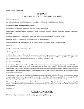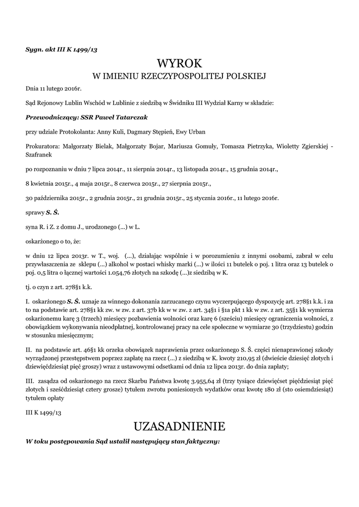 Sygn. akt III K 1499/13 WYROK W IMIENIU RZECZYPOSPOLITEJ POLSKIEJ Dnia 11 lutego 2016r. Sąd Rejonowy Lublin Wschód w Lublinie z siedzibą w Świdniku III Wydział Karny w składzie: Przewodniczący: SSR Paweł Tatarczak przy udziale Protokolanta: Anny Kuli, Dagmary Stępień, Ewy Urban Prokuratora: Małgorzaty Bielak, Małgorzaty Bojar, Mariusza Gomuły, Tomasza Pietrzyka, Wioletty Zgierskiej Szafranek po rozpoznaniu w dniu 7 lipca 2014r., 11 sierpnia 2014r., 13 listopada 2014r., 15 grudnia 2014r., 8 kwietnia 2015r., 4 maja 2015r., 8 czerwca 2015r., 27 sierpnia 2015r., 30 października 2015r., 2 grudnia 2015r., 21 grudnia 2015r., 25 stycznia 2016r., 11 lutego 2016r. sprawy S. Ś. syna R. i Z. z domu J., urodzonego (...) w L. oskarżonego o to, że: w dniu 12 lipca 2013r. w T., woj. (...), działając wspólnie i w porozumieniu z innymi osobami, zabrał w celu przywłaszczenia ze sklepu (...) alkohol w postaci whisky marki (...) w ilości 11 butelek o poj. 1 litra oraz 13 butelek o poj. 0,5 litra o łącznej wartości 1.054,76 złotych na szkodę (...)z siedzibą w K. tj. o czyn z art. 278§1 k.k. I. oskarżonego S. Ś. uznaje za winnego dokonania zarzucanego czynu wyczerpującego dyspozycję art. 278§1 k.k. i za to na podstawie art. 278§1 kk zw. w zw. z art. 37b kk w w zw. z art. 34§1 i §1a pkt 1 kk w zw. z art. 35§1 kk wymierza oskarżonemu karę 3 (trzech) miesięcy pozbawienia wolności oraz karę 6 (sześciu) miesięcy ograniczenia wolności, z obowiązkiem wykonywania nieodpłatnej, kontrolowanej pracy na cele społeczne w wymiarze 30 (trzydziestu) godzin w stosunku miesięcznym; II. na podstawie art. 46§1 kk orzeka obowiązek naprawienia przez oskarżonego S. Ś. części nienaprawionej szkody wyrządzonej przestępstwem poprzez zapłatę na rzecz (...) z siedzibą w K. kwoty 210,95 zł (dwieście dziesięć złotych i dziewięćdziesiąt pięć groszy) wraz z ustawowymi odsetkami od dnia 12 lipca 2013r. do dnia zapłaty; III. zasądza od oskarżonego na rzecz Skarbu Państwa kwotę 3.955,64 zł (trzy tysiące dziewięćset pięćdziesiąt pięć złotych i sześćdziesiąt cztery grosze) tytułem zwrotu poniesionych wydatków oraz kwotę 180 zł (sto osiemdziesiąt) tytułem opłaty III K 1499/13 UZASADNIENIE W toku postępowania Sąd ustalił następujący stan faktyczny: W dniu 12 lipca 2013r. o godzinie 19.04 do sklepu sieci (...) w T. województwa (...) wszedł wysoki, nieustalony mężczyzna (obiekt 1). Zaraz po nim wszedł z przewieszoną na ramieniu torbą drugi nieustalony mężczyzna (obiekt 2), który od razu przeszedł na halę sprzedażową. Pierwszy mężczyzna wziął czerwony koszyk na kółkach i też udał się na halę sprzedażową. Obaj spotkali się przy regałach chłodniczych. O godzinie 19.04 do sklepu wszedł także oskarżony S. Ś., ubrany w koszulkę koloru czerwonego z białym orłem z przodu (obiekt nr 3). Poczekał przy wejściu, aż weszli także W. M. (obiekt nr 4) i P. R. (obiekt nr 5). Razem udali się na halę sprzedażową. W tym czasie pierwszy i drugi nieustalony mężczyzna przemieszczali razem po sklepie oglądając towar. O godzinie 19.07 pierwszy mężczyzna przeszedł z prowadzonym koszykiem na dział alkoholowy, prowadząc rozmowę przez telefon komórkowy. O godzinie 19.12 drugi mężczyzna zatrzymał się przy S. Ś., W. M. i P. R.. Drugi nieustalony mężczyzna następnie oddalił się, by po przejściu przez sklep, ponownie zatrzymać się przy oskarżonym prowadząc z nim rozmowę. O godzinie 19.14 drugi mężczyzna przeszedł na dział alkoholowy zatrzymując się przy pierwszym nieustalonym mężczyźnie. O godzinie 19.15 pierwszy mężczyzna z wózkiem wypełnionym butelkami zaczął się przemieszczać po sklepie, rozmawiając przez telefon komórkowy. Zaraz za nim udał się drugi nieustalony mężczyzna. W tym czasie S. Ś., W. M. i P. R. cały czas stali w kolejce do kasy nr 5, wyjmując przed kasjerką produkty z jednego, wspólnego, koszyka. P. R. przekazał pieniądze W. M. i powrócił na halę sprzedażową. O godzinie 19.17 oskarżony zapłacił za swój towar i zapakował do reklamówki. Wówczas przy S. Ś. i W. M. pojawił się drugi nieustalony mężczyzna. Oskarżony oddalił się od kasy w stronę wyjścia ze sklepu. W. M. pozostał przy kasie, płacąc za swoją część zakupów. O godzinie 19.18 P. R. z hali sprzedażowej doniósł mu nieustalony produkt, który W. M. wziął i zapłacił za jego zakup. Następnie W. M. opuścił sklep, stojąc przy wyjściu wraz z S. Ś.. O godzinie 19.20 P. R. przemieszczał się po sklepie w towarzystwie drugiego nieustalonego mężczyzny. Obaj przeszli obok pierwszego nieustalonego mężczyzny rozmawiającego przez telefon, po czym drugi nieustalony mężczyzna wrócił do niego. Stali przy regale chłodniczym, w rogu sklepu. Po chwili drugi nieustalony mężczyzna jednak oddalił się, by ponownie spotkać się P. R. o godzinie 19.24. Następnie drugi nieustalony mężczyzna ponownie wrócił do pierwszego nieustalonego mężczyzny, razem rozmawiali. Już po jego odejściu pierwszy nieustalony mężczyzna, będąc przy regałach chłodniczych na dziale z wędlinami wyjął zieloną torbę. Będąc odwróconym plecami do innych klientów przepakował do niej z wózka alkohol w postaci 11 butelek whisky marki (...) każda o pojemności 1 litr oraz 13 butelek whisky marki (...)każda o pojemności 0,5 litra. O godzinie 19.27 zawiesił zieloną torbę na lewym ramieniu i rozmawiając przez telefon udał się w stronę kas. Wózek zakupowy pozostawił w miejscu gdzie przepakował alkohol. O godzinie 19.28 P. R. zapłacił za zakupiony towar w kasie nr 5 i oddalił się w stronę wyjścia ze sklepu. W następnej minucie przy tej samej kasie przeszedł drugi nieustalony mężczyzna i wyszedł ze sklepu. Pierwszy nieustalony mężczyzna także przeszedł z torbą pomiędzy kasami nr 5 i 6. Za towar nie zapłacił, oddalając się ze sklepu. Dokonał tym samym zaboru alkoh