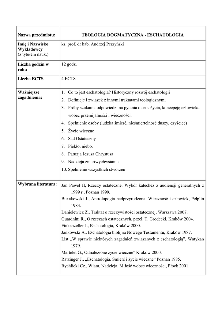 Nazwa przedmiotu: TEOLOGIA DOGMATYCZNA - ESCHATOLOGIA Imię i Nazwisko Wykładowcy (z tytułem nauk.)Ś ks. prof. dr hab. Andrzej Perzyński Liczba godzin w roku 12 godz. Liczba ECTS 4 ECTS Ważniejsze zagadnienia: 1. Co to jest eschatologia? Historyczny rozwój eschatologii 2. Definicje i związek z innymi traktatami teologicznymi 3. Próby szukania odpowiedzi na pytania o sens ycia, koncepcję człowieka wobec przemijalno ci i wieczno ci. 4. Spełnienie osoby (ludzka mierć, nie miertelno ć duszy, czy ciec) 5. ycie wieczne 6. Sąd Ostateczny 7. Piekło, niebo. 8. Paruzja Jezusa Chrystusa 9. Nadzieja zmartwychwstania 10. Spełnienie wszystkich stworzeń Wybrana literatura: Jan Paweł II, Rzeczy ostateczne. Wybór katechez z audiencji generalnych z 1999 r., Poznań 1999. Buxakowski J., Antrolopogia nadprzyrodzona. Wieczno ć i człowiek, Pelplin 1983. Danielewicz Z., Traktat o rzeczywisto ci ostatecznej, Warszawa 2007. żuardnini R., O rzeczach ostatecznych, przeł. T. żrodecki, Kraków 2004. Finkenzeller J., Eschatologia, Kraków 2000. Jankowski A., Eschatologia biblijna Nowego Testamentu, Kraków 1987. List „W sprawie niektórych zagadnień związanych z eschatologią”, Watykan 1979. Martelet ż., Odnalezione ycie wieczne” Kraków 2000. Ratzinger J., „Eschatologia. mierć i ycie wieczne” Poznań 1985. Rychlicki Cz., Wiara, Nadzieja, Miło ć wobec wieczno ci, Płock 2001.
