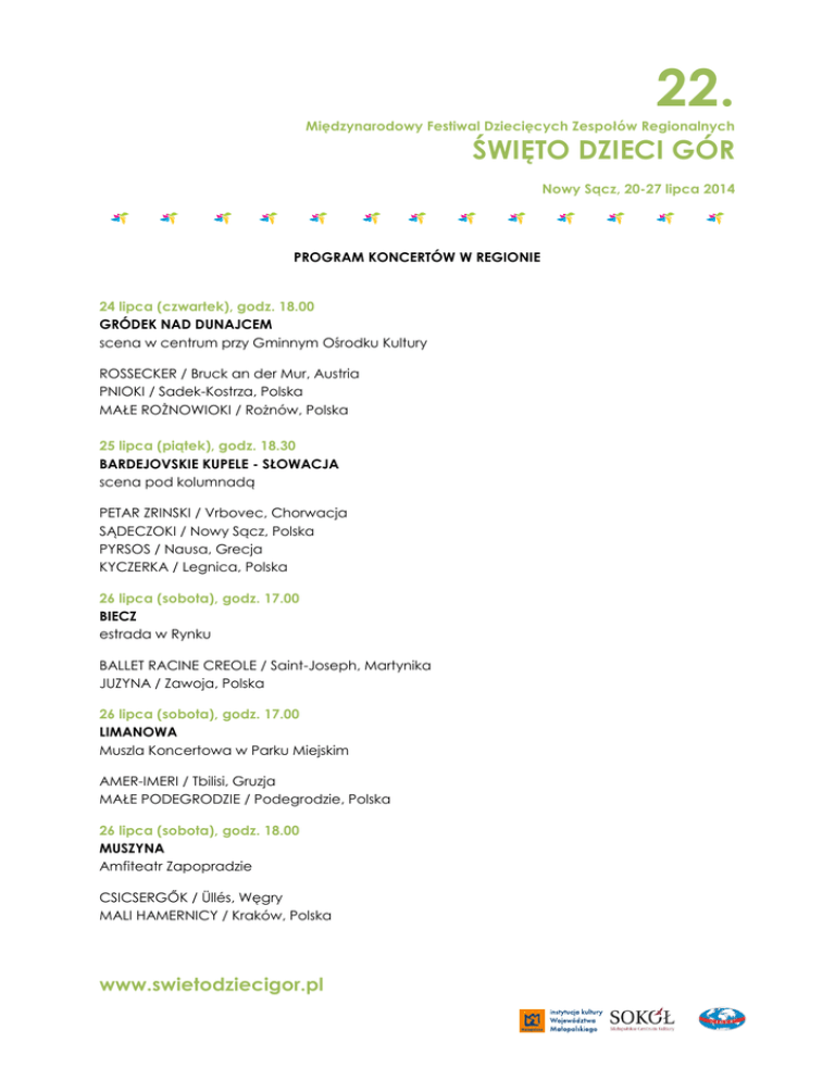 22. Międzynarodowy Festiwal Dziecięcych Zespołów Regionalnych ŚWIĘTO DZIECI GÓR Nowy Sącz, 20-27 lipca 2014 PROGRAM KONCERTÓW W REGIONIE 24 lipca (czwartek), godz. 18.00 GRÓDEK NAD DUNAJCEM scena w centrum przy Gminnym Ośrodku Kultury ROSSECKER / Bruck an der Mur, Austria PNIOKI / Sadek-Kostrza, Polska MAŁE ROŻNOWIOKI / Rożnów, Polska 25 lipca (piątek), godz. 18.30 BARDEJOVSKIE KUPELE - SŁOWACJA scena pod kolumnadą PETAR ZRINSKI / Vrbovec, Chorwacja SĄDECZOKI / Nowy Sącz, Polska PYRSOS / Nausa, Grecja KYCZERKA / Legnica, Polska 26 lipca (sobota), godz. 17.00 BIECZ estrada w Rynku BALLET RACINE CREOLE / Saint-Joseph, Martynika JUZYNA / Zawoja, Polska 26 lipca (sobota), godz. 17.00 LIMANOWA Muszla Koncertowa w Parku Miejskim AMER-IMERI / Tbilisi, Gruzja MAŁE PODEGRODZIE / Podegrodzie, Polska 26 lipca (sobota), godz. 18.00 MUSZYNA Amfiteatr Zapopradzie CSICSERGŐK / Üllés, Węgry MALI HAMERNICY / Kraków, Polska www.swietodziecigor.pl