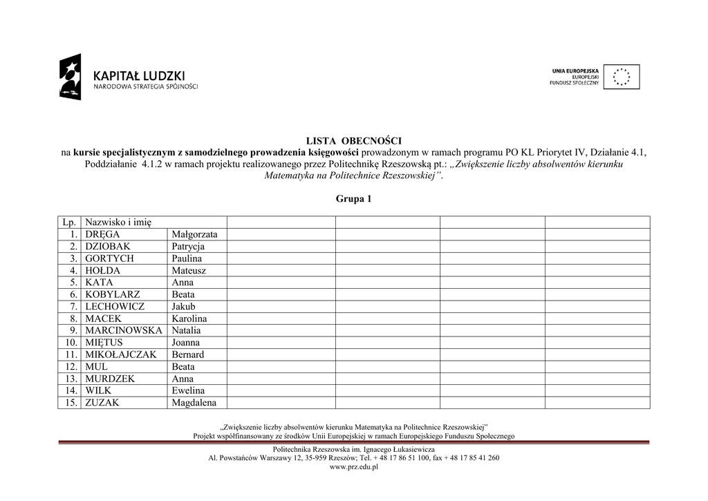 LISTA OBECNOŚCI na kursie specjalistycznym z samodzielnego prowadzenia księgowości prowadzonym w ramach programu PO KL Priorytet IV, Działanie 4.1, Poddziałanie 4.1.2 w ramach projektu realizowanego przez Politechnikę Rzeszowską pt.: „Zwiększenie liczby absolwentów kierunku Matematyka na Politechnice Rzeszowskiej”. Grupa 1 Lp. 1. 2. 3. 4. 5. 6. 7. 8. 9. 10. 11. 12. 13. 14. 15. Nazwisko i imię DRĘGA DZIOBAK GORTYCH HOŁDA KATA KOBYLARZ LECHOWICZ MACEK MARCINOWSKA MIĘTUS MIKOŁAJCZAK MUL MURDZEK WILK ZUZAK Małgorzata Patrycja Paulina Mateusz Anna Beata Jakub Karolina Natalia Joanna Bernard Beata Anna Ewelina Magdalena „Zwiększenie liczby absolwentów kierunku Matematyka na Politechnice Rzeszowskiej” Projekt współfinansowany ze środków Unii Europejskiej w ramach Europejskiego Funduszu Społecznego Politechnika Rzeszowska im. Ignacego Łukasiewicza Al. Powstańców Warszawy 12, 35-959 Rzeszów; Tel. + 48 17 86 51 100, fax + 48 17 85 41 260 www.prz.edu.pl LISTA OBECNOŚCI na kursie specjalistycznym z samodzielnego prowadzenia księgowości prowadzonym w ramach programu PO KL Priorytet IV, Działanie 4.1, Poddziałanie 4.1.2 w ramach projektu realizowanego przez Politechnikę Rzeszowską pt.: „Zwiększenie liczby absolwentów kierunku Matematyka na Politechnice Rzeszowskiej”. Grupa 2 Lp. 1. 2. 3. 4. 5. 6. 7. 8. 9. 10. 11. 12. 13. 14. 15. Nazwisko i imię FRANCZAK KLUZ KŁAK LECHOWICZ ŁOBODA MIĘTUS MUCHA MUCHA PELC POCHWATKA PÓŁĆWIARTEK SIDOR TROJAŃSKA WAŻNY Małgorzata Ewelina Andżelika Andrzej Sebastian Dariusz Alicja Natalia Anna Damian Dominika Aleksandra Anna Paweł „Zwiększenie liczby absolwentów kierunku Matematyka na Politechnice Rzeszowskiej” Projekt współfinansowany ze środków Unii Europejskiej w ramach Europejskiego Funduszu Społecznego Politechnika Rzeszowska im. Ignacego Łukasiewicza Al. Powstańców Warszawy 12, 35-959 Rzeszów; Tel. + 48 17 86 51 100, fax + 48 17 85 41 260 www.prz.edu.pl LISTA OBECNOŚCI na kursie specjalistycznym z samodzielnego prowadzenia księgowości prowadzonym w ramach programu PO KL Priorytet IV, Działanie 4.1, Poddziałanie 4.1.2 w ramach projektu realizowanego przez Politechnikę Rzeszowską pt.: „Zwiększenie liczby absolwentów kierunku Matematyka na Politechnice Rzeszowskiej”. Grupa 3 Lp. 1. 2. 3. 4. 5. 6. 7. 8. 9. 10. 11. 12. 13. 14. 15. Nazwisko i imię BĄK CIEĆKA CZAS DYKA INGLOT JAKUBIAK KNAP KOCÓR MICHALIK MIERZWA PRUCNAL RZEŹNIK SARZYŃSKA TYPEK Justyna Sylwia Michał Katarzyna Katarzyna Monika Agata Andżelina Magdalena Joanna Ewa Justyna Natalia Natalia „Zwiększenie liczby absolwentów kierunku Matematyka na Politechnice Rzeszowskiej” Projekt współfinansowany ze środków Unii Europejskiej w ramach Europejskiego Funduszu Społecznego Politechnika Rzeszowska im. Ignacego Łukasiewicza Al. Powstańców Warszawy 12, 35-959 Rzeszów; Tel. + 48 17 86 51 100, fax + 48 17 85 41 260 www.prz.edu.pl LISTA OBECNOŚCI na kursie specjalistycznym z samodzielnego prowadzenia księgowości prowadzonym w ramach programu PO KL Priorytet IV, Działanie 4.1, Poddziałanie 4.1.2 w ramach projektu realizowanego przez Politechnikę Rzeszowską pt.: „Zwiększenie liczby absolwentów kierunku Matematyka na Politechnice Rzeszowskiej”. Grupa 4 Lp. 1. 2. 3. 4. 5. 6. 7. 8. 9. 10. 11. 12. 13. 14. 15. Nazwisko i imię GROMEK JAWORSKI KARDASZ KRĘŻEL KUŚ MACIĄG PAŚKO REIZER ROMANOWSKA ROZWADOWSKA STASZCZYK TOBIASZ WAWRZUSISZYN WIELGOSZ ŻUCHOWSKA Małgorzata Jakub Żaneta Aleksandra Justyna Donata Joanna Monika Katarzyna Klaudia Monika Paulina Agata Joanna Klaudia „Zwiększenie liczby absolwentów kierunku Matematyka na Politechnice Rzeszowskiej” Projekt współfinansowany ze środków Unii Europejskiej w ramach Europejskiego Funduszu Społecznego Politechnika Rzeszowska im. Ignacego Łukasiewicza Al. Powstańców Warszawy 12, 35-959 Rzeszów; Tel. + 48 17 86 51 100, fax + 48 17 85 41 260 www.prz.edu.pl LISTA OBECNOŚCI na kursie specjalistycznym z samodzielnego prowadzenia księgowości prowadzonym w ramach programu PO KL Priorytet IV, Działanie 4.1, Poddziałanie 4.1.2 w ramach projektu realizowanego przez Politechnikę Rzeszowską pt.: „Zwiększenie liczby absolwentów kierunku Matematyka na Politechnice Rzeszowskiej”. Grupa 5 Lp. 1. 2. 3. 4. 5. 6. 7. 8. 9. 10. 11. 12. 13. 14. 15. Nazwisko i imię GAWEŁ HADERA JONIEC KUKLA KUŹNIAR MROCZKA PIECHOCKA PLĘS RAK STANOK SZCZERBIŃSKA WIŚNIOWSKI WOLAK WÓJCICKA ZIĘBA Natalia Katarzyna Ewa Justyna Paulina Urszula Justyna Justyna Dawid Kamil Paulina Radosław Patrycja Jadwiga Katarzyna „Zwiększenie liczby absolwentów kierunku Matematyka na Politechnice Rzeszowskiej” Projekt współfinansowany ze środków Unii Europejskiej w ramach Europejskiego Funduszu Społecznego Politechnika Rzeszowska im. Ignacego Łukasiewicza Al. Powstańców Warszawy 12, 35-959 Rzeszów; Tel. + 48 17 86 51 100, fax + 48 17 85 41 260 www.prz.edu.pl LISTA OBECNOŚCI na kursie specjalistycznym z samodzielnego prowadzenia księgowości prowadzonym w ramach programu PO KL Priorytet IV, Działanie 4.1, Poddziałanie 4.1.2 w ramach projektu realizowanego przez Politechnikę Rzeszowską pt.: „Zwiększenie liczby absolwentów kierunku Matematyka na Politechnice Rzeszowskiej”. Grupa 6 Lp. 1. 2. 3. 4. 5. 6. 7. 8. 9. 10. 11. 12. 13. 14. 15. Nazwisko i imię BAWOR DURBAJŁO FRYZ GRYSZCZYK GUL JARA KIEC LUBAS MAJKRZAK MRÓZ PACHUCKI PILISZKO RACHWAŁ RYBIŃSKI TRACZ Karolina Aleksandra Barbara Anna Bernadeta Roksana Kinga Klaudia Kamil Agata Tomasz Dominik Kamil Adam Izabela „Zwiększenie liczby absolwentów kierunku Matematyka na Politechnice Rzeszowskiej” Projekt współfinansowany ze środków Unii Europejskiej w ramach Europejskiego Funduszu Społecznego Politechnika Rzeszowska im. Ignacego Łukasiewicza Al. Powstańców Warszawy 12, 35-959 Rzeszów; Tel. + 48 17 86 51 100, fax + 48 17 85 41 260 www.prz.edu.pl LISTA OBECNOŚCI na kursie specjalistycznym z samodzie