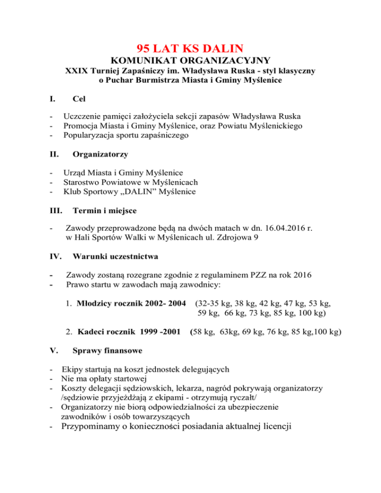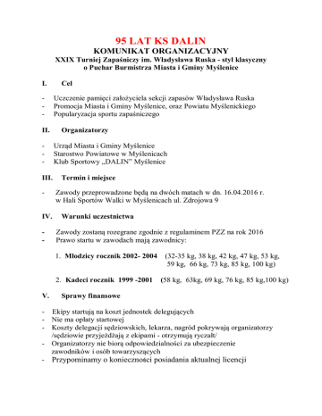 95 LAT KS DALIN KOMUNIKAT ORGANIZACYJNY XXIX Turniej Zapaśniczy im. Władysława Ruska - styl klasyczny o Puchar Burmistrza Miasta i Gminy Myślenice I. II. III. - IV. - Cel Uczczenie pamięci założyciela sekcji zapasów Władysława Ruska Promocja Miasta i Gminy Myślenice, oraz Powiatu Myślenickiego Popularyzacja sportu zapaśniczego Organizatorzy Urząd Miasta i Gminy Myślenice Starostwo Powiatowe w Myślenicach Klub Sportowy „DALIN” Myślenice Termin i miejsce Zawody przeprowadzone będą na dwóch matach w dn. 16.04.2016 r. w Hali Sportów Walki w Myślenicach ul. Zdrojowa 9 Warunki uczestnictwa Zawody zostaną rozegrane zgodnie z regulaminem PZZ na rok 2016 Prawo startu w zawodach mają zawodnicy: 1. Młodzicy rocznik 2002- 2004 2. Kadeci rocznik 1999 -2001 V. (32-35 kg, 38 kg, 42 kg, 47 kg, 53 kg, 59 kg, 66 kg, 73 kg, 85 kg, 100 kg) (58 kg, 63kg, 69 kg, 76 kg, 85 kg,100 kg) Sprawy finansowe - Ekipy startują na koszt jednostek delegujących - Nie ma opłaty startowej - Koszty delegacji sędziowskich, lekarza, nagród pokrywają organizatorzy /sędziowie przyjeżdżają z ekipami - otrzymują ryczałt/ - Organizatorzy nie biorą odpowiedzialności za ubezpieczenie zawodników i osób towarzyszących - Przypominamy o konieczności posiadania aktualnej licencji VI. Nagrody - Zawodnicy za miejsca I-III otrzymują medale i dyplomy, drużynowo dyplomy i puchary Organizatorzy przewidują dodatkowe nagrody rzeczowe - VII. Program zawodów: 16.04 – sobota do 9.00 – przyjazd ekip (Hala Sportowa - ul Zdrojowa 9) 9.00 - 10.00 – waga zawodników i weryfikacja 10.00 - 11.00 - odprawa sędziów i trenerów, przegląd lekarski, zestawienie walczących zawodników (krzyżówki) 11.00 - uroczyste otwarcie zawodów 11.15 walki eliminacyjne, półfinałowe i finałowe Po zakończeniu walk finałowych dekoracja i wręczenie nagród . VIII. Obsada sędziowska - Sędzia Główny - Włodzimierz Koriakowski Kierownik Listy - Andrzej Baran, Tadeusz Kuśmierczyk, Sędziowie: Andrzej Tomaszewski, Piotr Kaleta, Marek Horabik, Robert Proszkowiec, IX. Różne - . Istnieje możliwość rezerwacji noclegów w cenie 40 zł, oraz obiadów z tygodniowym wyprzedzeniem Prosimy o potwierdzenie udziału w zawodach z podaniem ilości startujących zawodników do dnia 10.04.2016 r. tel. 503 095 395, lub e-mail: [email protected] Patronat medialny: Gazeta Myślenicka, Miasto-Info Myślenice, Myślenice iTV –Telewizja Powiatowa Otrzymują: - PZZ Warszawa ŚZZ – Katowice Zaproszone kluby Gazeta Myślenicka Miasto-Info Myślenice Myślenice iTV –Telewizja Powiatowa