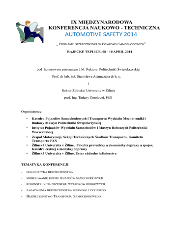 IX MIĘDZYNARODOWA KONFERENCJA NAUKOWO - TECHNICZNA AUTOMOTIVE SAFETY 2014 „ PROBLEMY BEZPIECZEŃSTWA W POJAZDACH SAMOCHODOWYCH” RAJECKE TEPLICE, 08 - 10 APRIL 2014 pod honorowym patronatem J.M. Rektora Politechniki Świętokrzyskiej Prof. dr hab. inż. Stanisława Adamczaka dr h. c. i Rektor Žilinskej Univerzity w Žilinie prof. Ing. Tatiany Čorejovej, PhD Organizatorzy: • • • • • Katedra Pojazdów Samochodowych i Transportu Wydziału Mechatroniki i Budowy Maszyn Politechniki Świętokrzyskiej Instytut Pojazdów Wydziału Samochodów i Maszyn Roboczych Politechniki Warszawskiej Zespół Motoryzacji, Sekcji Technicznych Środków Transportu, Komitetu Transportu PAN Žilinská Univerzita v Žiline, Fakulta prevádzky a ekonomiky dopravy a spojov, Katedra cestnej a mestskej doprawy Žilinská Univerzita v Žiline, Ústav súdneho inžinierstva TEMATYKA KONFERENCJI - DIAGNOSTYKA BEZPIECZEŃSTWA - MODELOWANIE RUCHU POJAZDÓW SAMOCHODOWYCH - REKONSTRUKCJA PRZEBIEGU WYPADKÓW DROGOWYCH - ZAGADNIENIA BEZPIECZEŃSTWA BIERNEGO I CZYNNEGO - BEZPIECZEŃSTWO TRANSPORTU SAMOCHODOWEGO Komitet Naukowy Przewodniczący: dr hab. inż. Tomasz L. Stańczyk, prof. PŚk (Politechnika Świętokrzyska, PL) Wiceprzewodniczący prof. dr hab. inż. Jerzy Wicher (Politechnika Warszawska) dr inż. Mirosław Gidlewski (Uniwersytet Technologiczno –Humanistyczny Radom) prof. dr hab. inż. Witold Grzegożek (Politechnika Krakowska) prof. Ing. Gustáv Kasanický (University of Žilina, SK) prof. Ing. Anna Križanová, CSc. (University of Žilina, SK) prof. Ing. Štefan Lišák, CSc (University of Žilina, SK) prof. dr hab. inż. Zbigniew Lozia (Politechnika Warszawska) prof. dr hab. inż. Sławomir Luft (Uniwersytet Technologiczno – Humanistyczny Radom) prof. dr hab. inż. Zbigniew Pawelski (Politechnika Łódzka) prof. dr hab. inż. Leon Prochowski (WAT) dr hab. inż. Andrzej Reński prof. PW (Politechnika Warszawska) prof. dr hab. inż. Kazimierz Romaniszyn (Akademia Technologiczno–Humanistyczna Bielsko–Biała) prof. dr hab. inż. Bolesław Stolarski (Politechnika Krakowska) dr hab. inż. Józef Struski prof. PK (Politechnika Krakowska) prof. dr hab. inż. Cezary Szczepaniak (Politechnika Łódzka) dr hab. inż. Andrzej Szosland prof. PŁ (Politechnika Łódzka) prof. dr hab. inż. Piotr Tarkowski (Politechnika Lubelska) dr inż. Jan Unarski (Instytut Ekspertyz Sądowych Kraków) Komitet Organizacyjny Przewodniczący: dr inż. Rafał Jurecki (Politechnika Świętokrzyska, PL) Sekretarz: dr inż. Marek Jaśkiewicz (Politechnika Świętokrzyska. PL) Członkowie: dr inż. Piotr Fundowicz (Politechnika Warszawska, PL) Ing. Marián Gogola PhD (University of Žilina, SK Ing. Marcela Hrubá (University of Žilina, Sk) Ing. Józef Pal’o PhD (University of Žilina, SK) Dr inż. Andrzej Zuska (Politechnika Świętokrzyska, SK) Obszerne streszczenia zgłoszonych artykułów zostały publikowane w Materiałach Konferencyjnych Wydanych przez Politechnikę Świętokrzyską PL ISBN 978-83-63792-21-3. W wyniku oceny recenzentów po konferencji zarekomendowano wybrane artykuły do czasopism: Autobusy, Diagnostyka, Archiwum Motoryzacji, Transport and Communication Słowacja), Zeszyty Naukowe Instytutu Pojazdów, Znalectwo (Słowacja). Uczestnicy Uczelnie wyższe: Akademia Morska w Szczecinie Akademia Techniczno Humanistyczna Bielsko - Biała Politechnika Krakowska Politechnika Lubelska Politechnika Łódzka Politechnika Radomska Politechnika Śląska Politechnika Świętokrzyska Politechnika Warszawska Politechnika Wrocławska Szkoła Główna Służby Pożarniczej Warszawa University of Zilina Wojskowa Akademia Techniczna WSEJ Lublin Jednostki Badawcze Instytut Ekspertyz Sądowych Kraków Przemysłowy Instytut Motoryzacji Instytut Transportu Samochodowego Wojskowy Instytut Techniki Pancernej i Samochodowej Firmy Cybid sp.j Globtrak Polska Sp.z o.o. Kistler Germany AC-Cars, Gorzów Wlk. Autoserwis Oświęcim Wojewódzki Ośrodek Ruchu Drogowego Piła PNTTE Warszawa EC Engineering EC Test Systems V-tech Dynamometers TS- WIND R&S WIND PZMot IMC Messsysteme GmbH, Germany IX MIĘDZYNARODOWA KONFERENCJA NAUKOWO - TECHNICZNA AUTOMOTIVE SAFETY 2014 „ PROBLEMY BEZPIECZEŃSTWA W POJAZDACH SAMOCHODOWYCH” RAJECKE TEPLICE, 08 - 10 APRIL 2014 SPIS REFERATÓW - INDEX OF PAPERS Adamkiewicz Andrzej Badania możliwości przedłużania okresów międzyobsługowych w utrzymaniu elementów układu energetycznego statku typu Ro-Ro metodą ekspercką Ambrozik Andrzej, Ambrozik Tomasz, Kurczyński Dariusz, Łagowski Piotr Fuel impact on the response of AD3.152 UR engine Ambrozik Andrzej, Ambrozik Tomasz, Kurczyński Dariusz, Łagowski Piotr Wpływ kąta wyprzedzenia wtrysku paliwa na opóźnienie samozapłonu i elastyczność silnika AD3.152 UR Ambrozik Andrzej, Ambrozik Tomasz, Kurczyński Dariusz, Łagowski Piotr Ocena porównawcza elastyczności silników ZS Biłobran Jacek, Jaśkiewicz Marek, Sobolewski Tomasz, Stańczyk Tomasz L. Identyfikacja właściwości sprężystych i tłumiących fotela mikrobusu Caban Jacek, Droździel Paweł, Barta Dalibor, Liščák Štefan O systemach monitorujących ciśnienie w oponach pojazdów Chaba Rafał, Jurecki Rafał Nowoczesne narzędzie do zarządzania flotą pojazdów w firmie pozwalające podnosić ekonomię jazdy oraz bezpieczeństwo kierowców Działak Paulina, Rusiński Eugeniusz, Ptak Mariusz, Karliński Jacek Influence of the geometry of the vehicle front on the pedestrian injuries Fundowicz Piotr, Sar Hubert Parametry bezwładnościowe pojazdów typu van Gidlewski Mirosław, Jemioł Leszek Badanie zderzeń bocznych samochodów. Prędkości samochodów po zderzeniu Gogola Marián The microscopic traffic modelling Grzegożek Witold, Weigel-Milleret Krzysztof Analiza możliwości wykorzystania badań stanowiskowych do oceny stabilności Grzesiak Jerzy, Stryjek Piotr, Włodarczyk Paweł Wpływ zmiany rozkładu ciśnienia pomiędzy kołami przedniej i tylnej osi na kierowalność poj