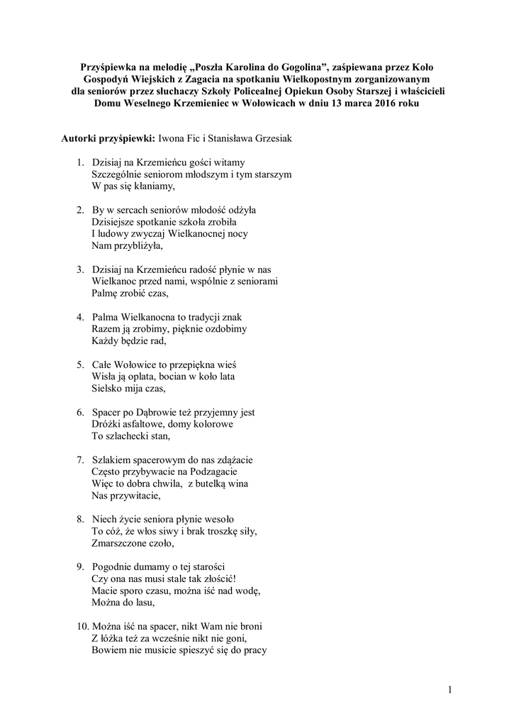 Przyśpiewka na melodię „Poszła Karolina do Gogolina”, zaśpiewana przez Koło Gospodyń Wiejskich z Zagacia na spotkaniu Wielkopostnym zorganizowanym dla seniorów przez słuchaczy Szkoły Policealnej Opiekun Osoby Starszej i właścicieli Domu Weselnego Krzemieniec w Wołowicach w dniu 13 marca 2016 roku Autorki przyśpiewki: Iwona Fic i Stanisława Grzesiak 1. Dzisiaj na Krzemieńcu gości witamy Szczególnie seniorom młodszym i tym starszym W pas się kłaniamy, 2. By w sercach seniorów młodość odżyła Dzisiejsze spotkanie szkoła zrobiła I ludowy zwyczaj Wielkanocnej nocy Nam przybliżyła, 3. Dzisiaj na Krzemieńcu radość płynie w nas Wielkanoc przed nami, wspólnie z seniorami Palmę zrobić czas, 4. Palma Wielkanocna to tradycji znak Razem ją zrobimy, pięknie ozdobimy Każdy będzie rad, 5. Całe Wołowice to przepiękna wieś Wisła ją oplata, bocian w koło lata Sielsko mija czas, 6. Spacer po Dąbrowie też przyjemny jest Dróżki asfaltowe, domy kolorowe To szlachecki stan, 7. Szlakiem spacerowym do nas zdążacie Często przybywacie na Podzagacie Więc to dobra chwila, z butelką wina Nas przywitacie, 8. Niech życie seniora płynie wesoło To cóż, że włos siwy i brak troszkę siły, Zmarszczone czoło, 9. Pogodnie dumamy o tej starości Czy ona nas musi stale tak złościć! Macie sporo czasu, można iść nad wodę, Można do lasu, 10. Można iść na spacer, nikt Wam nie broni Z łóżka też za wcześnie nikt nie goni, Bowiem nie musicie spieszyć się do pracy 1 Tak jak rodacy, 11. Co prawda już wigor z wolna przekwita, Lecz po co ci wigor u emeryta Podwyżki nie prosisz a należną gażę Poczta przynosi, 12. Spokojnie popatrzcie jak się świat zmienia Gdyż wiek Wam dodaje mądrość spojrzenia Więc wiwat starości, w tym jest mądrość cała BY STAROŚĆ TRWAŁA!!! 13. Za gościnę dzisiaj Wam dziękujemy I mamy nadzieję, że naszym śpiewaniem Was nie nudzimy! 14. Święta Wielkanocne nam się zbliżają Zagacianki wszystkim życzenia świąteczne z serca składają, 15. Życzymy wesołego Alleluja Wiary i radości, nadziei, miłości Bo zmartwychwstał Pan 2