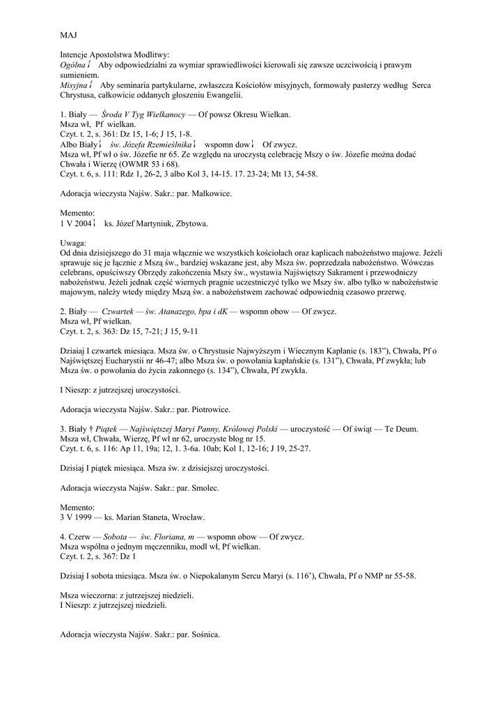 MAJ Intencje Apostolstwa Modlitwy: Ogólna Aby odpowiedzialni za wymiar sprawiedliwości kierowali się zawsze uczciwością i prawym sumieniem. Misyjna Aby seminaria partykularne, zwłaszcza Kościołów misyjnych, formowały pasterzy według Serca Chrystusa, całkowicie oddanych głoszeniu Ewangelii. 1. Biały — Środa V Tyg Wielkanocy — Of powsz Okresu Wielkan. Msza wł, Pf wielkan. Czyt. t. 2, s. 361: Dz 15, 1-6; J 15, 1-8. Albo Biały św. Józefa Rzemieślnika wspomn dow Of zwycz. Msza wł, Pf wł o św. Józefie nr 65. Ze względu na uroczystą celebrację Mszy o św. Józefie można dodać Chwała i Wierzę (OWMR 53 i 68). Czyt. t. 6, s. 111: Rdz 1, 26-2, 3 albo Kol 3, 14-15. 17. 23-24; Mt 13, 54-58. Adoracja wieczysta Najśw. Sakr.: par. Małkowice. Memento: 1 V 2004 ks. Józef Martyniuk, Zbytowa. Uwaga: Od dnia dzisiejszego do 31 maja włącznie we wszystkich kościołach oraz kaplicach nabożeństwo majowe. Jeżeli sprawuje się je łącznie z Mszą św., bardziej wskazane jest, aby Msza św. poprzedzała nabożeństwo. Wówczas celebrans, opuściwszy Obrzędy zakończenia Mszy św., wystawia Najświętszy Sakrament i przewodniczy nabożeństwu. Jeżeli jednak część wiernych pragnie uczestniczyć tylko we Mszy św. albo tylko w nabożeństwie majowym, należy wtedy między Mszą św. a nabożeństwem zachować odpowiednią czasowo przerwę. 2. Biały — Czwartek — św. Atanazego, bpa i dK — wspomn obow — Of zwycz. Msza wł, Pf wielkan. Czyt. t. 2, s. 363: Dz 15, 7-21; J 15, 9-11 Dziaiaj I czwartek miesiąca. Msza św. o Chrystusie Najwyższym i Wiecznym Kapłanie (s. 183”), Chwała, Pf o Najświętszej Eucharystii nr 46-47; albo Msza św. o powołania kapłańskie (s. 131”), Chwała, Pf zwykła; lub Msza św. o powołania do życia zakonnego (s. 134”), Chwała, Pf zwykła. I Nieszp: z jutrzejszej uroczystości. Adoracja wieczysta Najśw. Sakr.: par. Piotrowice. 3. Biały † Piątek — Najświętszej Maryi Panny, Królowej Polski — uroczystość — Of świąt — Te Deum. Msza wł, Chwała, Wierzę, Pf wł nr 62, uroczyste błog nr 15. Czyt. t. 6, s. 116: Ap 11, 19a; 12, 1. 3-6a. 10ab; Kol 1, 12-16; J 19, 25-27. Dzisiaj I piątek miesiąca. Msza św. z dzisiejszej uroczystości. Adoracja wieczysta Najśw. Sakr.: par. Smolec. Memento: 3 V 1999 — ks. Marian Staneta, Wrocław. 4. Czerw — Sobota — św. Floriana, m — wspomn obow — Of zwycz. Msza wspólna o jednym męczenniku, modl wł, Pf wielkan. Czyt. t. 2, s. 367: Dz 1 Dzisiaj I sobota miesiąca. Msza św. o Niepokalanym Sercu Maryi (s. 116’), Chwała, Pf o NMP nr 55-58. Msza wieczorna: z jutrzejszej niedzieli. I Nieszp: z jutrzejszej niedzieli. Adoracja wieczysta Najśw. Sakr.: par. Sośnica. Memento: 4 V 1989 — ks. Władysław Chmielewski, Bierutów. 4 V 1998 — ks. Jan Winiarski, Wrocław. 4 V 2002 ks Stanisław Irek, Pobiel. 4 V 2002 ks. Bronisław Owczarz, Wrocław. Ogłoszenia: 1. Od poniedziałku do środy po 6. Niedzieli Wielkanocy przypadają Dni Modlitw o urodzaje i o błogosławieństwo dla pracy ludzkiej. Z racji duszpasterskich zaleca się urządzać każdego dnia procesję błagalną (tekst i wskazania zob. Obrzędy błogosławieństw, t. II, nn. 1354-1392), a po niej sprawować Mszę św. wg następujących formularzy w dniu pierwszym „Msza w okresie zasiewów” (s. 157”), w drugim „Msza o uświęcenie pracy ludzkiej” (s. 155”), w trzecim „Msza za głodujących” (s. 160”). Jeżeli nie można zorganizować procesji, należy odprawić modły błagalne po Mszy św. 2. W środę 8 V uroczystość św. Stanisława, bpa i m, Głównego Patrona Polski. 3. W przyszłą niedzielę uroczystość Wniebowstąpienia Pańskiego. 5. Biały †† VI NIEDZIELA WIELKANOCNA Psałt II tyg Of niedz Okresu Wielkan Te Deum. ** Msza wł, Chwała, Wierzę, Pf wielkan, w ME 1-3 wspomnienie tajemnicy dnia, uroczyste błog nr 7. Czyt. t. 2, s. 376: Dz 15, 1-2. 22-29; Ap 21, 10-14. 22-23; J 14, 23-29. Adoracja wieczysta Najśw. Sakr.: par. Świdnica Polska. 6. Czerw † Poniedziałek — Świętych Apostołów Filipa i Jakuba — święto — Of półświąt wł — Te Deum. Msza wł, Chwała, Pf o Apostołach nr 67-68, uroczyste błog nr 18. Czyt. t. 6, s. 122: 1 Kor 15, 1-8; J 14, 6-14. Adoracja wieczysta Najśw. Sakr.: par. Wawrzeńczyce. Memento: 6 V 1980 — ks. Wacław Jabłoński, Wrocław. 6 V 2003 — ks. Stanisław Śmiałek, Breisvig, RFN. 7. Biały Wtorek VI Tyg Wielkanocy Of powsz Okresu Wielkan. Msza wł, Pf wielkan. Czyt. t. 2, s. 381: Dz 16, 22-34; J 16, 5-11. I Nieszp z jutrzejszej uroczystości. Adoracja wieczysta Najśw. Sakr.: par. Żmigród. Memento: 7 V 1992 — ks. Bolesław Seleta, Strzelce. 7 V 2012 — ks. Andrzej Kubiszyn, 8. Czerw † Środa św. Stanisława bpa i m, Głównego Patrona Polski — uroczystość — Of świąt — Te Deum. Msza wł, Chwała, Wierzę, Pf wł nr 76, uroczyste błog nr 23 albo własna modlitwa nad ludem. Czyt. t. 6, s. 126: Dz 20, 17–18a. 28–32. 36; Rz 8, 31b–39; J 10, 11–16. Adoracja wieczysta Najśw. Sakr.: par. Rościsławice. Memento: 8 V 2001 ks. Józef Kijak, Jelcz-Laskowice. 8 V 2011 — ks. Jan Czapliński, Wrocław. 9. Biały Czwartek VI Tyg Wielkanocy Msza wł, Pf wielkan. Czyt. t. 2, s. 393: Dz 18, 1-8; J 16, 16-20. Of powsz Okresu Wielkan. Adoracja wieczysta Najśw. Sakr.: par. Nasławice. Memento: 9 V 2012 – ks. Kazimierz Błaszczyk, Wrocław. 10. Biały — Piątek VI Tyg Wielkanocy — Of powsz Okresu Wielkan. Msza wł, Pf wielkan. Czyt. t. 2, s. 395: Dz 18, 9-18; J 16, 20-23a. Adoracja wieczysta Najśw. Sakr.: par. Sobótka św. Jakuba. 11. Biały Sobota VI Tyg Wielkanocy Of powsz Okresu Wielkan. Msza w, Pf wielkan. Czyt. t. 2, s. 398: Dz 18, 23-28; J 16, 23b-28. Adoracja wieczysta Najśw. Sakr.: par. Wierzbice. Memento: 11 V 1976 — ks. inf. Karol Milik, Gorzów Wielkopolski. 11 V 1980 — ks. Józef Lachowski, Namysłów. Msza wieczorna: z jutrzejszej niedzieli. I Nieszp: z jutrzejszej niedzieli. Uwagi
