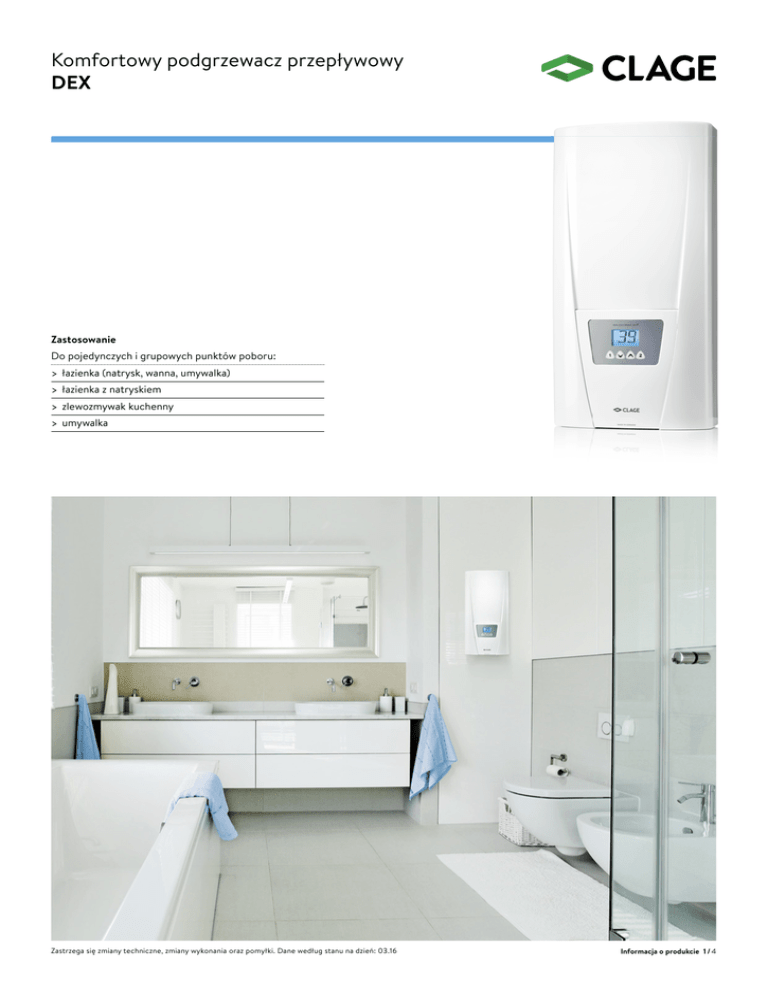 Komfortowy podgrzewacz przepływowy DEX Zastosowanie Do pojedynczych i grupowych punktów poboru: > łazienka (natrysk, wanna, umywalka) > łazienka z natryskiem > zlewozmywak kuchenny > umywalka Zastrzega się zmiany techniczne, zmiany wykonania oraz pomyłki. Dane według stanu na dzień: 03.16 Informacja o produkcie 1 / 4 Komfortowy podgrzewacz przepływowy DEX Pytania dotyczące produktu: +48 61 8499408 Klasa efektywności energetycznej A DEX (z Multiptle Power System: ustawiany na 18, 21, 24 lub 27 kW) Nr artykułu: 3200-34226 Konstrukcja: ciśnieniowa Dopuszczalne ciśnienie znamionowe [MPa (bar)]: 1 (10) Przyłącza wody (śrubowe): G ½" Wybór temperatur [°C]: 20 do 60 Wydajność ciepłej wody przy ∆t = 28 K 1) 2) [l/min]: 9,2| 10,7| 12,3| 13,8 Przepływ załączający / max przepływ [l/min]: 2,5 / 8,0 3) Moc znamionowa [kW]: 18| 21| 24| 27 Napięcie [3~ / PE 400 V AC]: stałe przyłącze Prąd znamionowy [A]: 26| 30| 35| 39 Wymagany przekrój przewodów [mm2]: 4,0| 4,0| 6,0 4)| 6,0 IES® grzałka nieosłonięta: Współpraca ze Smart Control: (opcjonalnie) Zdalne sterowanie radiowe: (opcjonalnie) Współpraca z kolektorem, do dogrzewania wody(temp. na wlocie ≤ 70 C): / IP 25 Certyfikat VDE / stopień ochrony: Specyficzna rezystywność wody przy 15 °C [Ωcm] ≥ : 1100 Pojemność znamionowa [litry]: 0,4 Waga (stan napełniony) [kg]: ca. 3,7 Wymiary (wys. × szer. × gł.) [cm]: 46,6 × 23,1 × 9,7 1) Wzrost temperatury np. z 12°C do 40°C można przejąć przekrój przewodów 4mm2 2) Woda zmieszana 3) Ilość przepływu wody ograniczona do optymalnego podniesienia temperatury Opis 4) Wymiana podgrzewacza 21kW/380V: Komfortowy panel sterowania z wyświetlaczem LCD >> regulowany elektronicznie komfortowy przepływowy podgrzewacz wody >> duży podświetlany z wyświetlacz LCD do wskazań temperatury >> dwa przyciski do programowania indywidualnych stałych wartości >> dokładna co do stopnia temperatura w zakresie 20°C do 60°C dzięki TWIN TEMPERATURE Control TTC® Przycisk programowania 1 Przycisk programowania 2 >> atrakcyjne wzornictwo i bardzo płaska budowa >> system grzałki nieosłoniętej IES® odpowiada za dłuższą żywotność, mniejsze zwapnienie oraz jest efektywny i łatwy w serwisowaniu >> elektroniczny system zabezpieczeń z rozpoznawaniem pęcherzyków powietrza, wyłącznikiem termicznym i ciśnieniowym >> Multiple Power System MPS® ustawia maksymalny pobór mocy urządzenia podczas instalacji na 18, 21, 24 lub 27 kW >> bezproblemowy montaż dzięki swobodnej przestrzeni montażowej i różnym możliwościom przyłącza Strzałki w górę i w dół Przyciskowy panel obsługi z dużym wyświetlaczem LCD do dokładnego co do stopnia nastawiania temperatury w zakresie 20°C do 60°C Dwa przyciski programowania indywidualnych wartości, aktywacja ograniczenia temperatury jak i odpytywanie wskaźników pracy i zakłóceń >> zdalne sterowanie radiowe dostępne jako opcja >> może być sterowany przez iPad* (od iOS 5) – konieczny jest w tym wypadku moduł nadawczo-odbiorczy FXE, CLAGE Home Server i App »Smart Controle« >> możliwa współpraca z kolektorem (temperatura na wlocie ≤ 70°C) *) Apple, logo Apple, iPad i iOS są markami zastrzeżonymi przez Apple Inc. Zastrzega się zmiany techniczne, zmiany wykonania oraz pomyłki. Dane według stanu na dzień: 03.16 Informacja o produkcie 2 / 4 Komfortowy podgrzewacz przepływowy DEX Pytania dotyczące produktu: +48 61 8499408 Przykładowa instalacja z dwoma punktami poboru. wymiary w mm Podczas instalacji należy przestrzegać instrukcji montażu i użytkowania. 231 170 50 385 329 przyłącze elektr. G ½" głębokość urządzenia 97 550 – 650 alternatywna instalacja dla krótszych kanałów wodnych: dolna krawędź urządzenia do podłoża ok. 1250 górna krawędź umywalki ok. 850 – 950 100 górna krawędź kabiny natryskowej ok. 1950 56 466 419 363 65 alternatywne wejście przewodu zalecany odstęp do podłoża 100 Zastrzega się zmiany techniczne, zmiany wykonania oraz pomyłki. Dane według stanu na dzień: 03.16 Szkic instalacji 3 / 4 Komfortowy podgrzewacz przepływowy DEX Akcesoria FX (opcjonalnie) Zdalne sterowanie radiowe umożliwia wygodne ustawianie temperatury na podgrzewaczu z odległości ok. 10m wewnątrz budynku dodatkowo oprócz obsługi na urządzeniu. Pewne, dwukierunkowa radiowa transmisja, wybór temperatur za pomocą dwóch przycisków w zakresie 20°C do 60°C plus dwa przyciski stałych wartości oraz wyświetlacz LCD, magnetyczny uchwyt ścienny i baterie zawarte są w zakresie dostawy. IP 20. Wymiary (wys. × szer. × gł.): 5,8 × 12,5 × 1,9 cm. FX: nr art. 2400-26050 Rama montażowa RDX dla większej przestrzeni (opcjonalnie) W razie potrzeby jako dodatek można zastosować ramę montażową RDX, dzięki której przyłącze prądu można umieścić w dowolnej pozycji za urządzeniem. > z okablowaniem elektrycznym i przedłużeniem do przyłączy wody > zastosowanie w trudnych warunkach montażowych, np. wymiana podgrzewacza na nowy z innym rozstawem przyłączy > wyrównuje uskoki na kafelkach lub nierówności ściany > montaż tylko przez fachowca RDX: nr art. 3200-34100 Zestaw rurek UDX, akcesoria montażowe (opcjonalnie) Zestaw rurek do instalacji podblatowej z natynkowym przyłączem wody G ⅜” od góry (wymagana rama montażowa RDX) UDX: nr art. 3200-34110 Zestaw rurek VDX, akcesoria montażowe (opcjonalnie) Zestaw rurek do montażu w miejsce innego urządzenia lub do zamiany przyłączy wody podczas wymiany podgrzewaczy gazowych (wymagana rama montażowa RDX) VDX: nr art. 3200-34120 CLAGE Polska Spółka z o.o. Ul. Wichrowa 4 60-449 Poznań Tel +48 61 84 99 408 Fax +49 61 84 99 409 [email protected] > www.clage.pl Akcesoria 4 / 4