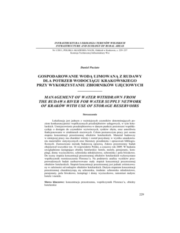 Ocena stopnia koncentracji... INFRASTRUKTURA I EKOLOGIA TERENÓW WIEJSKICH INFRASTRUCTURE AND ECOLOGY OF RURAL AREAS Nr 1/2011, POLSKA AKADEMIA NAUK, Oddział w Krakowie, s. 229–237 Komisja Technicznej Infrastruktury Wsi Daniel Puciato GOSPODAROWANIE WODĄ UJMOWANĄ Z RUDAWY DLA POTRZEB WODOCIĄGU KRAKOWSKIEGO PRZY WYKORZYSTANIU ZBIORNIKÓW UJĘCIOWYCH ____________ MANAGEMENT OF WATER WITHDRAWN FROM THE RUDAWA RIVER FOR WATER SUPPLY NETWORK OF KRAKÓW WITH USE OF STORAGE RESERVOIRS Streszczenie Lokalizacja jest jednym z ważniejszych czynników determinujących poziom konkurencyjności współczesnych przedsiębiorstw usługowych, w tym hotelarskich. Umiejscowienie przedsiębiorstwa w danym punkcie przestrzeni współdecyduje o dostępie do czynników wytwórczych, rynków zbytu, oraz umożliwia funkcjonowanie w strukturach sieciowych. Celem poznawczym pracy jest ocena stopnia koncentracji przestrzennej obiektów hotelarskich. Materiał badawczy w niniejszej pracy ma charakter wtórny i został pozyskany w wyniku unaukawiania materiałów statystycznych oraz literatury przedmiotu i opracowań bibliograficznych. Zastosowano metodę badawczą opisową. Zakres przestrzenny badań obejmował wszystkie tzn. 16 województw Polski, a czasowy rok 2009. W badaniu uwzględniono następujące obiekty hotelarskie: hotele, motele, pensjonaty, kempingi, domy wycieczkowe, schroniska młodzieżowe, schroniska i pola biwakowe. Do oceny stopnia koncentracji przestrzennej obiektów hotelarskich wykorzystano współczynnik rozmieszczenia Florence’a. Na podstawie analizy wyników przeprowadzonych badań zaobserwowano mały stopień koncentracji przestrzennej obiektów hotelarskich. Stopień koncentracji przestrzennej jest jednak zróżnicowany w zależności od rodzajów obiektów hotelarskich. Dużym stopniem koncentracji przestrzennej charakteryzują się schroniska, średnim: schroniska młodzieżowe, pensjonaty, pola biwakowe, kempingi i domy wycieczkowe, natomiast małym: hotele i motele. Słowa kluczowe: koncentracja przestrzenna, współczynnik Florence’a, obiekty hotelarskie 229 Daniel Puciato Summary Location is a major factor determining competitive level of today’s service providers, including hotels. Location of a company in a specific place is decisive with respect to access of production factors, markets and ensures functioning within network structures. The cognitive objective os the paper is to assess spatial concentration of hotel facilities. The research material used in this paper is secondary and has been acquired as a result of studies of statistics as well as literature of the subject and bibliographic studies. A descriptive method was applies which is one of induction research methods. The research covered all 16 provinces of Poland and the year of 2009. The study covered the following types of hotel facilities: hotels, motels, pensions, camping sites, hostels, youth hostels, overnight lodging facilities and campsites. Florence distribution index was applied to assess the spatial concentration of hotel facilities. The analysis of research results showed a low spatial concentration level of hotel facilities. The level of spatial concentration is differentiated depending on the type of hotel facilities. Overnight lodging facilities have a high spatial concentration level; middle spatial concentration level is characteristic for: youth hostels, pensions, camping sites, campsites and hostels while hotels and motels have low spatial concentration level. Key words: spatial concentration, Florence index, hotel facilities WSTĘP Lokalizacja przedsiębiorstwa usługowego, w tym również hotelarskiego, jest jednym z kluczowych czynników determinujących poziom jego konkurencyjności. Umiejscowienie przedsiębiorstwa w danym punkcie przestrzeni współdecyduje o dostępie do czynników wytwórczych, rynków zbytu, oraz umożliwia funkcjonowanie w strukturach sieciowych, np. poprzez tworzenie zgrupowań kooperacyjnych lub koncentracyjnych przez przedsiębiorstwa hotelowe. Lokalizacja przedsiębiorstwa wpływa także na możliwość korzystania z atrakcyjnych rozwiązań fiskalnych, organizacyjnych i prawnych, oraz na dostęp do środków finansowych o charakterze publicznym lub pomocowym, np. w ramach funduszy strukturalnych UE [Godlewska-Majkowska i Poniatowska-Jaksch 2009]. Według Budnera [2004, s. 22] lokalizacja działalności gospodarczej oznacza „umiejscowienie wielkości i rodzaju działalności gospodarczej, obiektu lub zespołu obiektów, w określonym obszarze”. W ramach pojęcia lokalizacji, wyróżnić można lokalizację ogólną i szczegółową. Lokalizacja ogólna utożsamiana jest z umiejscowieniem przedsiębiorstwa w regionie i w danej jednostce osadniczej, zaś lokalizacja szczegółowa dotyczy jego położenie na konkretnej działce ziemi [Godlewska 2001]. Biorąc pod uwagę kryterium swobody wyboru wyróżnić można natomiast lokalizację: zdeterminowaną, związaną i swobodną. Z lokalizacją zdeterminowaną (przymusową) mamy do czynienia wówczas, gdy wpływ pewnym czynników lokalizacyjnych jest rozstrzygający. W przypadku gdy czynniki lokalizacji nie przesądzają całkowicie wyboru, lecz bardzo go 230 Ocena stopnia koncentracji... ograniczają mamy do czynienia z lokalizacją związaną (zależną). Lokalizacja swobodna (niezwiązana) występuje natomiast wówczas, gdy wpływ czynników lokalizacyjnych jest niewielki [Miszczak 2007]. Biorąc pod uwagę problematykę artykułu przedmiotem jego rozważań będzie zatem lokalizacja ogólna (umiejscowienie przedsiębiorstwa hotelarskiego w regionie – województwie) oraz zdeterminowana (np. w przypadku hoteli uzdrowiskowych) lub związana (np. w przypadku hoteli miejskich). Wybór lokalizacji przedsiębiorstwa jest niezwykle ważnym procesem decyzyjnym, zdeterminowanym przez różnorodne uwarunkowania, które zdaniem Godlewskiej [2001] podzielić można na: zewnętrzne, gałęziowo-branżowe i wewnętrzne.