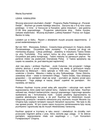 Maciej Szymański LEKKA KAWALERIA Wczoraj wieczorem słuchałem „Dwójki”. Programu Radia Polskiego pt. „Poranek Dwójki”. Słucham go prawie każdego wieczora. Zaczyna się o 6-ej rano czasu polskiego. U mnie - w Vancouver w Kanadzie gdzie mieszkam – jest godzina 21:00 dnia poprzedniego. Przyjemne zakończenie dnia. Dobra muzyka, ciekawe wiadomości. Wczoraj słuchałem „Lekkiej Kawalerii” Franza von Suppe. Bardzo to lubię. Leżałem już w łóżku. Razem z dźwiękami muzyki przyszły wspomnienia. Z przed siedemdziesięciu lat ! Był rok 1941. Warszawa, Żoliborz. Czwarta klasa gimnazjum im. Księcia Józefa Poniatowskiego. Oczywiście tajne „komplety”. To przecież już drugi rok niemieckiej okupacji. Lekcja polskiego. Jesteśmy w mieszkaniu Tadzia Dolato na ulicy Tucholskiej. Przy samym końcu tej ulicy, prawie na Marymoncie. Oczywiście jest pełna konspiracja. Tadzio mieszka na pierwszym piętrze. Na parterze mieści się posterunek Granatowej Policji. U Tadzia spotykamy się często na zasadzie, że „pod latarnią jest najciemniej”. Jest nas pięciu i profesor Kaufman. Jurek Cukanow, mój przyjaciel i kolega szkolny jeszcze z przed wojny. Uczyliśmy się wtedy w gimnazjum księży Marianów na Bielanach – które spłonęło w 1939 roku. Zdzich Kwieciński – uciekinier z Grodna. Mieszka z matką na ulicy Sułkowskiego. Ojciec Zdzicha, zawodowy oficer – siedzi w niemieckim Oflagu. Tadzio Dolato, nasz dzisiejszy gospodarz – nie pamiętam skąd się wziął – poznałem go dopiero przed paru miesiącami. Tego piątego w naszej „klasie” zupełnie nie pamiętam. Ani nazwiska, ani twarzy. Profesor Kaufman trzyma przed sobą plik zeszytów i odczytuje nam wyniki wypracowania, które zadał nam tydzień temu. Zadanie nie było łatwe. Kaufman usiłował nas, młodych barbarzyńców, nauczyć poprawnego i logicznego sposobu wysławiania się i formułowania myśli. Często pisaliśmy wypracowania na zupełnie abstrakcyjne tematy, a że prof. Kaufman był miłośnikiem muzyki klasycznej, przeżycia i wrażenia odnoszone przy słuchaniu muzyki Mozarta czy Chopina były częstymi tematami naszych literackich wyczynów. Nie była to dla nas sprawa prosta. W tym czasie nasze muzyczne zainteresowania były raczej prymitywne i ograniczały się do muzyki młodzieżowej i tanecznej. Kaufman spojrzał w trzymany w ręku zeszyt i oświadczył, że chciałby nam przeczytać fragment jednej z prac, która zwróciła jego uwagę. O ile dobrze pamiętam, wypracowanie miało coś wspólnego z „ 1-ym Koncertem Fortepianowym” Chopina. 1 Kaufman zaczął czytać : ... zaczarowany dźwiękami muzyki wolno podniósł głowę do góry, i lazur nieba odbił się w jego oczach błękitną czkawką . Ryknęliśmy wielkim śmiechem. Kaufman wolnym ruchem odłożył na stół czytany zeszyt i powiedział : Czytając to nie byłem pewien czy pan Dolato (Kaufman mówił do nas per Pan), usiłował zakpić z Chopina czy ze mnie. W obu wypadkach byłoby to postępowanie naganne, zasługujące na ostrą reprymendę, a może nawet na wyróżnienie pod postacią oceny niedostatecznej. Znajduję jednak w tym zdaniu wiele wyobraźni, która pozwala mi mieć nadzieję, że któregoś dnia pan Dolato zacznie mówić i pisać po polsku. Dla zachęty stawiam mu stopień bardzo dobry. Nic dziwnego, że Kaufman cieszył się nie tylko naszym szacunkiem ale i sympatią. Następnym tematem naszego „wypracowania” (tak to się nazywało), miały być rozważanie na temat „Lekkiej Kawalerii” Franza von Suppe w świetle osobistych doświadczeń z września 1939 roku. Słuchając wczoraj tętniącego rytmu „Lekkiej Kawalerii” płynącego do mnie z dalekiej Warszawy, wróciły do mnie wspomnienia z przed 70 lat. Profesor Kaufman na pewno nie żyje. Miał wtedy około 40 lat i wydawał nam się człowiekiem okrutnie starym. Jurek Cukanow został aresztowany przez Gestapo w 1942 roku. Po krótkim pobycie na Pawiaku, przewieziony został do obozu koncentracyjnego na Majdanku w Lublinie. Ślad po nim zaginął. Nadzieje, które pokładał w Tadziu profesor Kaufman nie miały się sprawdzić. Tadzio również zaginął bez śladu. Wedle niesprawdzonych informacji poległ w czasie Powstania Warszawskiego w 1944 roku, walcząc na barykadach Dolnego Żoliborza. Nie ma go jednak w ewidencji żołnierzy Powstania sporządzonej przez Muzeum Powstania Warszawskiego. Zdzich Kwieciński – plutonowy podchorąży „Kełojf” walczył w batalionie „Gozdawa” na Satrym Mieście. Spotkałem się z nim w pierwszych dniach września, kiedy wiedzieliśmy już na pewno, że nic z tego nie wyjdzie. Zapewne razem z innymi poszedł do niewoli niemieckiej. Jego nazwisko znalazłem w Powstańczych Biogramach – ale tylko nazwisko, brak dalszych informacji. Po prostu zaginął. Stara, znana melodia. Tętent koni, tryumfalny dźwięk trąb, szarża ułańska ... uśmiechnięta twarz profesora Kaufmana i twarze przyjaciół, których już nie ma . Teraz, kiedy piszę te słowa przypomniała mi się jeszcze jedna melodia. Piosenkę śpiewa Sława Przybylska : Gdzie są chłopcy z dawnych lat, Czas zatarł ślad, Kto wie czy było tak Czasami jednak – nawet po siedemdziesięciu latach – można sobie przypomnieć coś, czego nawet czas nie potrafi zatrzeć. 2 https://www.youtube.com/watch?v=MhWRmtsPCdM 3