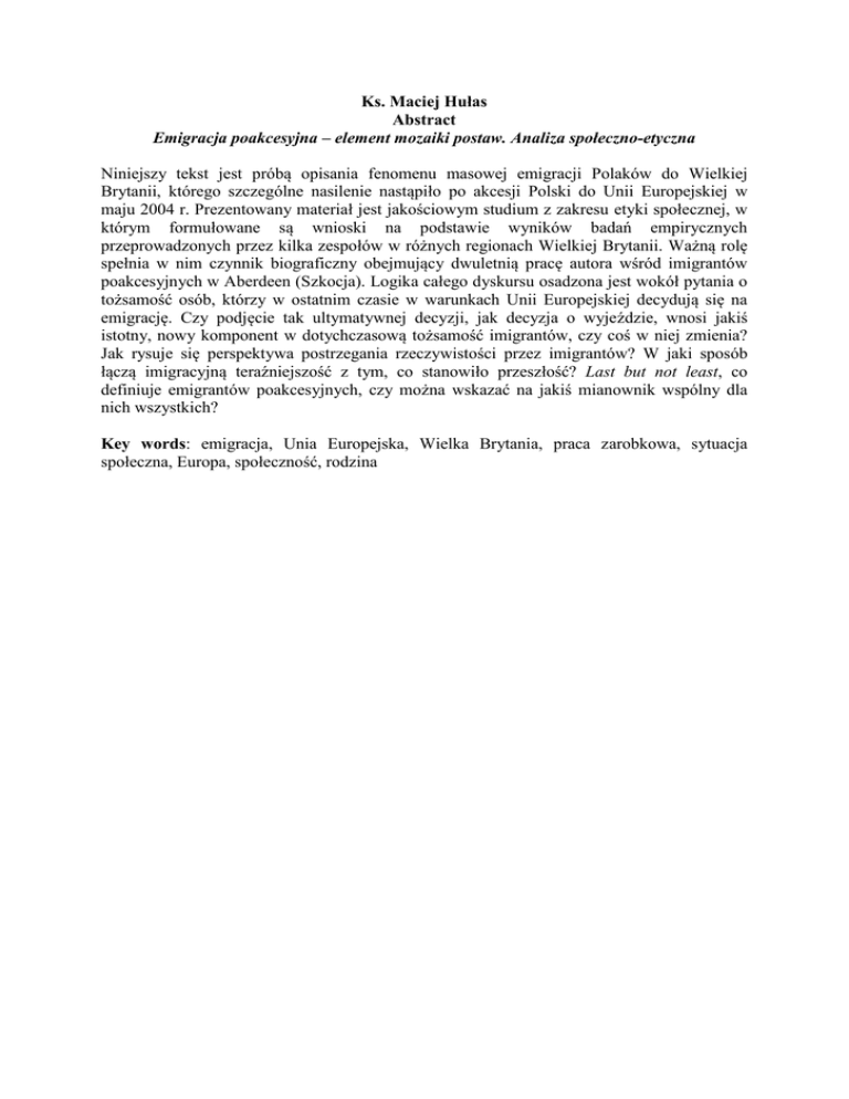 Ks. Maciej Hułas Abstract Emigracja poakcesyjna – element mozaiki