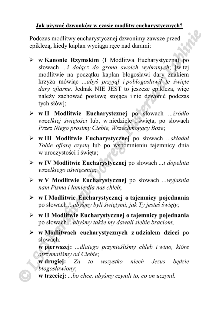 Jak uŜywać dzwonków w czasie modlitw eucharystycznych? Podczas modlitwy eucharystycznej dzwonimy zawsze przed epiklezą, kiedy kapłan wyciąga ręce nad darami: w Kanonie Rzymskim (I Modlitwa Eucharystyczna) po słowach ...i dołącz do grona swoich wybranych; [w tej modlitwie na początku kapłan błogosławi dary znakiem krzyŜa mówiąc ...abyś przyjął i pobłogosławił te święte dary ofiarne. Jednak NIE JEST to jeszcze epikleza, więc naleŜy zachować postawę stojącą i nie dzwonić podczas tych słów]; w II Modlitwie Eucharystcznej po słowach ...źródło wszelkiej świętości lub, w niedziele i święta, po słowach Przez Niego prosimy Ciebie, Wszechmogący BoŜe; w III Modlitwie Eucharystycznej po słowach ...składał Tobie ofiarę czystą lub po wspomnieniu tajemnicy dnia w uroczystości i święta; w IV Modlitwie Eucharystycznej po słowach ...i dopełnia wszelkiego uświęcenia; w V Modlitwie Eucharystycznej po słowach ...wyjaśnia nam Pisma i łamie dla nas chleb; w I Modlitwie Eucharystycznej o tajemnicy pojednania po słowach ...abyśmy byli świętymi, jak Ty jesteś święty; w II Modlitwie Eucharystycznej o tajemnicy pojednania po słowach ...abyśmy takŜe my dawali siebie braciom; w Modlitwach eucharystycznych z udziałem dzieci po słowach: w pierwszej: ...dlatego przynieśliśmy chleb i wino, które otrzymaliśmy od Ciebie; w drugiej: Za to wszystko niech Jezus będzie błogosławiony; w trzeciej: ...bo chce, abyśmy czynili to, co on uczynił.