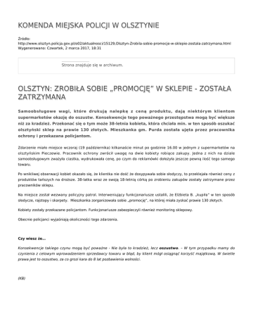 KOMENDA MIEJSKA POLICJI W OLSZTYNIE Źródło: http://www.olsztyn.policja.gov.pl/o02/aktualnosci/15129,Olsztyn-Zrobila-sobie-promocje-w-sklepie-zostala-zatrzymana.html Wygenerowano: Czwartek, 2 marca 2017, 18:31 Strona znajduje się w archiwum. OLSZTYN: ZROBIŁA SOBIE „PROMOCJĘ” W SKLEPIE - ZOSTAŁA ZATRZYMANA Samoobsługowe wagi, które drukują nalepkę z ceną produktu, dają niektórym klientom supermarketów okazję do oszustw. Konsekwencje tego poważnego przestępstwa mogą być większe niż za kradzież. Przekonać się o tym może 38-letnia kobieta, która chciała min. w ten sposób oszukać olsztyński sklep na prawie 130 złotych. Mieszkanka gm. Purda została ujęta przez pracownika ochrony i przekazana policjantom. Zdarzenie miało miejsce wczoraj (19 października) kilkanaście minut po godzinie 16.00 w jednym z supermarketów na olsztyńskim Pieczewie. Pracownik ochrony zwrócił uwagę na dwie kobiety robiące zakupy. Jedna z nich na dziale samoobsługowym zważyła ciastka, wydrukowała cenę, po czym do reklamówki dołożyła jeszcze pewną ilość tego samego towaru. Po wnikliwej obserwacji kobiet okazało się, że klientka nie dość że dosypywała sobie słodyczy, to przeklejała również ceny z produktów tańszych na droższe. 38-latka wraz ze swoją 18-letnią córką po zrobieniu zakupów zostały zatrzymane przez pracowników sklepu. Na miejsce został wezwany policyjny patrol. Interweniujący funkcjonariusze ustalili, że Elżbieta B. „kupiła” w ten sposób słodycze, rajstopy i skarpety. Mieszkanka zorganizowała sobie „promocję”, na której miała zyskać prawie 130 złotych. Kobiety zostały przekazane policjantom. Funkcjonariusze zabezpieczyli również monitoring sklepowy. Obecnie policjanci wyjaśniają okoliczności tego zdarzenia. Czy wiesz że… Konsekwencje takiego czynu mogą być poważne - Nie była to kradzież, lecz oszustwo. – W tym przypadku mamy do czynienia z celowym wprowadzeniem sprzedawcy towaru w błąd, by klient mógł osiągnąć korzyść majątkową. W świetle prawa jest to oszustwo, za co grozi kara do 8 lat pozbawienia wolności. (KB) Ocena: 0/5 (0) Tweetnij