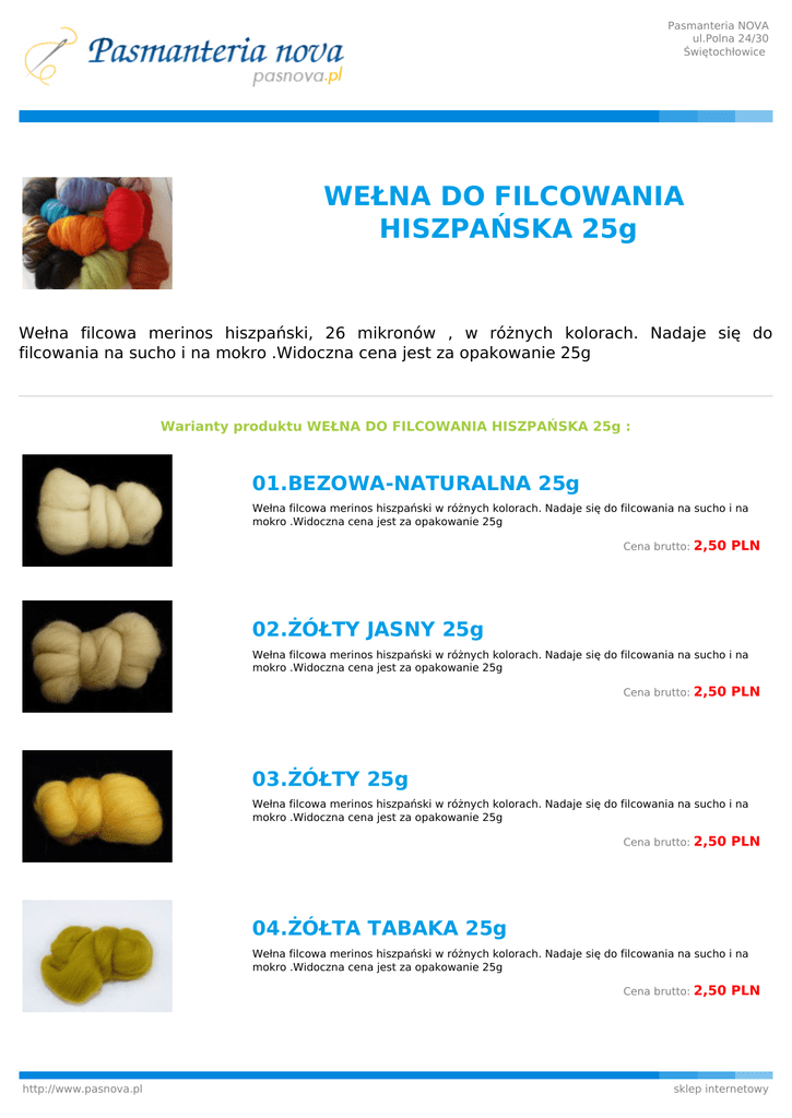 Pasmanteria NOVA ul.Polna 24/30 Świętochłowice WEŁNA DO FILCOWANIA HISZPAŃSKA 25g Wełna filcowa merinos hiszpański, 26 mikronów , w różnych kolorach. Nadaje się do filcowania na sucho i na mokro .Widoczna cena jest za opakowanie 25g Warianty produktu WEŁNA DO FILCOWANIA HISZPAŃSKA 25g : 01.BEZOWA-NATURALNA 25g Wełna filcowa merinos hiszpański w różnych kolorach. Nadaje się do filcowania na sucho i na mokro .Widoczna cena jest za opakowanie 25g Cena brutto: 2,50 PLN 02.ŻÓŁTY JASNY 25g Wełna filcowa merinos hiszpański w różnych kolorach. Nadaje się do filcowania na sucho i na mokro .Widoczna cena jest za opakowanie 25g Cena brutto: 2,50 PLN 03.ŻÓŁTY 25g Wełna filcowa merinos hiszpański w różnych kolorach. Nadaje się do filcowania na sucho i na mokro .Widoczna cena jest za opakowanie 25g Cena brutto: 2,50 PLN 04.ŻÓŁTA TABAKA 25g Wełna filcowa merinos hiszpański w różnych kolorach. Nadaje się do filcowania na sucho i na mokro .Widoczna cena jest za opakowanie 25g Cena brutto: http://www.pasnova.pl 2,50 PLN sklep internetowy Pasmanteria NOVA ul.Polna 24/30 Świętochłowice 05.SELEDYNOWA 25g Wełna filcowa merinos hiszpański w różnych kolorach. Nadaje się do filcowania na sucho i na mokro .Widoczna cena jest za opakowanie 25g Cena brutto: 2,50 PLN 06.ZIELEŃ CHOINKOWA 25g Wełna filcowa merinos hiszpański w różnych kolorach. Nadaje się do filcowania na sucho i na mokro .Widoczna cena jest za opakowanie 25g Cena brutto: 2,50 PLN 07.ZIELEŃ CIEMNA 25g Wełna filcowa merinos hiszpański w różnych kolorach. Nadaje się do filcowania na sucho i na mokro .Widoczna cena jest za opakowanie 25g Cena brutto: 2,50 PLN 08.FIOLET 25g Wełna filcowa merinos hiszpański w różnych kolorach. Nadaje się do filcowania na sucho i na mokro .Widoczna cena jest za opakowanie 25g Cena brutto: 2,50 PLN 09.BŁĘKIT JEANSOWY 25g Wełna filcowa merinos hiszpański w różnych kolorach. Nadaje się do filcowania na sucho i na mokro .Widoczna cena jest za opakowanie 25g Cena brutto: 2,50 PLN 10.CHABER 25g Wełna filcowa merinos hiszpański w różnych kolorach. Nadaje się do filcowania na sucho i na mokro .Widoczna cena jest za opakowanie 25g Cena brutto: http://www.pasnova.pl 2,50 PLN sklep internetowy Pasmanteria NOVA ul.Polna 24/30 Świętochłowice 11.GRANAT 25g Wełna filcowa merinos hiszpański w różnych kolorach. Nadaje się do filcowania na sucho i na mokro .Widoczna cena jest za opakowanie 25g Cena brutto: 2,50 PLN 13.TURKUSOWA 25g Wełna filcowa merinos hiszpański w różnych kolorach. Nadaje się do filcowania na sucho i na mokro .Widoczna cena jest za opakowanie 25g Cena brutto: 2,50 PLN 15.CIEMNY WRZOS 25g Wełna filcowa merinos hiszpański w różnych kolorach. Nadaje się do filcowania na sucho i na mokro .Widoczna cena jest za opakowanie 25g Cena brutto: 2,50 PLN 16.BURACZEK 25g Wełna filcowa merinos hiszpański w różnych kolorach. Nadaje się do filcowania na sucho i na mokro .Widoczna cena jest za opakowanie 25g Cena brutto: 2,50 PLN 17.CZERWONA CIEMNA 25g Wełna filcowa merinos hiszpański w różnych kolorach. Nadaje się do filcowania na sucho i na mokro .Widoczna cena jest za opakowanie 25g Cena brutto: 2,50 PLN 18.MALINA 25g Wełna filcowa merinos hiszpański w różnych kolorach. Nadaje się do filcowania na sucho i na mokro .Widoczna cena jest za opakowanie 25g Cena brutto: http://www.pasnova.pl 2,50 PLN sklep internetowy Pasmanteria NOVA ul.Polna 24/30 Świętochłowice 19.TERRA 25g Wełna filcowa merinos hiszpański w różnych kolorach. Nadaje się do filcowania na sucho i na mokro .Widoczna cena jest za opakowanie 25g Cena brutto: 2,50 PLN 20.POMARAŃCZOWA 25g Wełna filcowa merinos hiszpański w różnych kolorach. Nadaje się do filcowania na sucho i na mokro .Widoczna cena jest za opakowanie 25g Cena brutto: 2,50 PLN 21.RÓŻ JASNY 25g Wełna filcowa merinos hiszpański w różnych kolorach. Nadaje się do filcowania na sucho i na mokro .Widoczna cena jest za opakowanie 25g Cena brutto: 2,50 PLN 22.BAKŁAŻAN 25g Wełna filcowa merinos hiszpański w różnych kolorach. Nadaje się do filcowania na sucho i na mokro .Widoczna cena jest za opakowanie 25g Cena brutto: 2,50 PLN 23.BRĄZOWA CIEMNA 25g Wełna filcowa merinos hiszpański w różnych kolorach. Nadaje się do filcowania na sucho i na mokro .Widoczna cena jest za opakowanie 25g Cena brutto: 2,50 PLN 29.CZARNA 25g Wełna filcowa merinos hiszpański w różnych kolorach. Nadaje się do filcowania na sucho i na mokro .Widoczna cena jest za opakowanie 25g Cena brutto: http://www.pasnova.pl 2,50 PLN sklep internetowy Pasmanteria NOVA ul.Polna 24/30 Świętochłowice 30.BRĄZOWA-TOFI 25g Wełna filcowa merinos hiszpański w różnych kolorach. Nadaje się do filcowania na sucho i na mokro .Widoczna cena jest za opakowanie 25g Cena brutto: 2,50 PLN 33.BIAŁA-ECRU 25g Wełna filcowa merinos hiszpański w różnych kolorach. Nadaje się do filcowania na sucho i na mokro .Widoczna cena jest za opakowanie 25g Cena brutto: 2,50 PLN 34.WRZOSOWA 25g Wełna filcowa merinos hiszpański w różnych kolorach. Nadaje się do filcowania na sucho i na mokro .Widoczna cena jest za opakowanie 25g Cena brutto: 2,50 PLN 38.MIODOWA 25g Wełna filcowa merinos hiszpański w różnych kolorach. Nadaje się do filcowania na sucho i na mokro .Widoczna cena jest za opakowanie 25g Cena brutto: 2,50 PLN 39.JASNY BEŻ 25g Wełna filcowa merinos hiszpański w różnych kolorach. Nadaje się do filcowania na sucho i na mokro .Widoczna cena jest za opakowanie 25g Cena brutto: 2,50 PLN 40.AMARANTOWA 25g Wełna filcowa merinos hiszpański, 26 mikronów , w różnych kolorach. Nadaje się do filcowania na sucho i na mokro .Widoczna cena jest za opakowanie 25g Cena brutto: http://www.pasnova.pl 2,50 PLN sklep internetowy Pasmanteria NOVA ul.Polna 24/30 Świętochłowice 48.TURKUSOWA CIEMNA/MORSKI CIEMNY 25g Wełna filcowa merinos hiszpański, 26 mikronów , w różnych kolorach. Nadaje się do filcowania na sucho i
