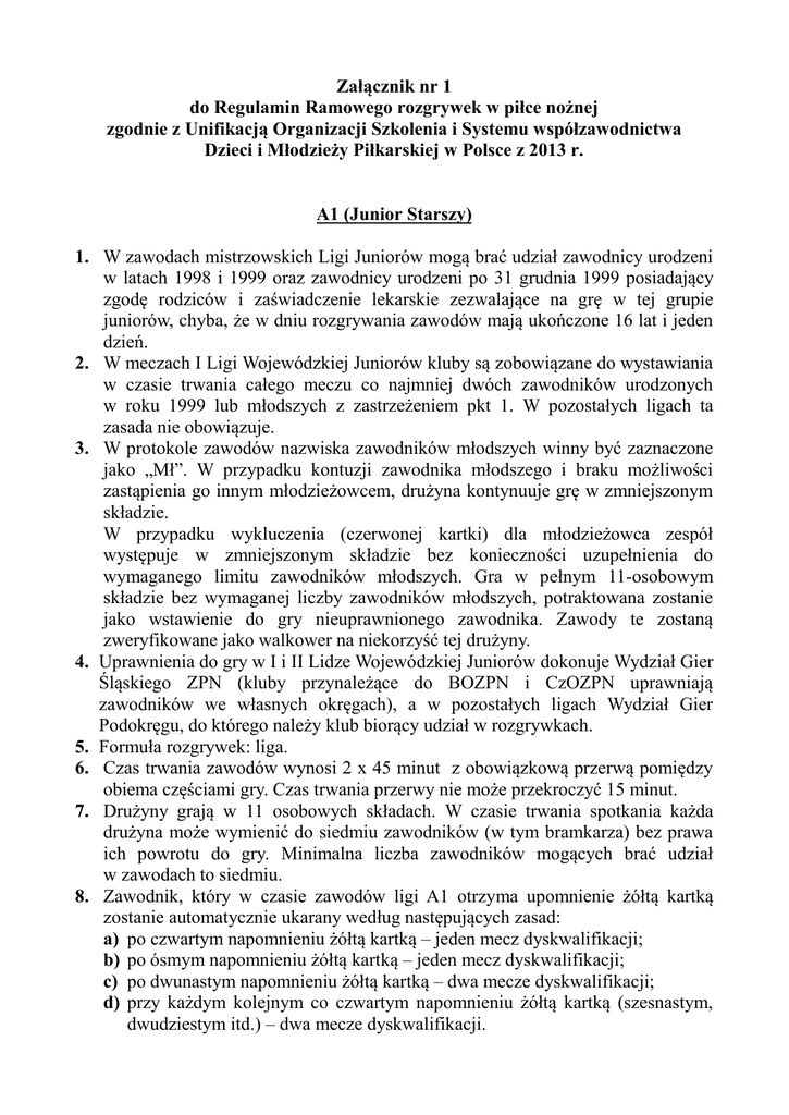 Załącznik nr 1 do Regulamin Ramowego rozgrywek w piłce nożnej zgodnie z Unifikacją Organizacji Szkolenia i Systemu współzawodnictwa Dzieci i Młodzieży Piłkarskiej w Polsce z 2013 r. A1 (Junior Starszy) 1. W zawodach mistrzowskich Ligi Juniorów mogą brać udział zawodnicy urodzeni w latach 1998 i 1999 oraz zawodnicy urodzeni po 31 grudnia 1999 posiadający zgodę rodziców i zaświadczenie lekarskie zezwalające na grę w tej grupie juniorów, chyba, że w dniu rozgrywania zawodów mają ukończone 16 lat i jeden dzień. 2. W meczach I Ligi Wojewódzkiej Juniorów kluby są zobowiązane do wystawiania w czasie trwania całego meczu co najmniej dwóch zawodników urodzonych w roku 1999 lub młodszych z zastrzeżeniem pkt 1. W pozostałych ligach ta zasada nie obowiązuje. 3. W protokole zawodów nazwiska zawodników młodszych winny być zaznaczone jako „Mł”. W przypadku kontuzji zawodnika młodszego i braku możliwości zastąpienia go innym młodzieżowcem, drużyna kontynuuje grę w zmniejszonym składzie. W przypadku wykluczenia (czerwonej kartki) dla młodzieżowca zespół występuje w zmniejszonym składzie bez konieczności uzupełnienia do wymaganego limitu zawodników młodszych. Gra w pełnym 11-osobowym składzie bez wymaganej liczby zawodników młodszych, potraktowana zostanie jako wstawienie do gry nieuprawnionego zawodnika. Zawody te zostaną zweryfikowane jako walkower na niekorzyść tej drużyny. 4. Uprawnienia do gry w I i II Lidze Wojewódzkiej Juniorów dokonuje Wydział Gier Śląskiego ZPN (kluby przynależące do BOZPN i CzOZPN uprawniają zawodników we własnych okręgach), a w pozostałych ligach Wydział Gier Podokręgu, do którego należy klub biorący udział w rozgrywkach. 5. Formuła rozgrywek: liga. 6. Czas trwania zawodów wynosi 2 x 45 minut z obowiązkową przerwą pomiędzy obiema częściami gry. Czas trwania przerwy nie może przekroczyć 15 minut. 7. Drużyny grają w 11 osobowych składach. W czasie trwania spotkania każda drużyna może wymienić do siedmiu zawodników (w tym bramkarza) bez prawa ich powrotu do gry. Minimalna liczba zawodników mogących brać udział w zawodach to siedmiu. 8. Zawodnik, który w czasie zawodów ligi A1 otrzyma upomnienie żółtą kartką zostanie automatycznie ukarany według następujących zasad: a) po czwartym napomnieniu żółtą kartką – jeden mecz dyskwalifikacji; b) po ósmym napomnieniu żółtą kartką – jeden mecz dyskwalifikacji; c) po dwunastym napomnieniu żółtą kartką – dwa mecze dyskwalifikacji; d) przy każdym kolejnym co czwartym napomnieniu żółtą kartką (szesnastym, dwudziestym itd.) – dwa mecze dyskwalifikacji. 9. Zawody mogą być rozgrywane na boiskach trawiastych lub o nawierzchni sztucznej o zalecanych wymiarach 90-105 m x 60-68 m. 10. Obsady sędziowskiej I Ligi Wojewódzkiej Juniorów dokonuje Kolegium Sędziów Śląskiego ZPN, a pozostałych lig Kolegium Sędziów Podokręgu, na terenie którego odbywają się zawody. Mecze Ligi Juniorów sędziuje 3 sędziów. B1 (Junior Młodszy) 1. W zawodach mistrzowskich Ligi Juniorów Młodszych mogą brać udział zawodnicy urodzeni w latach 2000 i 2001 oraz zawodnicy urodzeni po 31 grudnia 2001 posiadający zgodę rodziców i zaświadczenie lekarskie zezwalające na grę na grę w tej grupie juniorów. 2. Uprawnienia do gry w I i II Lidze Wojewódzkiej Juniorów Młodszych dokonuje Wydział Gier Śląskiego ZPN (kluby przynależące do BOZPN i CzOZPN uprawniają zawodników we własnych okręgach), a w pozostałych ligach Wydział Gier Podokręgu, do którego należy klub biorący udział w rozgrywkach. 3. Formuła rozgrywek: liga. 4. Czas trwania zawodów wynosi 2 x 40 minut gry z obowiązkową przerwą pomiędzy obiema częściami gry. Czas trwania przerwy nie może przekroczyć 15 minut. 5. W czasie trwania spotkania każda drużyna może wymienić do siedmiu zawodników (w tym bramkarza) bez prawa ich powrotu do gry. Minimalna liczba zawodników mogących brać udział w zawodach to siedmiu. 6. Zawodnik, który w czasie zawodów ligi B1 otrzyma upomnienie żółtą kartką zostanie automatycznie ukarany według następujących zasad: a) po czwartym napomnieniu żółtą kartką – jeden mecz dyskwalifikacji; b) po ósmym napomnieniu żółtą kartką – jeden mecz dyskwalifikacji; c) po dwunastym napomnieniu żółtą kartką – dwa mecze dyskwalifikacji; d) przy każdym kolejnym co czwartym napomnieniu żółtą kartką (szesnastym, dwudziestym itd.) – dwa mecze dyskwalifikacji. 7. Żółte kartki po rundzie jesiennej zostają anulowane (dotyczy rozgrywek, w których są awanse i spadki po rundzie jesiennej), natomiast kary dyskwalifikacji wymierzone ilością meczów przechodzą na rundę wiosenną. 8. Zawody mogą być rozgrywane na boiskach trawiastych lub o nawierzchni sztucznej o zalecanych wymiarach 90-105 m x 60-68 m. 9. Obsady sędziowskiej dokonuje Kolegium Sędziów Podokręgu, na terenie którego odbywają się zawody. Mecze sędziuje 3 sędziów. C1 (Trampkarz) 1. W zawodach o mistrzostwo Ligi Trampkarzy mogą brać udział zawodnicy urodzeni w latach 2002 i 2003 oraz zawodnicy urodzeni po 31 grudnia 2003 posiadający zgodę rodziców i zaświadczenie lekarskie zezwalające na grę w tej grupie trampkarzy. 2. Uprawnienia do gry dokonuje Wydział Gier Podokręgu, do którego należy klub 2 biorący udział w rozgrywkach. 3. Formuła rozgrywek: liga. 4. Czas trwania zawodów wynosi 2 x 35 minut z obowiązkową 15-minutową przerwą pomiędzy obiema częściami gry. 5. Mecze rozgrywane są piłkami nr 5. 6. Zawody mogą być rozgrywane na boiskach trawiastych lub o nawierzchni sztucznej o zalecanych wymiarach 90-105 m x 55-68 m. 7. Wymiary bramek wynoszą: 7,32 m x 2,44 m. 8. Drużyny grają w 11 osobowych składach. W czasie spotkania każda drużyna może wymienić dowolną ilość zawodników – zmiany powrotne. Minimalna liczba zawodników mogących brać udział w zawodach to siedm