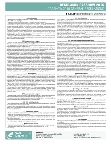 Termin nadsyłania Application deadline 31.01.2015 REGULAMIN GASShow 2016 GASShow 2016 GENERAL REGULATIONS 8-9.04.2016 EXPO XXI CENTRE, WARSAW (PL) § 1. Postanowienia ogólne 1. W dniach 8-9.04.2016 odbędą się w Warszawie w Centrum Wystawienniczym EXPO XXI Międzynarodowe Targi GasShow 2016, zwane dalej Targami. 2. Organizatorem Targów jest Idea Ahead z siedzibą w Warszawie, zwana dalej Organizatorem. 3. Zgłoszenie uczestnictwa w targach następuje na formularzu zgłoszenia udziału. Kompletnie wypełniony formularz zgłoszenia udziału, podpisany przez prawnie upoważnionych reprezentantów Uczestnika, należy przekazać Organizatorowi najpóźniej do 29.02.2016. Przesłanie Organizatorowi wypełnionego formularza zgłoszenia udziału jest potwierdzeniem, iż Uczestnik zapoznał się z treścią niniejszego Regulaminu i wyraził zgodę na włączenie jego treści do umowy z Organizatorem. 4. Organizator może odstąpić od umowy w terminie do 8.04.2016. Oświadczenie Organizatora o odstąpieniu musi zostać złożone w formie pisemnej, za pośrednictwem telefaksu lub wiadomości e-mail. W przypadku odstąpienia od umowy Organizator jest zobowiązany zwrócić kwotę wpłaconą przez uczestnika z tytułu realizacji umowy w terminie 7 dni od daty odstąpienia. 5. Wynikający z pkt. 4. obowiązek Organizatora wyczerpuje świadczenia do których jest on zobowiązany. Oznacza to, że Uczestnik nie będzie mógł dochodzić od Organizatora żadnych innych roszczeń majątkowych powstałych na tle zawarcia umowy na uczestnictwo w Targach. § 1. General provisions 1. On 8-9.04.2016 in EXPO XXI Warsaw International Expocentre there will be held International GasShow 2016 Exibition, further called the Exhibition. 2. The Exhibition is organised by Idea Ahead, based in Warsaw, Poland, further called the Organiser. 3. Application to the Exhibition should be submitted on application form. A completely filled out application form, signed by the Participant’s legally authorised representatives, must be submitted to the Organiser by 29.02.2016. Filled out application form to the Organiser confirms that the Participant has become acquainted with the contents of these Regulations and has expressed permission to include it in the contract with the Organiser. 4. The Organiser may renounce the contract by 8.04.2016. The Organiser’s declaration on renounce must be presented in writing, by fax or by e-mail. In that case, Organiser will be obliged to return the amount paid by the participant within 7 days of the date of renounce. 5. The Organiser’s obligation resulting from point 4. exhausts the performances to which he is obliged. This means that the Participant will not be able to pursue any other property claims from the Organiser, resulting from concluding the contract for participating in the Exhibition. § 2. Zasady uczestnictwa w Targach 1. Uczestnik ma prawo do prezentacji swojej firmy i oferty handlowej na wynajętej powierzchni targowej. Minimalna powerzchnia jaką może zamówić Uczestnik to 9 m2. 2. Wynajęcie powierchni wystawowej uprawnia Uczestnika do bezpłatnego wpisu do katalogu Targów oraz otrzymania jednego zaproszenia na Wieczorną Galę. 3. Uczestnik może skorzystać z dodatkowych usług (np. zamówienie dodatkowego sprzętu i obsługi, dodatkowych usług reklamowych, zamówienie reklamy w katalogu Targów, zakupu kart wstępu na konferencję i Wieczorną Galę) wg obowiązującego cennika przedstawionego przez Organizatora. 4. Organizator zastrzega sobie prawo do odmowy przyjęcia na wystawę zbyt dużych lub niebezpiecznych eksponatów. Sposób prezentacji firmy i oferty handlowej Uczestnika nie może zakłócać prezentacji innych Uczestników. 5. Uczestnik ponosi wyłączną odpowiedzialność za szkody wynikłe z jego ekspozycji wystawowej oraz wywołane przez jego pracowników w trakcie przygotowania, trwania i likwidacji Targów. Mocowanie eksponatów do ścian modułu powinno być wcześniej zgłoszone Organizatorowi i dokonane w sposób przez niego zatwierdzony. 6. Stoiska niezabudowane udostępniane są Uczestnikom od 7.04.2016 g. 8.00. Stoiska zabudowane udostępniane są od 7.04.2016 g. 13.00. Uczestnicy powinni opuścić stoiska do 9.04.2016 g. 22.00. 7. Uczestnik oświadcza, iż na wypadek nie zajęcia wynajętej powierzchni targowej do godz. 20.00 w dniu 7.04.2016 udziela Organizatorowi upoważnienia do wykorzystania tej powierzchni według uznania Organizatora. Powyższe postanowienie nie ma żadnego wpływu na inne obowiązki wynikające dla stron z zawarcia umowy na uczestnictwo w Targach. 8. Uczestnik chcący zademonstrować eksponaty w działaniu musi otrzymać pisemną zgodę Organizatora na pokaz ich działania. Uczestnik jest zobowiązany zapewnić przez cały czas bezpieczeństwo osób trzecich. Uczestnik ponosi wyłączną odpowiedzialność za szkody powstałe na skutek prezentacji działania eksponatu. 9. Uczestnik nie jest uprawniony do udostępniania powierzchni wystawowej innym podmiotom. § 2. Rules regarding participation in the Exhibition 1. The Participant may present its company and trade offer on the purchased exhibition area. The minimum area that can be ordered is 9 m2. 2. Purchasing the exhibition area entitles the Participant to the free of charge entry to the exhibition catalogue and one entrance card to the Evening Gala. 3. The Participant may order the additional services (e.g. additional stand equipment or service, additional advertising services, advertisement in the exhibition catalogue, admission cards to the conference, invitations to the Evening Gala) according to the price list presented be the Organiser. 4. The Organiser reserves the right to refuse to accept exhibits that are too big or dangerous. The way in which the Participant’s company and offer is presented cannot disturb other Participants. 5. The Participant bears exclusive responsibility for any damages resulting from its exposition and the activities of his empl