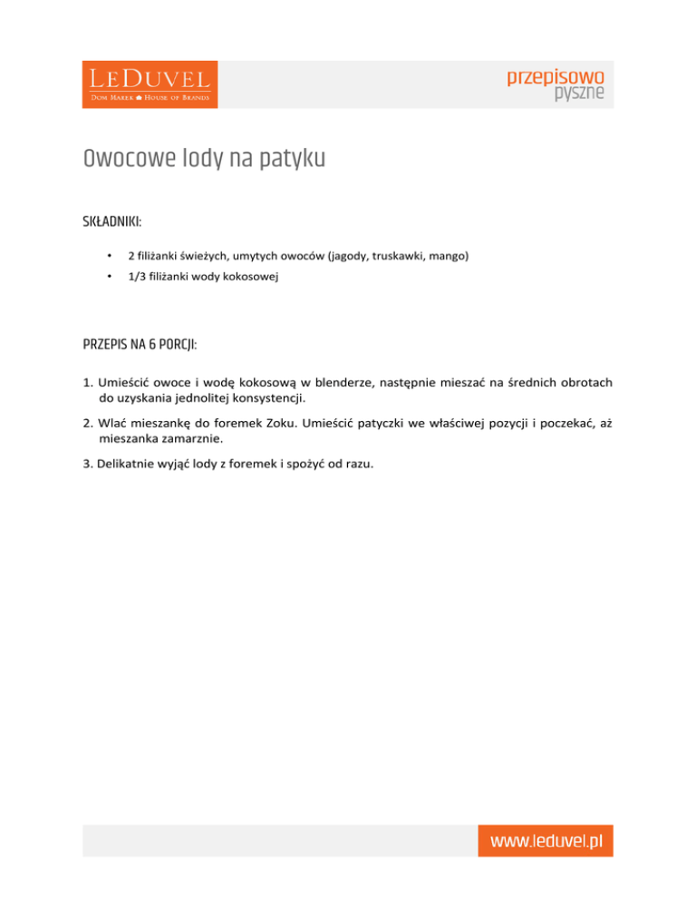 Owocowe lody na patyku SKŁADNIKI: • 2 filiżanki świeżych, umytych owoców (jagody, truskawki, mango) • 1/3 filiżanki wody kokosowej PRZEPIS NA 6 PORCJI: 1. Umieścić owoce i wodę kokosową w blenderze, następnie mieszać na średnich obrotach do uzyskania jednolitej konsystencji. 2. Wlać mieszankę do foremek Zoku. Umieścić patyczki we właściwej pozycji i poczekać, aż mieszanka zamarznie. 3. Delikatnie wyjąć lody z foremek i spożyć od razu.