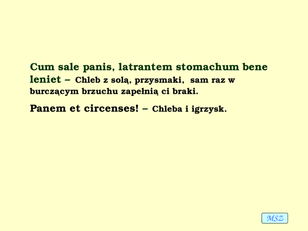 Cum sale panis, latrantem stomachum bene leniet – Chleb z solą, przysmaki, sam raz w burczącym brzuchu zapełnią ci braki. Panem et circenses! – Chleba i igrzysk. MSZ ..…” Ale na przyzbie domu usiedli dwaj starce, Mając u kolan pełne miodu dwa półgarce;........ Ale starce miód piją, tabakierką z kory Częstując się nawzajem, toczą rozhowory. ” Tak, tak, mój Protazeńku” rzekł klucznik Gerwazy. ” Tak, tak, mój Gerwazeńku” rzekł woźny Protazy. Wojski przez okno kuchni, ponad starców głowy Wytknąwszy głowę, milczkiem słuchał ich rozmowy I podał im nareszcie filiżanki spodek Pełen biszkoptów, mówiąc: „ Zakąście wasz miodek” .....… Księga XI Pan Tadeusz, Adam Mickiewicz MSZ Andriolli Michał Elwiro (183693), rysownik i ilustrator, malarz religijny. Studiował w Moskwie, Petersburgu i Rzymie. 186671 na zesłaniu za działalność patriotyczną. Od 1871 w Warszawie, gdzie zyskał rozgłos jako ilustrator czasopism, tworząc głównie dla “ Kłosów” , “ Biesiady Literackiej” i "Tygodnika Ilustrowanego” . 1883 86 pracował w Paryżu dla oficyny FirminDidot jako następca G. Doré, ilustrując m.in. powieści J.F. Coopera. Z odbywanych do końca życia wycieczek po kraju tworzył cykle rysunkowe przedstawiające zabytki, ludowe zwyczaje, życie wiejskich dworków i sceny obyczajowe. Styl Andriollego cechuje romantyczna staroświeckość, fantazja i zagmatwana, nerwowa kreska. Sławę zdobył cyklami ilustracji do utworów A. Mickiewicza (np. Pana Tadeusza A. Mickiewicza w wyd. albumowym H. Altenberga z 1882). Ilustrował także utwory I. Chodźki, J.I. Kraszewskiego, J. Malczewskiego, E. Orzeszkowej, J. Słowackiego i in. http://wiem.onet.pl MSZ ANALIZA ŻYWNOŚCI Klasyczna Instrumentalna Oparta głównie na reakcjach chemicznych Wykorzystuje zjawiska fizyczne ANALIZA ŻYWNOŚCI Analiza sensoryczna i ocena organoleptyczna Grupa norm ISO serii 9000 Grupa norm EN serii 29000 Analiza chemiczna MSZ Schemat postępowania ze środkami spożywczymi o niewłaściwej jakości zdrowotnej (wg Sadowskiej) MSZ DZ. U. R.P. 22.06.2001 nr 63 poz. 634 z dnia 11 maja 2001 r. o warunkach zdrowotnych żywności i żywienia Pojęcie – nowej żywności Rozdz. 1. Przepisy ogólne Art. 2. Ustawy nie stosuje się do: 26) nowa żywność – substancje lub ich mieszaniny, które dotychczas nie były wykorzystywane do żywienia ludzi, w tym środki spożywcze, używki lub ich składniki: f) zawierające lub składające się z genetycznie zmodyfikowanych organizmów albo ich fragmentów, określonych w odrębnych przepisach, g) otrzymane z organizmów o których mowa w lit a), ale ich niezawierąjące, h) o nowej lub celowo zmodyfikowanej podstawowej strukturze molekularnej, i) wyizolowane z mikroorganizmów, grzybów lub wodorostów lub składające się z nich, MSZ e) składające się z roślin lub uzyskane z roślin lub ze zwierząt, z wyjątkiem żywności i składników żywności otrzymanych przy zastosowaniu tradycyjnych metod rozmrażania lub hodowli f) poddane procesowi technologicznemu niestosowanemu dotychczas, powodującemu istotne zmiany ich składu lub struktury, który wpływa na wartość odżywczą, metabolizm i zawartość niepożądanych substancji Rozdz. 2. Art. 11.1. Nowa żywność nie może: 6) Stanowić zagrożenia dla zdrowia lub życia człowieka oraz środowiska, 7) Różnić się od żywności lub składników żywności, które ma zastąpić, w stopniu powodującym, ze jej użycie lub spożycie byłoby niekorzystne ze względów zdrowotnych lub żywieniowych. MSZ Wg Gertig i Gawęcki (Słownik Terminów Żywieniowych, PWN 2001) Żywność ekologiczna (ecological food) – produkty spożywcze o obniżonym poziomie zanieczyszczeń chemicznych. Jest produkowana na terenach pozaemisyjnych z surowców pozyskiwanych w gospodarstwach rolnych, stosujących alternatywne metody produkcji (ekologiczne, biodynamiczne, zintegrowane) Żywność funkcjonalna (functional food) – żywność zawierająca jeden lub kilka składników (nie będących składnikami odżywczymi), których działanie wywołuje selektywny i pozytywny efekt w odniesieniu do określonej funkcji organizmu człowieka. Żywność lecznicza (nutraceutyk) –(nutraceutical) – produkt będący skoncentrowanym źródłem jednego lub więcej składników odżywczych, który ma charakter preparatu farmaceutycznego i wywiera korzystne skutki zdrowotne. Żywność ochronna – żywność profilaktyczna, prozdrowotna (protective food) – produkty spożywcze obfitujące w składniki odżywcze, których niedobory występują najczęściej, względnie o zmniejszonej wartości energetycznej lub zawartości składników, których nadmierna podaż żywnością przyczynia się do rozwoju chorób, np. typu light, MSZ wysokobłonnikowa, niskosodowa, bezcholesterolowa itp... Wg Gertig i Gawęcki (Słownik Terminów Żywieniowych, PWN 2001) cd. Żywność wygodna (convenient food) – produkty spożywcze otrzymywane w wyniku takiego przetwarzania surowców, które umożliwia konsumentowi szybkie przygotowanie z nich posiłków; porcjowane i pakowane w sposób szczególnie dogodny dla konsumenta. Wyróżnia się m.in. produkty: gotowe do odróbki termicznej (ready to cook), gotowe do podgrzania (ready to heat), gotowe do spożycia (ready tp eat) MSZ Wg Paulus’ a Żywność wygodna – produkty spożywcze otrzymywane w wyniku przetwarzania surowców z wykorzystaniem operacji zalecanych przez dobra praktykę technologiczną, które nadają wyrobom pożądaną trwałość i umożliwiają szybkie przygotowanie z nich – lub w połączeniu z innymi składnikami bezpiecznych posiłków. Stopień przetworzenia – żywność gotowa do: Obróbki wstępnej (ready to process) Obróbki kulinarnej (ready to kitchen) Obróbki termicznej (ready to cook) Podgrzania (ready to heat) Spożycia (ready to eat) MSZ Wg Cynthia Taft Bayerl Żywność funkcjonalna – substancja albo część żywności, kt