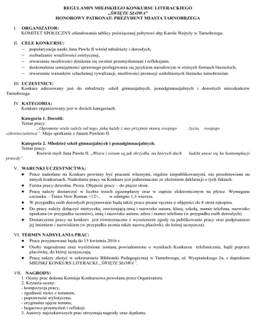 REGULAMIN MIEJSKIEGO KONKURSU LITERACKIEGO „ŚWIĘTE SŁOWA” HONOROWY PATRONAT: PREZYDENT MIASTA TARNOBRZEGA I. ORGANIZATOR: KOMITET SPOŁECZNY ufundowania tablicy poświęconej pobytowi abp Karola Wojtyły w Tarnobrzegu. II. CELE KONKURSU: popularyzacja nauki Jana Pawła II wśród młodzieży i dorosłych, rozbudzanie wrażliwości estetycznej, stwarzanie możliwości dzielenia się swoimi przemyśleniami i refleksjami, doskonalenie umiejętności sprawnego posługiwania się językiem narodowym w różnych formach literackich, stworzenie warunków szlachetnej rywalizacji, możliwości promocji uzdolnionych literacko tarnobrzeżan. III. UCZESTNICY: Konkurs adresowany jest do młodzieży szkół gimnazjalnych, ponadgimnazjalnych i dorosłych mieszkańców Tarnobrzega. IV. KATEGORIA: Konkurs organizowany jest w dwóch kategoriach. Kategoria 1. Dorośli: Temat pracy: „Ogromnie wiele zależy od tego, jaką każdy z nas przyjmie miarę swojego człowieczeństwa”. Moje spotkanie z Janem Pawłem II. Kategoria 2. Młodzież szkół gimnazjalnych i ponadgimnazjalnych. Temat pracy: Rozwiń myśl Jana Pawła II. „Wiara i rozum są jak skrzydła, na których duch prawdy”. życia, swojego ludzki unosi się ku kontemplacji V. WARUNKI UCZESTNICTWA: Prace nadesłane na Konkurs powinny być pracami własnymi, nigdzie niepublikowanymi, nie przedstawiane na innych konkursach. Nadesłanie pracy na Konkurs jest jednoznaczne ze złożeniem deklaracji o tych faktach. Forma pracy dowolna. Proza. Objętość pracy – do pięciu stron. Pracę należy dostarczyć w liczbie trzech egzemplarzy oraz w zapisie elektronicznym na płytce. Wymagana czcionka – Times New Roman <12>, w odstępie 1,5 wiersza. W przypadku osób dorosłych przyjmowane będą także prace pisane ręcznie o objętości do 8 stron rękopisu. Do pracy należy dołączyć metryczkę, zawierającą imię i nazwisko autora, klasę, szkołę, numer telefonu, nazwisko opiekuna (w przypadku uczniów), imię i nazwisko autora, adres i numer telefonu (w przypadku osób dorosłych). Dostarczenie pracy na konkurs jest równoznaczne z wyrażeniem zgody na publikowanie pracy oraz podpisaniem jej imieniem i nazwiskiem (w przypadku ucznia także nazwą placówki, do której uczęszcza). VI. TERMIN NADSYŁANIA PRAC: Prace przyjmowane będą do 15 kwietnia 2016 r. Osoby nagrodzone oraz wyróżnione zostaną powiadomione o wynikach Konkursu telefonicznie, bądź poprzez placówkę, do której uczęszczają. Pracę należy złożyć w sekretariacie Biblioteki Pedagogicznej w Tarnobrzegu, ul. Wyspiańskiego 2a, z dopiskiem MIEJSKI KONKURS LITERACKI „ŚWIĘTE SŁOWA”. VII. NAGRODY: 1. Oceny prac dokona Komisja Konkursowa powołana przez Organizatora. 2. Kryteria oceny: - kompozycja pracy, - zgodność treści z tematem, - poprawność stylistyczna, - oryginalne ujęcie tematu, - bogactwo przemyśleń i refleksji. 3. Autorzy najciekawszych prac otrzymają nagrody oraz dyplomy.