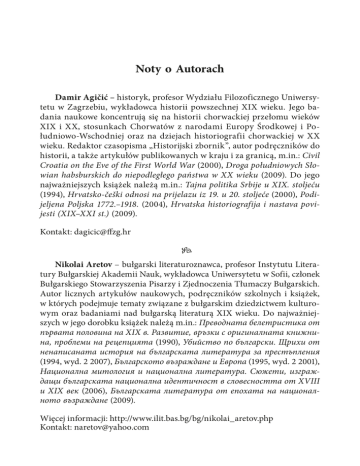 Noty o Autorach Damir Agičić – historyk, profesor Wydziału Filozoficznego Uniwersytetu w Zagrzebiu, wykładowca historii powszechnej XIX wieku. Jego badania naukowe koncentrują się na historii chorwackiej przełomu wieków XIX i XX, stosunkach Chorwatów z narodami Europy Środkowej i Południowo-Wschodniej oraz na dziejach historiografii chorwackiej w XX wieku. Redaktor czasopisma „Historijski zbornik”, autor podręczników do historii, a także artykułów publikowanych w kraju i za granicą, m.in.: Civil Croatia on the Eve of the First World War (2000), Droga południowych Słowian habsburskich do niepodległego państwa w XX wieku (2009). Do jego najważniejszych książek należą m.in.: Tajna politika Srbije u XIX. stoljeću (1994), Hrvatsko-češki odnosi na prijelazu iz 19. u 20. stoljeće (2000), Podijeljena Poljska 1772.–1918. (2004), Hrvatska historiografija i nastava povijesti (XIX–XXI st.) (2009). Kontakt: [email protected] • Nikolai Aretov – bułgarski literaturoznawca, profesor Instytutu Literatury Bułgarskiej Akademii Nauk, wykładowca Uniwersytetu w Sofii, członek Bułgarskiego Stowarzyszenia Pisarzy i Zjednoczenia Tłumaczy Bułgarskich. Autor licznych artykułów naukowych, podręczników szkolnych i książek, w których podejmuje tematy związane z bułgarskim dziedzictwem kulturowym oraz badaniami nad bułgarską literaturą XIX wieku. Do najważniejszych w jego dorobku książek należą m.in.: Преводната белетристика от първата половина на ХIХ в. Развитие, връзки с оригиналната книжнина, проблеми на рецепцията (1990), Убийство по български. Щрихи от ненаписаната история на българската литература за престъпления (1994, wyd. 2 2007), Българското възраждане и Европа (1995, wyd. 2 2001), Национална митология и национална литература. Сюжети, изграждащи българската национална идентичност в словесността от ХVІІІ и ХІХ век (2006), Българската литература от епохата на националното възраждане (2009). Więcej informacji: http://www.ilit.bas.bg/bg/nikolai_aretov.php Kontakt: [email protected] 354 Noty o Autorach Agnieszka Ayşen Kaim – doktor turkologii ze specjalizacją literaturoznawczą, adiunkt w Katedrze Slawistyki Południowej Uniwersytetu Łódzkiego. Członek i sekretarz Stowarzyszenia „Grupa Studnia O.”, które zajmuje się badaniem i praktykowaniem sztuki opowiadania, tłumaczka. Zainteresowania badawcze literaturą ustną Turcji i Bliskiego Wschodu, kulturą widowiskową, teatrem tradycyjnym i współczesnym, współczesną dramaturgią i kinematografią turecką, sufizmem i wpływami tureckimi na Bałkanach zaowocowały tekstami opublikowanymi w Leksykonie wiedzy o Turcji (2003) i w encyklopedii Wydawnictwa Naukowego PWN oraz artykułami: Avrupa ve Doğu Tiyatro Geleneğinin Bağlamında Tek Oyunculu Meddah Türk Tiyatros (Ankara 1997), Współczesny teatr i dramaturgia w Turcji (2003), Sözlü edebiyat ve gösteri kültürürün buluşma noktası meddah tek kişilik tiyatro (Ankara 2007), Elementy widowiskowe w tureckiej sztuce opowiadania (2008). Kontakt: [email protected] • Yordanka Bibina – profesor w Instytucie Studiów Bałkanistycznych i Centrum Naukowym Tracjologii Bułgarskiej Akademii Nauk, główny koordynator Centrum Historycznego Narodów Bałkańskich. Pole jej zainteresowań badawczych związane jest z historią kultury i literatury tureckiej, dialogiem międzykulturowym, współczesną sztuką turecką, europeizacją Turcji i modernizacją bułgarsko-tureckich stosunków bilateralnych. Jest także tłumaczką literatury tureckiej. Pierwszy tom jej studium История на турската литература. От зараждането й до Танзимата (2000) to pierwsza bułgarska praca poświęcona problematyce wzajemnego oddziaływania kulturowego. Napisała ponad 70 artykułów naukowych związanych z tą problematyką, m.in.: The Translational Reception of Turkish Literature in Bulgaria, [w:] Translational Reception of European Literatures in Bulgaria (Sofia 2004), Bulgarian-Turkish Relations in the First Half of the 1970s through the Eyes of Bulgarian Diplomats, „Études balkaniques” (Sofia 2006), Анатомия на времето, [w:] Голямото вписване или Какво сравнява сравнителното литературознание? (2010). Kontakt: [email protected] • Noty o Autorach 355 Karolina Bielenin-Lenczowska – antropolog i lingwistka, adiunkt w Instytucie Etnologii i Antropologii Kulturowej Uniwersytetu Warszawskiego. Zajmuje się relacjami rodzinnymi i sąsiedzkimi w kontekście migracji muzułmanów macedońskich (Torbeszów) z Macedonii do Włoch. Autorka książki Rodzina, ród, pokrewieństwo w perspektywie lingwistyczno-antropologicznej (2008), redaktorka tomu Sąsiedztwo w obliczu konfliktu. Relacje społeczne i etniczne w zachodniej Macedonii – refleksje antropologiczne (2009). Kontakt: [email protected] • Ewa Bujwid-Kurek – profesor w Katedrze Współczesnych Systemów Politycznych Instytutu Nauk Politycznych i Stosunków Międzynarodowych Uniwersytetu Jagiellońskiego. Jej główne zainteresowania naukowe koncentrują się wokół współczesnej problematyki państw bałkańskich, ze szczególnym uwzględnieniem państw powstałych w wyniku dekompozycji federacji jugosłowiańskiej u schyłku XX wieku. Autorka kilku książek z tego zakresu, m.in.: Państwa pojugosłowiańskie. Szkice politologiczne (2008). Współautorka książki wydanej w języku rosyjskim Padenije Jugosławii: pricziny i sledstwija (Woroneż 2010). Do jej najważniejszych artykułów naukow