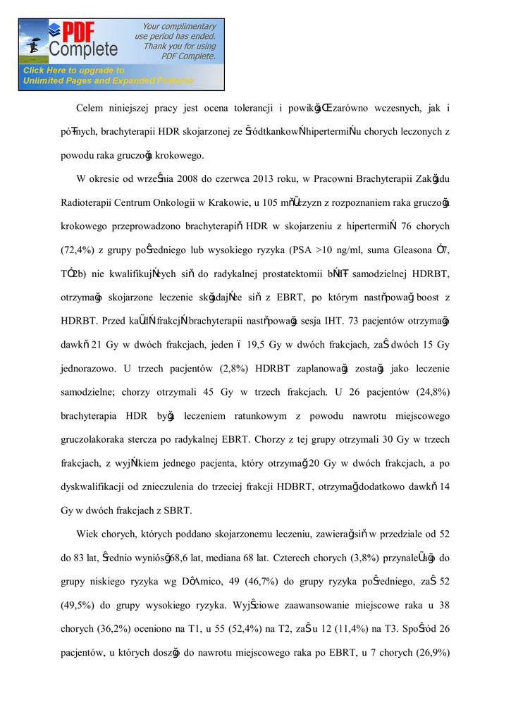 STRESZCZENIE Celem niniejszej pracy jest ocena tolerancji i powikłań zarówno wczesnych, jak i późnych, brachyterapii HDR skojarzonej ze śródtkankową hipertermią u chorych leczonych z powodu raka gruczołu krokowego. W okresie od września 2008 do czerwca 2013 roku, w Pracowni Brachyterapii Zakładu Radioterapii Centrum Onkologii w Krakowie, u 105 mężczyzn z rozpoznaniem raka gruczołu krokowego przeprowadzono brachyterapię HDR w skojarzeniu z hipertermią. 76 chorych (72,4%) z grupy pośredniego lub wysokiego ryzyka (PSA >10 ng/ml, suma Gleasona ≥7, T≥2b) nie kwalifikujących się do radykalnej prostatektomii bądź samodzielnej HDRBT, otrzymało skojarzone leczenie składające się z EBRT, po którym następował boost z HDRBT. Przed każdą frakcją brachyterapii następowała sesja IHT. 73 pacjentów otrzymało dawkę 21 Gy w dwóch frakcjach, jeden – 19,5 Gy w dwóch frakcjach, zaś dwóch 15 Gy jednorazowo. U trzech pacjentów (2,8%) HDRBT zaplanowała została jako leczenie samodzielne; chorzy otrzymali 45 Gy w trzech frakcjach. U 26 pacjentów (24,8%) brachyterapia HDR była leczeniem ratunkowym z powodu nawrotu miejscowego gruczolakoraka stercza po radykalnej EBRT. Chorzy z tej grupy otrzymali 30 Gy w trzech frakcjach, z wyjątkiem jednego pacjenta, który otrzymał 20 Gy w dwóch frakcjach, a po dyskwalifikacji od znieczulenia do trzeciej frakcji HDBRT, otrzymał dodatkowo dawkę 14 Gy w dwóch frakcjach z SBRT. Wiek chorych, których poddano skojarzonemu leczeniu, zawierał się w przedziale od 52 do 83 lat, średnio wyniósł 68,6 lat, mediana 68 lat. Czterech chorych (3,8%) przynależało do grupy niskiego ryzyka wg D’Amico, 49 (46,7%) do grupy ryzyka pośredniego, zaś 52 (49,5%) do grupy wysokiego ryzyka. Wyjściowe zaawansowanie miejscowe raka u 38 chorych (36,2%) oceniono na T1, u 55 (52,4%) na T2, zaś u 12 (11,4%) na T3. Spośród 26 pacjentów, u których doszło do nawrotu miejscowego raka po EBRT, u 7 chorych (26,9%) aktualne zaawansowanie miejscowe raka określono jako rT1, u 17 (65,4%) na rT2, a u dwóch (7,7%) na rT3a. Wyjściowy poziom PSA przed leczeniem radykalnym wyniósł średnio 24,4 ng/ml, mediana 14,6 ng/ml (zakres 1,36 - 199,4 ng/ml). Stopień złośliwości, określony według skali Gleasona przed leczeniem pierwotnego raka gruczołu krokowego, u 40 chorych (38,1%) oceniono na 6 i mniej, u 41 (39%) na 7, u 21 (20%) na 8 i więcej. Nie określono stopnia złośliwości u 3 (2,9%) pacjentów. Mediana czasu obserwacji od daty zakończenia skojarzonego leczenia wyniosła 17,2 miesięcy (zakres 7 – 53 miesiące). W grupie chorych opisywanych w niniejszej pracy najczęstszymi wczesnymi powikłaniami skojarzonego leczenia były nykturia, częstomocz, utrudnienie oddawania moczu, przejściowy krwiomocz, naglące parcia na mocz i objawy nieinfekcyjnego zapalenia dolnych dróg moczowych, zwykle samoistnie ustępujące i nie wymagające leczenia farmakologicznego. Jedynie u dwóch pacjentów (1,9%) w czasie kilku dni od podania pierwszej frakcji brachyterapii doszło do zatrzymania moczu wymagającego czasowego założenia cewnika Foleya (powikłania w 2°). Nie stwierdzono żadnych powikłań wczesnych w 3° i wyższych. W grupie pacjentów analizowanych w niniejszej pracy stwierdzono u jednego chorego (1%) późne powikłanie 3˚ - zwężenie cewki moczowej z retencją moczu, wymagające zabiegu przezcewkowej resekcji tkanki gruczołu krokowego (TURP). Częstość występowania powikłań 2˚ w badanej grupie chorych wynosi maksymalnie 26,7%, gdzie najczęstszym objawem jest nykturia, zwykle w literaturze pomijana (prawdopodobnie ze względu na współistnienie BPH u znaczącego odsetka chorych na RGK). W prezentowanym materiale u 16,2% chorych stwierdzono w kontrolach znaczny częstomocz, u 15,2% uciążliwe naglące parcia na pęcherz moczowy, utrudnienie oddawania moczu nie wymagające interwencji instrumentalnej u 10,5% chorych, zaleganie moczu po mikcji u 9,5% chorych. Nie stwierdzono żadnych późnych powikłań w 2˚ i wyższych ze strony przewodu pokarmowego. ABSTRACT The aim of this study is to evaluate the tolerance, early and late toxicity of HDR brachytherapy (HDRBT) combined with interstitial hyperthermia (IHT) in patients treated for prostate cancer. Between September 2008 and June 2013 at the Brachytherapy Unit, Departament of Radiotherapy, Centre of Oncology in Krakow, a total of 105 patients were treated for prostate cancer using HDBRT combined with IHT. 76 patients (72,4%) with primary intermediateand high-risk prostate cancer (PSA >10 ng/ml, suma Gleasona ≥7, T≥2b), who were not suitable for radical prostatectomy or brachytherapy alone, received combined treatment consisted of EBRT as the first stage, followed by HDRBT boost. 73 of them received the total dose of 21 Gy in two fractions, one patient – 19,5 Gy in two fractions, and two received 15 Gy in single fraction. IHT was performed before every brachytherapy fraction. In three patients (2,8%) HDRBT was planned as a single modality treatment; patients from this group were treated with a dose of 45 Gy in three fractions. HDRBT was the salvage treatment for 26 patients (24,8%) with local recurrence of prostate adenocarcinoma after previous definitive EBRT. They received 30 Gy in three fractions, except one patient, who received 20 Gy in two fractions, and then was disqualified from spinal anaesthesia – he was irradiated additionally with the dose of 14 Gy in 2 fractions with SBRT technique. The median age of patients treated was 68 years, mean 68,6 years (range 52 – 83 years). Four patients (3,8%) were stratified as low-risk according to D’Amico criteria, 49 (46,7%) as intermediate-risk, and 52 (49,5%) as high-risk group. Local stage of prostate cancer in 38 patients (36,2%) was assessed as T1, in 55 (52,4%) as T2, and in 12 (11,4%) as T3. In the group of 26 patients with local prostate cancer recurrence after EBRT, in 7 patients (26,9%) actual local stage 