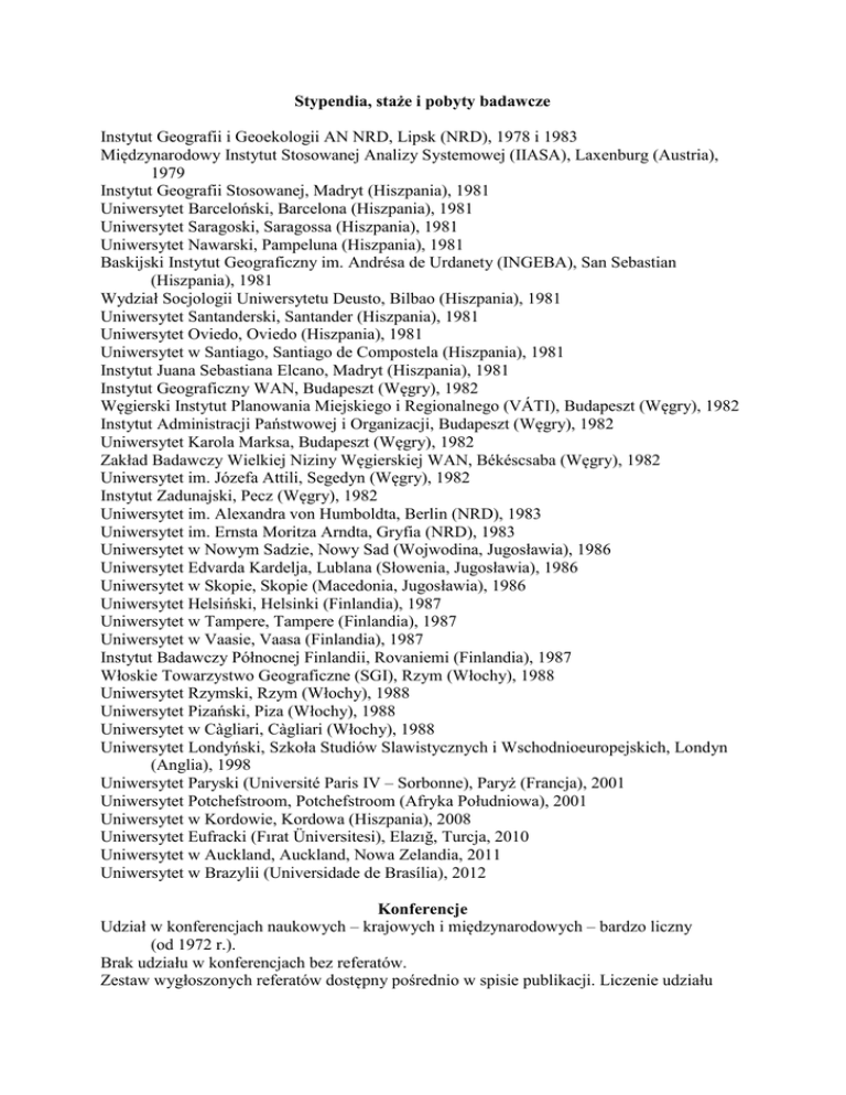 Stypendia, staże i pobyty badawcze Instytut Geografii i Geoekologii AN NRD, Lipsk (NRD), 1978 i 1983 Międzynarodowy Instytut Stosowanej Analizy Systemowej (IIASA), Laxenburg (Austria), 1979 Instytut Geografii Stosowanej, Madryt (Hiszpania), 1981 Uniwersytet Barceloński, Barcelona (Hiszpania), 1981 Uniwersytet Saragoski, Saragossa (Hiszpania), 1981 Uniwersytet Nawarski, Pampeluna (Hiszpania), 1981 Baskijski Instytut Geograficzny im. Andrésa de Urdanety (INGEBA), San Sebastian (Hiszpania), 1981 Wydział Socjologii Uniwersytetu Deusto, Bilbao (Hiszpania), 1981 Uniwersytet Santanderski, Santander (Hiszpania), 1981 Uniwersytet Oviedo, Oviedo (Hiszpania), 1981 Uniwersytet w Santiago, Santiago de Compostela (Hiszpania), 1981 Instytut Juana Sebastiana Elcano, Madryt (Hiszpania), 1981 Instytut Geograficzny WAN, Budapeszt (Węgry), 1982 Węgierski Instytut Planowania Miejskiego i Regionalnego (VÁTI), Budapeszt (Węgry), 1982 Instytut Administracji Państwowej i Organizacji, Budapeszt (Węgry), 1982 Uniwersytet Karola Marksa, Budapeszt (Węgry), 1982 Zakład Badawczy Wielkiej Niziny Węgierskiej WAN, Békéscsaba (Węgry), 1982 Uniwersytet im. Józefa Attili, Segedyn (Węgry), 1982 Instytut Zadunajski, Pecz (Węgry), 1982 Uniwersytet im. Alexandra von Humboldta, Berlin (NRD), 1983 Uniwersytet im. Ernsta Moritza Arndta, Gryfia (NRD), 1983 Uniwersytet w Nowym Sadzie, Nowy Sad (Wojwodina, Jugosławia), 1986 Uniwersytet Edvarda Kardelja, Lublana (Słowenia, Jugosławia), 1986 Uniwersytet w Skopie, Skopie (Macedonia, Jugosławia), 1986 Uniwersytet Helsiński, Helsinki (Finlandia), 1987 Uniwersytet w Tampere, Tampere (Finlandia), 1987 Uniwersytet w Vaasie, Vaasa (Finlandia), 1987 Instytut Badawczy Północnej Finlandii, Rovaniemi (Finlandia), 1987 Włoskie Towarzystwo Geograficzne (SGI), Rzym (Włochy), 1988 Uniwersytet Rzymski, Rzym (Włochy), 1988 Uniwersytet Pizański, Piza (Włochy), 1988 Uniwersytet w Càgliari, Càgliari (Włochy), 1988 Uniwersytet Londyński, Szkoła Studiów Slawistycznych i Wschodnioeuropejskich, Londyn (Anglia), 1998 Uniwersytet Paryski (Université Paris IV – Sorbonne), Paryż (Francja), 2001 Uniwersytet Potchefstroom, Potchefstroom (Afryka Południowa), 2001 Uniwersytet w Kordowie, Kordowa (Hiszpania), 2008 Uniwersytet Eufracki (Fırat Üniversitesi), Elazığ, Turcja, 2010 Uniwersytet w Auckland, Auckland, Nowa Zelandia, 2011 Uniwersytet w Brazylii (Universidade de Brasília), 2012 Konferencje Udział w konferencjach naukowych – krajowych i międzynarodowych – bardzo liczny (od 1972 r.). Brak udziału w konferencjach bez referatów. Zestaw wygłoszonych referatów dostępny pośrednio w spisie publikacji. Liczenie udziału w konferencjach jest więc bezzasadne.