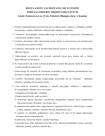 REGULAMINU ZACHOWANIA SIĘ UCZNIÓW PODCZAS PRZERW MIĘDZYLEKCYJNYCH Szkoły Podstawowej nr 15 im. Polskich Olimpijczyków w Koninie 1. Przerwa międzylekcyjna przeznaczona jest na odpoczynek, rozmowy z kolegami, posiłek, korzystanie z toalety, biblioteki i dokonywanie zakupów w sklepiku. 2. Uczniowie bezwzględnie podporządkowują się poleceniom nauczycieli dyżurujących i innych pracowników szkoły. 3. Uczniów obowiązuje zakaz opuszczania terenu szkoły w czasie przerw oraz przebywania w holu głównym (parter) szkoły. 4. Uczniowie zobowiązani są do przebywania podczas przerwy w rejonie sali, w której będą odbywać zajęcia. 5. Zobowiązuje się uczniów, aby tornistry ustawiali równo przy ścianie sali, w której będą odbywać się ich zajęcia. 6. W czasie przerw nie wolno uczniom przebywać w salach lekcyjnych, chyba że z uczniami w klasie przebywa nauczyciel. 7. Zobowiązuje się uczniów do zwrócenia szczególnej uwagi podczas przechodzenia przy drzwiach z uwagi na otwieranie się ich na zewnątrz. 8. Uczniów obowiązują zasady bezpiecznego poruszania się po schodach – spokojnie wchodzą i schodzą zawsze prawą stroną. 9. Czas przerwy uczniowie spędzają w sposób sprzyjający relaksowi i odprężeniu. W szczególności zabrania się w tym czasie: 1) biegania po korytarzach i schodach, 2) hałasowania (krzyki, piski, gwizdy), 3) stosowania agresji fizycznej i psychicznej (popychanie, kopanie, bicie, podstawianie nóg, przezywanie, obrażanie, wyzywanie itp.), 4) organizowania zabaw, które mogą stanowić zagrożenie dla życia i zdrowia (gra w gumę, w piłkę, skakanie, kopanie i rzucanie różnych przedmiotów itp.), 5) siadania na schodach, półpiętrach i przy salach 8-9 oraz 21-22 (zakaz blokowania drożności dróg ewakuacyjnych), 6) śmiecenia, niszczenia mienia i sprzętu szkolnego, 7) noszenia przy sobie niebezpiecznych dla życia i zdrowia przedmiotów (noże, nożyczki, szpileczki, pinezki, przybory szkolne itp.). 10. Z toalet korzysta się tylko i wyłącznie w sprawach związanych z higieną i potrzebami fizjologicznymi. Uczniowie klas I-III i klas integracyjnych, mający zajęcia na parterze, korzystają z toalet na tej kondygnacji, a uczniowie klas IV-VI na pierwszym piętrze. 11. W toaletach i na korytarzach należy zachowywać czystość. 12. Obowiązuje uczniów absolutny zakaz korzystania z urządzeń do rejestracji obrazu i dźwięku na terenie szkoły (w razie złamania tego punktu regulaminu sprzęt taki zostaje zabrany i przekazany rodzicowi/prawnemu opiekunowi po przybyciu do szkoły, po jego odbiór). Powyższe przedmioty uczeń przynosi na swoją odpowiedzialność. 13. Podczas przerw obiadowych do jadalni schodzą zgodnie z harmonogramem tylko ci uczniowie, którzy korzystają ze stołówki. Kulturalnie ustawiają się w kolejce w oczekiwaniu na posiłek. 14. Podczas dokonywania zakupów w sklepiku szkolnym należy ustawić się w kolejce. Zakazuje się przepychania, wpychania oraz wypychania innych uczniów. W momencie zakończenia przerwy, uczniowie kończą zakupy. 15. O problemach, konfliktach, sytuacjach zagrażających bezpieczeństwu, zauważonej dewastacji i obecności osób postronnych uczniowie niezwłocznie informują dyżurującego nauczyciela lub innego pracownika szkoły. 16. Podczas przerwy na placu rekreacyjnym dodatkowo obowiązują następujące zasady: 1) wyjście na zewnątrz nie jest obowiązkowe, 2) uczniowie przebywają w wyznaczonym rejonie, 3) nie wolno wchodzić na ławki, niszczyć roślinności. 17. Po dzwonku na lekcję uczniowie zobowiązani są ustawić się w pary przed wyznaczoną salą lekcyjną i oczekiwać w spokoju na nauczyciela. 18. W razie nieobecności nauczyciela, przewodniczący klasy zgłasza to wicedyrektorom szkoły lub innemu nauczycielowi.