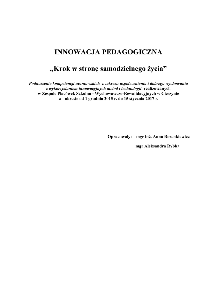INNOWACJA PEDAGOGICZNA „Krok w stronę samodzielnego życia” Podnoszenie kompetencji uczniowskich z zakresu uspołecznienia i dobrego wychowania z wykorzystaniem innowacyjnych metod i technologii realizowanych w Zespole Placówek Szkolno - Wychowawczo-Rewalidacyjnych w Cieszynie w okresie od 1 grudnia 2015 r. do 15 stycznia 2017 r. Opracowały: mgr inż. Anna Rozenkiewicz mgr Aleksandra Rybka Cieszyn, 30.10.2015r. SPIS TREŚCI I. Wstęp………………………………………………………………………………………..2 II. Cele innowacji……………………………………………………………………..…..…..3 III. Termin wprowadzenia i okres trwania Innowacji…………………………………..…4 IV. Adresaci innowacji………………….……………………………………………………4 V. Autorzy innowacji………………………………………………………………………....4 VI. Charakterystyka i opis innowacji…………………………………………………….....5 VII. Procedury osiągania zamierzonych celów oraz rodzaje aktywności – planowane metody i formy pracy……………………………………………………………………..…9 VIII. Uwagi…………………………………………………………………….…………….10 1 I. Wstęp Bezrobocie młodych osób jest jednym z najtrudniejszych i największych problemów społeczno-gospodarczych we współczesnym świecie. Zjawisko to od bardzo dawna jest przedmiotem zainteresowania zarówno psychologów jak i socjologów, ze względu na liczne następstwa oraz konsekwencje, które za sobą pociąga. Najważniejszymi skutkami bezrobocia są: pogarszanie się standardu i poziomu życia, problem ze spożytkowaniem wolnego czasu, brak kontaktów towarzyskich, izolacja społeczna, a także ograniczenie uczestniczenia w życiu politycznym, kulturalnym i towarzyskim. Skutkom tym bardzo często towarzyszy dyskomfort psychiczny, który polega na poczuciu bezsilności oraz wiąże się z niską samooceną. Szczególnie trudna sytuacja na rynku pracy dotyczy osób niepełnosprawnych. Podstawowym źródłem problemów jest niski poziom doświadczenia zawodowego. Praca stanowiąca istotny element życia, w przypadku niepełnosprawnych pełni rolę szczególną. Jest dla nich drogą do pełnego uczestnictwa w życiu społecznym, elementem rehabilitacji, a nie tylko źródłem pozyskiwania środków materialnych. Niepełnosprawni podejmując pracę wchodzą w relacje z otoczeniem zawodowym. Jest to dla nich możliwość zdobycia kompetencji społecznych oraz przełamania obaw przed kontaktem z innymi ludźmi. Przyczyn wysokiego bezrobocia jest bardzo dużo. Przede wszystkim ludzie młodzi, którzy dopiero zakończyli edukację, nie posiadają prawie żadnego doświadczenia zawodowego, przez co wymagają różnych szkoleń. Współcześnie, kiedy to pracodawcy stawiają coraz to wyższe wymagania przyszłym pracownikom najkorzystniejszym rozwiązaniem byłoby organizowanie licznych, przydatnych szkoleń oraz kursów, które ułatwiłyby im znalezienie jakiegoś zatrudnienia. Obecny rynek pracy stawia przed bezrobotnym bardzo duże wymagania. Oprócz wykształcenia-zawodu bardzo pożądane jest również doświadczenie zawodowe, które jest poświadczeniem tego, że osoba potrafi wykorzystać swoją wiedzę teoretyczną w praktycznych działaniach. Dzięki kursom młodzi ludzie mogliby nabyć kwalifikacje zawodowe oraz niezbędne umiejętności w podjęciu pracy zawodowej. Najważniejszym celem innowacji „Krok w stronę samodzielnego życia” jest zwiększenie szans zawodowych dla uczniów z niepełnosprawnością intelektualną na rynku pracy oraz podniesienie wśród uczestników kwalifikacji zawodowych. Uczestnicy innowacji zapoznają się z prowadzeniem własnej działalności gospodarczej – kawiarenka, przez co staną się bardziej konkurencyjni w poszukiwaniu zatrudnienia. Ponadto udział w zajęciach 2 pozwoli na zdobycie umiejętności komunikowania się, autoprezentacji, poznania swoich mocnych i słabych stron oraz uwierzenia we własne siły i możliwości. Udział w innowacji pozwoli uczestnikom na prawidłowe wchodzenie w interakcje społeczne, będące niewątpliwie ważnym czynnikiem w środowisku zawodowym. II. Cele innowacji W planowanej innowacji zakłada się następujące cele: zwiększenie szans zawodowych dla uczniów z niepełnosprawnością intelektualną, zwiększenie wśród uczestników umiejętności społecznych takich jak: komunikacja, autoprezentacja, asertywność, poznanie swoich mocnych i słabych stron zwiększenie wśród odbiorców innowacji umiejętności poruszania się po rynku pracy zwiększenie świadomości wyboru zawodu wśród młodzieży podniesienie wśród uczestników kwalifikacji zawodowych przygotowywanie do otwarcia własnej działalności gospodarczej wzrost motywacji do zmiany sytuacji życiowej oraz poczucia własnej wartości wzrost samodzielności życiowej osób niepełnosprawnych intelektualnie zdobycie nowych kwalifikacji zawodowych rozwijanie zainteresowań integracja społeczna zwiększenie poczucia własnej wartości wiara we własne możliwości wykształcenie umiejętności likwidowania konfliktów i ich źródeł w stosunkach z innymi ludźmi nabywanie umiejętności odpowiedniego zachowania w różnych sytuacjach życiowych kształtowanie obrazu własnej osoby i samooceny własnego zachowania kształtowanie inicjatywy i pomysłowości w rozwiązywaniu problemów kształtowanie umiejętności współpracy wyrabianie komunikacji międzyludzkiej i międzykulturowej nabywanie umiejętności promowania siebie 3 przełamywanie wewnętrznej tremy podczas wystąpień publicznych. III. Termin wprowadzenia i okres trwania Innowacji Zajęcia przeprowadzone zostaną przez pedagoga Annę Rozenkiewicz i Aleksandrę Rybka w terminie od 01.12.2015 do 15.01.2017r. IV. Adresaci inn
