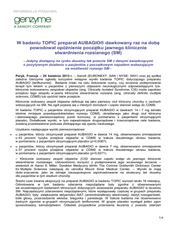 INFORMACJA PRASOWA W badaniu TOPIC preparat AUBAGIO® dawkowany raz na dobę powodował opóźnienie początku jawnego klinicznie stwardnienia rozsianego (SM) - Jedyny dostępny na rynku doustny lek przeciw SM z danymi świadczącymi o pozytywnym działaniu u pacjentów z początkowym napadem wskazującym na możliwość rozwoju SM Paryż, Francja – 25 kwietnia 2013 r. – Sanofi (EURONEXT: SAN i NYSE: SNY) oraz jej spółka zależna Genzyme ogłosiły korzystne wstępne wyniki badania TOPIC dotyczącego preparatu AUBAGIO (teriflunomid). Badanie miało na celu dokonanie oceny, czy wczesne podejmowanie terapii tym lekiem u pacjentów z pierwszymi objawami neurologicznymi odpowiadającymi tzw. klinicznie izolowanemu zespołowi objawów (ang. Clinically Isolated Syndrome, CIS) może zapobiec przejściu tego zespołu w jawne klinicznie stwardnienie rozsiane (ang. clinically definite multiple sclerosis, CDMS) lub opóźnić takie przejście. Klinicznie izolowany zespół objawów definiuje się jako pierwszy rzut kliniczny choroby o cechach wskazujących na SM. Na ogół pojawia się u młodych dorosłych i często stanowi wstęp do CDMS. W badaniu TOPIC u pacjentów otrzymujących preparat AUBAGIO w dawkach 14 i 7 mg istniało istotnie mniejsze prawdopodobieństwo rozwoju CDMS, określanego jako drugi rzut kliniczny i stanowiącego pierwszorzędowy punkt końcowy, w porównaniu z pacjentami otrzymującymi placebo. Dodatkowe wyniki, w tym najważniejsze drugorzędowe i trzeciorzędowe cele badania, zostaną przedstawione podczas zbliżającego się zjazdu naukowego. Uzyskano następujące wyniki pierwszorzędowe: u pacjentów, którzy otrzymywali preparat AUBAGIO w dawce 14 mg, obserwowano zmniejszenie o 43 procent ryzyka przejścia objawów w CDMS w trakcie dwuletniego okresu badania, w porównaniu z pacjentami otrzymującymi placebo (p=0,0087); u pacjentów, którzy otrzymywali preparat AUBAGIO w dawce 7 mg, obserwowano zmniejszenie o 37 procent ryzyka przejścia objawów w CDMS w trakcie dwuletniego okresu badania, w porównaniu z pacjentami otrzymującymi placebo (p=0,0271). – Klinicznie izolowany zespół objawów (CIS) stanowi często wstęp do jawnego klinicznie stwardnienia rozsianego. Udowodniono korzyści z podejmowania jego wczesnego leczenia – stwierdził dr Aaron E. Miller, Dyrektor Medyczny kliniki The Corinne Goldsmith Dickinson Center for Multiple Sclerosis należącej do ośrodka Mount Sinai Medical Center. – Wyniki te mają duże znaczenie, jako że istnieje niezaspokojone zapotrzebowanie na skuteczny lek doustny dla pacjentów w tym stadium choroby. Średni czas trwania ekspozycji na preparat AUBAGIO w badaniu TOPIC wynosił około 16 miesięcy. Odnotowane w tym badaniu zdarzenia niepożądane były zgodne z obserwowanymi we wcześniejszych badaniach klinicznych dotyczących stosowania preparatu AUBAGIO w leczeniu SM. Najczęstszymi zdarzeniami niepożądanymi, które występowały częściej w grupach preparatu AUBAGIO, były: zwiększenie aktywności AlAT (aminotransferazy alaninowej), nieżyt nosogardzieli, bóle głowy, przerzedzenie włosów, biegunka i parestezje. W trakcie badania nie obserwowano żadnych zgonów w grupach otrzymujących teriflunomid. W grupie placebo wystąpił jeden zgon spowodowany samobójstwem. Odsetek przypadków przerwania leczenia z powodu zdarzeń 1/4 niepożądanych był podobny w obu grupach terapeutycznych (9,1 procent w grupie placebo, wobec 12,1 procent w grupie otrzymującej teriflunomid w dawce 7 mg i 8,3 procent w grupie otrzymującej go w dawce 14 mg). – AUBAGIO jest jedynym doustnym, dostępnym na rynku lekiem przeznaczonym dla chorych na SM, który wykazywał w badaniach korzystne właściwości w leczeniu CIS. Jesteśmy bardzo zadowoleni z tych wstępnych wyników, które dodatkowo potwierdzają dane o niezmiennej skuteczności tego leku i możliwości podawania go szerokiej grupie pacjentów z SM – powiedział David Meeker, MD, Prezes i Dyrektor Generalny firmy Genzyme. – Dokładamy wszelkich starań, aby zaspokoić istniejące potrzeby związane z terapią SM poprzez prowadzenie badań naukowych w nowych obszarach i zapewnianie zróżnicowanych metod leczenia tej wyniszczającej choroby. W badaniach porównywano leczenie dawką doustną 14 lub 7 mg preparatu AUBAGIO raz na dobę z podawaniem placebo. Do tego prowadzonego metodą podwójnie ślepej próby, wieloośrodkowego badania klinicznego włączono 618 pacjentów, u których wystąpił pierwszy ostry lub podostry, dobrze zdefiniowany incydent neurologiczny wskazujący na demielinizację, a także pojawiły się objawy SM w ciągu 90 dni od randomizacji, z uwidocznieniem w badaniu metodą rezonansu magnetycznego, w obrazach T2-zależnych, dwóch lub większej liczby zmian charakterystycznych dla SM. Preparat AUBAGIO został dopuszczony do stosowania w leczeniu rzutowo-remisyjnych postaci SM w USA, Australii i Argentynie. Wnioski o dopuszczenie tego leku do obrotu są również obecnie rozpatrywane przez organy rejestracyjne na całym świecie. Obecnie prowadzony program badań klinicznych preparatu AUBAGIO, w których uczestniczy ponad 5000 pacjentów w 36 krajach, jest jednym z największych programów badawczych dotyczących leczenia SM w ogóle. Niektórzy pacjenci uczestniczący w badaniach kontynuacyjnych byli leczeni przez okres do 10 lat. Informacje o preparacie AUBAGIO® AUBAGIO jest lekiem immunomodulacyjnym o właściwościach przeciwzapalnych. Dokładny mechanizm jego działania nie został do końca wyjaśniony; może on jednak obejmować redukcję liczby aktywowanych limfocytów w ośrodkowym układzie nerwowym (OUN). Wskazania i sposób stosowania AUBAGIO (teriflunomid) jest lekiem przyjmowanym doustnie raz na dobę, wskazanym do stosowania u pacjentów z rzutowo-remisyjnymi postaciami stwardnienia rozsianego. Stwierdzono, że AUBAGIO w dawce 14 mg wykazuje istotną skuteczność w odniesieniu do najważniejszych miar aktywności SM, co obejmuje 