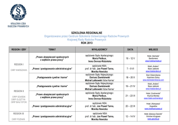 SZKOLENIA REGIONALNE Organizowane przez Centrum Szkolenia Ustawicznego Radców Prawnych Krajowej Rady Radców Prawnych ROK 2013 REGION / IZBY TEMAT WYKŁADOWCY DATA MIEJSCE „Prawo ubezpieczeń społecznych z wątkiem prawa pracy” sędziowie Sądu Apelacyjnego: Maria Pietkun, Irena Dorosz-Różańska 10 – 12 V Hotel „Sarmata” Sandomierz www.hotelsarmata.pl 7 – 9 VI Hotel „Anders” Stare Jabłonki www.hotelanders.pl 18 – 20 X Dom Dziennikarza Kazimierz Dolny www.domdziennikarza.com 19 – 21 IV Hotel „Anders” Stare Jabłonki www.hotelanders.pl REGION I OIRP WARSZAWA „Prawo i postępowanie administracyjne” „Postępowanie cywilne i karne” „Postępowanie cywilne i karne” REGION II OIRP GDAŃSK OIRP OLSZTYN OIRP BIAŁYSTOK REGION III OIRP POZNAŃ sędziowie NSA: prof. dr hab. Jan Paweł Tarno, Monika Nowicka sędziowie Sądu Najwyższego: Dariusz Zawistowski Michał Latkowski /Izba Karna/ sędziowie Sądu Najwyższego: Dariusz Zawistowski Michał Latkowski /Izba Karna/ „Prawo ubezpieczeń społecznych z wątkiem prawa pracy” sędziowie Sądu Apelacyjnego: Maria Pietkun, Irena Dorosz-Różańska 21 – 23 VI Hotel „Continental” Krynica Morska www.hotel-continental.pl „Prawo i postępowanie administracyjne” sędziowie NSA: prof. dr hab. Jan Paweł Tarno, Monika Nowicka 20 – 22 IX Hotel „Warszawa” Augustów www.hotelwarszawa.pl „Prawo i postępowanie administracyjne” sędziowie NSA: prof. dr hab. Jan Paweł Tarno, Monika Nowicka 12 – 14 IV Hotel „Bukowy Dworek” Gronów k/Łagowa www.geovita.pl OIRP KOSZALIN OIRP SZCZECIN REGION IV OIRP BYDGOSZCZ OIRP TORUŃ OIRP ŁÓDŹ REGION V OIRP WAŁBRZYCH OIRP WROCŁAW OIRP ZIELONA GÓRA „Prawo ubezpieczeń społecznych z wątkiem prawa pracy” sędziowie Sądu Apelacyjnego: Maria Pietkun, Irena Dorosz-Różańska 24 – 26 V CKiR „Geovita” Dźwirzyno www.geovita.pl „Postępowanie cywilne i karne” sędziowie Sądu Najwyższego: Dariusz Zawistowski Michał Latkowski /Izba Karna/ 20 – 22 IX Hotel „Jan” Darłowo www.hoteljan.pl „Prawo ubezpieczeń społecznych z wątkiem prawa pracy” sędziowie Sądu Apelacyjnego: Maria Pietkun, Irena Dorosz-Różańska 12 – 14 IV Hotel „Podklasztorze” Sulejów www.podklasztorze.pl „Postępowanie cywilne i karne” sędziowie Sądu Najwyższego: Dariusz Zawistowski Michał Latkowski /Izba Karna/ 10 – 12 V C K-R „MOLO” Smardzewice www.centrummolo.pl „Prawo i postępowanie administracyjne” sędziowie NSA: prof. dr hab. Jan Paweł Tarno, Monika Nowicka 11 – 13 X Pałac Targon Ciechocinek www.targon.pl „Prawo i postępowanie administracyjne” sędziowie NSA: prof. dr hab. Jan Paweł Tarno, Monika Nowicka 15 – 17 III Hotel „Malachit” Świeradów Zdrój www.interferie.pl „Postępowanie cywilne i karne” sędziowie Sądu Najwyższego: Dariusz Zawistowski Michał Latkowski /Izba Karna/ 17 – 19 V Hotel „Bukowy Dworek” Gronów k/Łagowa www.geovita.pl „Prawo ubezpieczeń społecznych z wątkiem prawa pracy” sędziowie Sądu Apelacyjnego: Maria Pietkun, Irena Dorosz-Różańska 4–6X Hotel „Sasanka” Szklarska Poręba www.hotel-sasanka.pl „Prawo ubezpieczeń społecznych z wątkiem prawa pracy” sędziowie Sądu Apelacyjnego: Maria Pietkun, Irena Dorosz-Różańska 8 – 10 III Hotel „Jaskółka” Ustroń www.jaskolka.com.pl „Prawo i postępowanie administracyjne” sędziowie NSA: prof. dr hab. Jan Paweł Tarno, Monika Nowicka 14 – 16 VI Hotel „Ostaniec” Podlesice k/Kroczyc www.ostaniec.com.pl „Postępowanie cywilne i karne” sędziowie Sądu Najwyższego: Dariusz Zawistowski Michał Latkowski /Izba Karna/ 4–6X CKiR „Geovita” Wisła Malinka www.geovita.pl „Postępowanie cywilne i karne” sędziowie Sądu Najwyższego: Dariusz Zawistowski 8 – 10 III CKiR „Geovita” Krynica Górska REGION VI OIRP KATOWICE OIRP OPOLE REGION VII Michał Latkowski /Izba Karna/ OIRP KRAKÓW OIRP RZESZÓW „Prawo i postępowanie administracyjne” „Prawo ubezpieczeń społecznych z wątkiem prawa pracy” „Prawo ubezpieczeń społecznych z wątkiem prawa pracy” REGION VIII OIRP LUBLIN OIRP KIELCE „Postępowanie cywilne i karne” „Prawo i postępowanie administracyjne” sędziowie NSA: prof. dr hab. Jan Paweł Tarno, Monika Nowicka sędziowie Sądu Apelacyjnego: Maria Pietkun, Irena Dorosz-Różańska sędziowie Sądu Apelacyjnego: Maria Pietkun, Irena Dorosz-Różańska sędziowie Sądu Najwyższego: Dariusz Zawistowski Michał Latkowski /Izba Karna/ sędziowie NSA: prof. dr hab. Jan Paweł Tarno, Monika Nowicka www.geovita.pl 17 – 19 V 11 – 13 X OSW „Antałówka” Zakopane www.antalowka-zakopane.pl Młyn Jacka – Hotel SPA Wadowice, Jaroszewice 234 www.hotelmj.pl 19 – 21 IV Dom Dziennikarza Kazimierz Dolny www.domdziennikarza.com 14 – 16 VI Hotel „Sarmata” Sandomierz www.hotelsarmata.pl 22 – 24 XI Dom Dziennikarza Kazimierz Dolny www.domdziennikarza.com Warszawa, dnia 13 grudnia 2012 r. Szczegóły i aktualne informacje znajdują się w treści ogłoszeń zamieszczonych na stronie kirp.pl w zakładce „Szkolenia regionalne organizowane przez Krajową Radę Radców Prawnych”. Radcowie prawni mogą brać udział we wszystkich szkoleniach bez względu na przynależność do okręgowej izby w miarę wolnych miejsc.