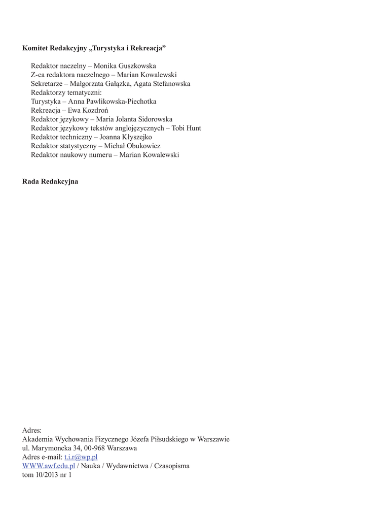 Komitet Redakcyjny „Turystyka i Rekreacja” Redaktor naczelny