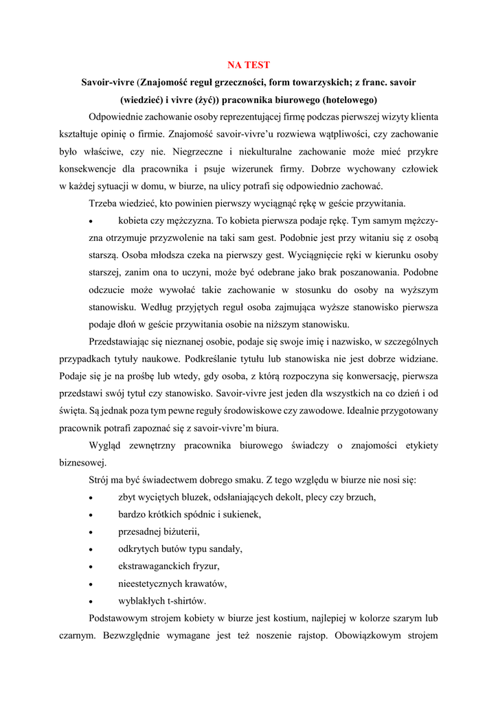 NA TEST Savoir-vivre (Znajomość reguł grzeczności, form towarzyskich; z franc. savoir (wiedzieć) i vivre (żyć)) pracownika biurowego (hotelowego) Odpowiednie zachowanie osoby reprezentującej firmę podczas pierwszej wizyty klienta kształtuje opinię o firmie. Znajomość savoir-vivre’u rozwiewa wątpliwości, czy zachowanie było właściwe, czy nie. Niegrzeczne i niekulturalne zachowanie może mieć przykre konsekwencje dla pracownika i psuje wizerunek firmy. Dobrze wychowany człowiek w każdej sytuacji w domu, w biurze, na ulicy potrafi się odpowiednio zachować. Trzeba wiedzieć, kto powinien pierwszy wyciągnąć rękę w geście przywitania. kobieta czy mężczyzna. To kobieta pierwsza podaje rękę. Tym samym mężczy- zna otrzymuje przyzwolenie na taki sam gest. Podobnie jest przy witaniu się z osobą starszą. Osoba młodsza czeka na pierwszy gest. Wyciągnięcie ręki w kierunku osoby starszej, zanim ona to uczyni, może być odebrane jako brak poszanowania. Podobne odczucie może wywołać takie zachowanie w stosunku do osoby na wyższym stanowisku. Według przyjętych reguł osoba zajmująca wyższe stanowisko pierwsza podaje dłoń w geście przywitania osobie na niższym stanowisku. Przedstawiając się nieznanej osobie, podaje się swoje imię i nazwisko, w szczególnych przypadkach tytuły naukowe. Podkreślanie tytułu lub stanowiska nie jest dobrze widziane. Podaje się je na prośbę lub wtedy, gdy osoba, z którą rozpoczyna się konwersację, pierwsza przedstawi swój tytuł czy stanowisko. Savoir-vivre jest jeden dla wszystkich na co dzień i od święta. Są jednak poza tym pewne reguły środowiskowe czy zawodowe. Idealnie przygotowany pracownik potrafi zapoznać się z savoir-vivre’m biura. Wygląd zewnętrzny pracownika biurowego świadczy o znajomości etykiety biznesowej. Strój ma być świadectwem dobrego smaku. Z tego względu w biurze nie nosi się: zbyt wyciętych bluzek, odsłaniających dekolt, plecy czy brzuch, bardzo krótkich spódnic i sukienek, przesadnej biżuterii, odkrytych butów typu sandały, ekstrawaganckich fryzur, nieestetycznych krawatów, wyblakłych t-shirtów. Podstawowym strojem kobiety w biurze jest kostium, najlepiej w kolorze szarym lub czarnym. Bezwzględnie wymagane jest też noszenie rajstop. Obowiązkowym strojem mężczyzny w biurze jest garnitur. Trzeba uważać, aby nie przekroczyć ustanowionych granic i kierować się obowiązującymi w firmie zasad ubierania się (dress code). DRESS CODE (kod ubraniowy) - sposób ubierania się w określonych miejscach i warunkach. Odpowiedni ubiór to tylko część wymagań w pracy. Podstawowym kryterium oceny pracownika są jego zachowania, a te zależą od jego kultury osobistej. O wysokiej kulturze osobistej pracownika świadczą: odpowiedzialność za podejmowane zadania, poszanowanie osób starszych, wyższych rangą i kobiet, szacunek dla klientów firmy, poszanowanie tradycji i symboli, otwartość na nowe zadania, chęć niesienia pomocy. Zachowania naganne w biurze: powitanie gości przez mężczyznę w rozpiętej marynarce, podawanie dłoni w geście powitania przez biurko, wręczanie wizytówki pod koniec rozmowy – wyjątkiem są spotkania biznesowe załatwianie spraw prywatnych w godzinach pracy Wizytówki wręcza się w celu podtrzymania znajomości lub poświadczenia wiarygodności firmy bądź własnej osoby. Telefon to niezbędne narzędzie w pracy biurowej. Rozwój telefonii komórkowej sprawił, że w biurach korzysta się zarówno z telefonów komórkowych, jak i stacjonarnych. W związku z tym trzeba przypomnieć kilka reguł dotyczących korzystania z telefonu. Prowadzenie dwóch rozmów jednocześnie z przetrzymywaniem jednego z rozmówców na linii jest niestosowne. W trakcie spotkań telefon komórkowy powinien być wyłączony lub wyciszony. Dzwonek telefonu nie powinien drażnić uszu osób pracujących obok. Nie odbiera się telefonu należącego do innej osoby (ani służbowego, ani prywatnego) bez upoważnienia. Odbierając telefon służbowy, podaje się imię i nazwisko oraz nazwę firmy. W pracy nie prowadzi się rozmów prywatnych. Wizytówki wręcza się w celu podtrzymania znajomości lub poświadczenia wiarygodności firmy bądź własnej osoby. Telefon to niezbędne narzędzie w pracy biurowej. Rozwój telefonii komórkowej sprawił, że w biurach korzysta się zarówno z telefonów komórkowych, jak i stacjonarnych. W związku z tym trzeba przypomnieć kilka reguł dotyczących korzystania z telefonu. Prowadzenie dwóch rozmów jednocześnie z przetrzymywaniem jednego z rozmówców na linii jest niestosowne. W trakcie spotkań telefon komórkowy powinien być wyłączony lub wyciszony. Dzwonek telefonu nie powinien drażnić uszu osób pracujących obok. Nie odbiera się telefonu należącego do innej osoby (ani służbowego, ani prywatnego) bez upoważnienia. Odbierając telefon służbowy, podaje się imię i nazwisko oraz nazwę firmy. W pracy nie prowadzi się rozmów prywatnych. Psychologia obsługi potencjalnego kontrahenta, klienta, gościa hotelowego Interesanci pierwsze kroki kierują do sekretariatu lub recepcji z nadzieją, że uzyskają tam niezbędne informacje. Z przeprowadzonych badań wynika, iż siedmiu na dziesięciu klientów rezygnuje z usług firmy, w której zostali źle potraktowani. Zadowolony klient to cenny klient. Rola sekretarki w firmie, jak można sądzić, jest nie do przecenienia. Jej największą zaletą jest poprawna komunikacja interpersonalna. Profesjonalnie obsłużony klient powraca do firmy, a co więcej przekazuje swoją opinię o firmie dalej. Marketing szeptany to najlepsza reklama dla firmy. Taka reklama jest najbardziej wiarygodna dla odbiorcy i najszybciej dociera nawet do najmniejszych zbiorowości. Podstawowe zasady kontaktu z klientem: Klient jest najważniejszą osobą dla firmy, ponieważ celem firmy jest podniesienie zysków i zwiększenie sprzedaży. Słuchając nawet nieuzasadnion