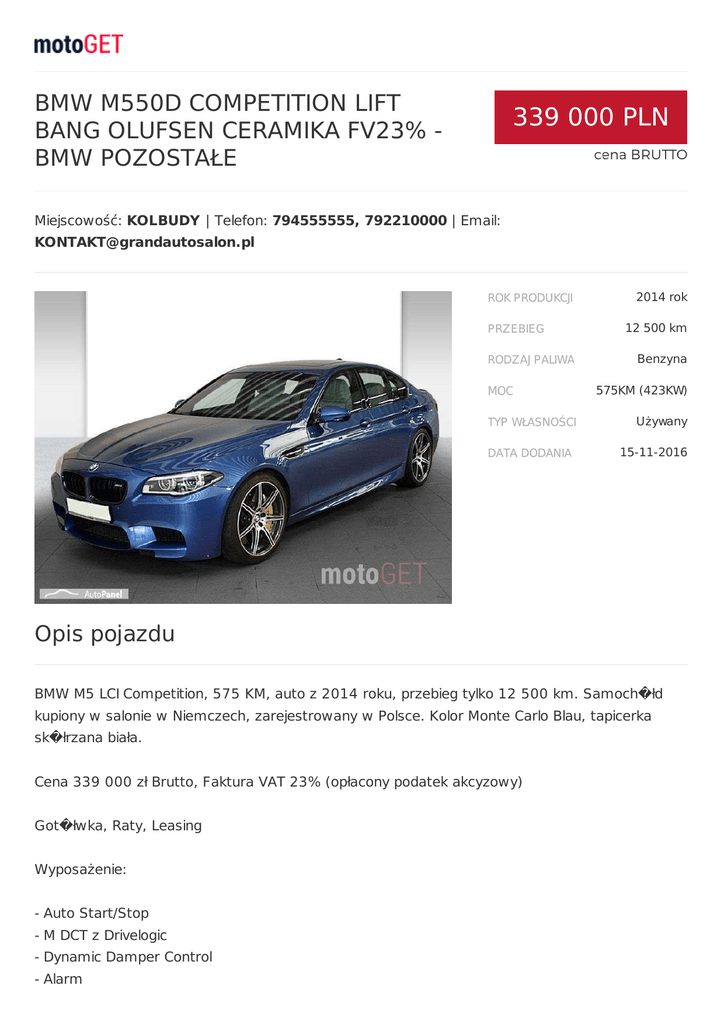 BMW M550D COMPETITION LIFT BANG OLUFSEN CERAMIKA FV23% BMW POZOSTAŁE 339 000 PLN cena BRUTTO Miejscowość: KOLBUDY | Telefon: 794555555, 792210000 | Email: [email protected] 2014 rok 12 500 km Benzyna 575KM (423KW) Używany 15-11-2016 Opis pojazdu BMW M5 LCI Competition, 575 KM, auto z 2014 roku, przebieg tylko 12 500 km. Samoch�łd kupiony w salonie w Niemczech, zarejestrowany w Polsce. Kolor Monte Carlo Blau, tapicerka sk�łrzana biała. Cena 339 000 zł Brutto, Faktura VAT 23% (opłacony podatek akcyzowy) Got�łwka, Raty, Leasing Wyposażenie: - Auto Start/Stop - M DCT z Drivelogic - Dynamic Damper Control - Alarm - Wnetrze wykonczone w aluminiom - Oświelenie ambiente - Podgrzewane fotele prz�łd i tył - Hamulce carbonowo ceramiczne M - Koła 20 cali - System kontroli cisnienia w oponach - Kolumna kierownicza regulowana elektrycznie - Podgrzewana kierownica - Kamera cofania - Klapa bagażnika otwierana automatycznie - Keyless go - Dociaganie drzwi - M multifunkcyjne fotele prz�łd - Klimatyzacja 4 strefy - Szyberdach - Rolety tylnych szyb - Lusterka ściemniane automatycznie - Lane change warning - Active protection - Parktronic - Ledowe reflektory - Connecteddrive - Rozpoznawanie znak�łw - Internet - Bang Olufsen High End Sound - TV - Nawigacja Professional - Head up Display - Cempetition pakiet - M tylny spoiler - Aktywna ochrona pieszych Działamy na rynku od 6 lat. Zapraszamy do naszego salonu Przed wizytą prosimy potwierdzić aktualność oferty Posiadamy wieloletnie kontakty z europejskimi kontrahentami, dzięki czemu możemy zaoferować sprawdzone, bezwypadkowe i serwisowane auta. Gwarantujemy rzeczywisty przebieg i komplet dokument�łw. Wsp�łłpracujemy z największymi firmami leasingowymi w Polsce. - - bezwypadkowy - serwisowany - ASR - kierownica wielofunkcyjna - czujnik parkowania - swiatla przeciwmglowe - skorzana tapicerka - podgrzewane fotele - regulacja wys. nadwozia - ESP - ABS - alufelgi - centr. zamek - el. lusterka - el. szyby - immobiliser - komputer - nawigacja - poduszki - radio z CD - skóra - wsp. kierownicy - tempomat