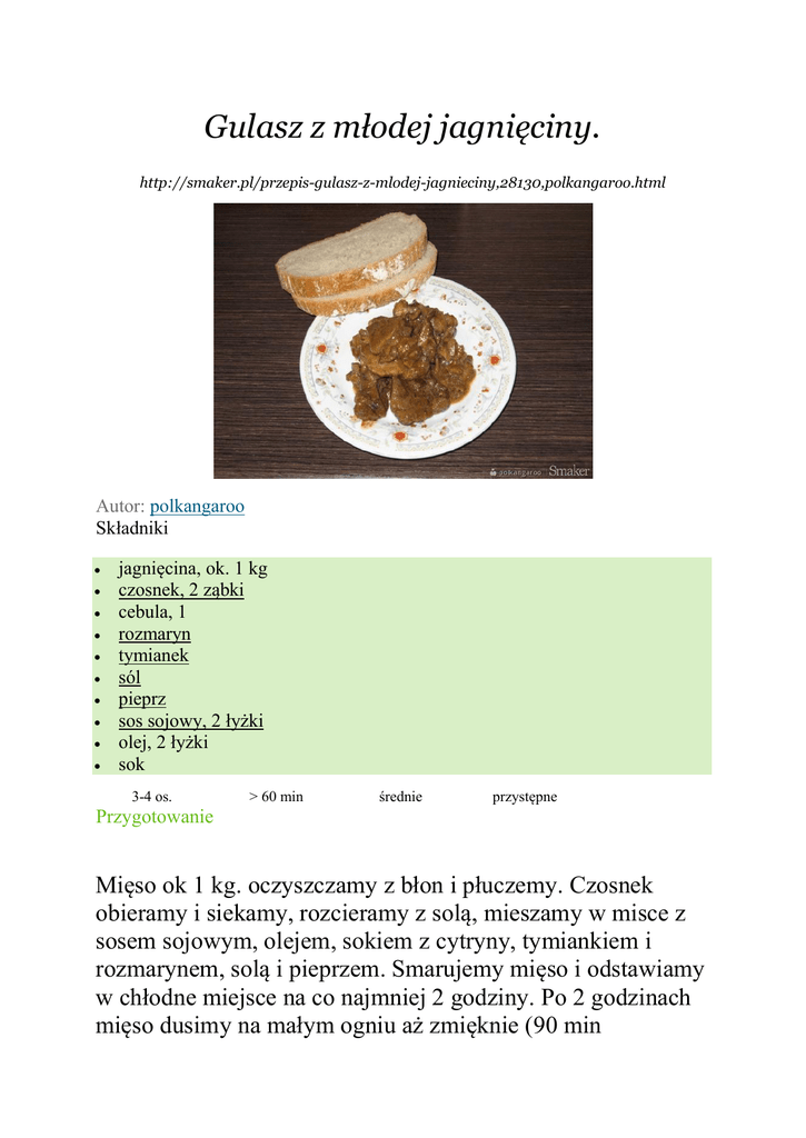 Gulasz z młodej jagnięciny. http://smaker.pl/przepis-gulasz-z-mlodej-jagnieciny,28130,polkangaroo.html Autor: polkangaroo Składniki jagnięcina, ok. 1 kg czosnek, 2 ząbki cebula, 1 rozmaryn tymianek sól pieprz sos sojowy, 2 łyżki olej, 2 łyżki sok 3-4 os. > 60 min średnie przystępne Przygotowanie Mięso ok 1 kg. oczyszczamy z błon i płuczemy. Czosnek obieramy i siekamy, rozcieramy z solą, mieszamy w misce z sosem sojowym, olejem, sokiem z cytryny, tymiankiem i rozmarynem, solą i pieprzem. Smarujemy mięso i odstawiamy w chłodne miejsce na co najmniej 2 godziny. Po 2 godzinach mięso dusimy na małym ogniu aż zmięknie (90 min