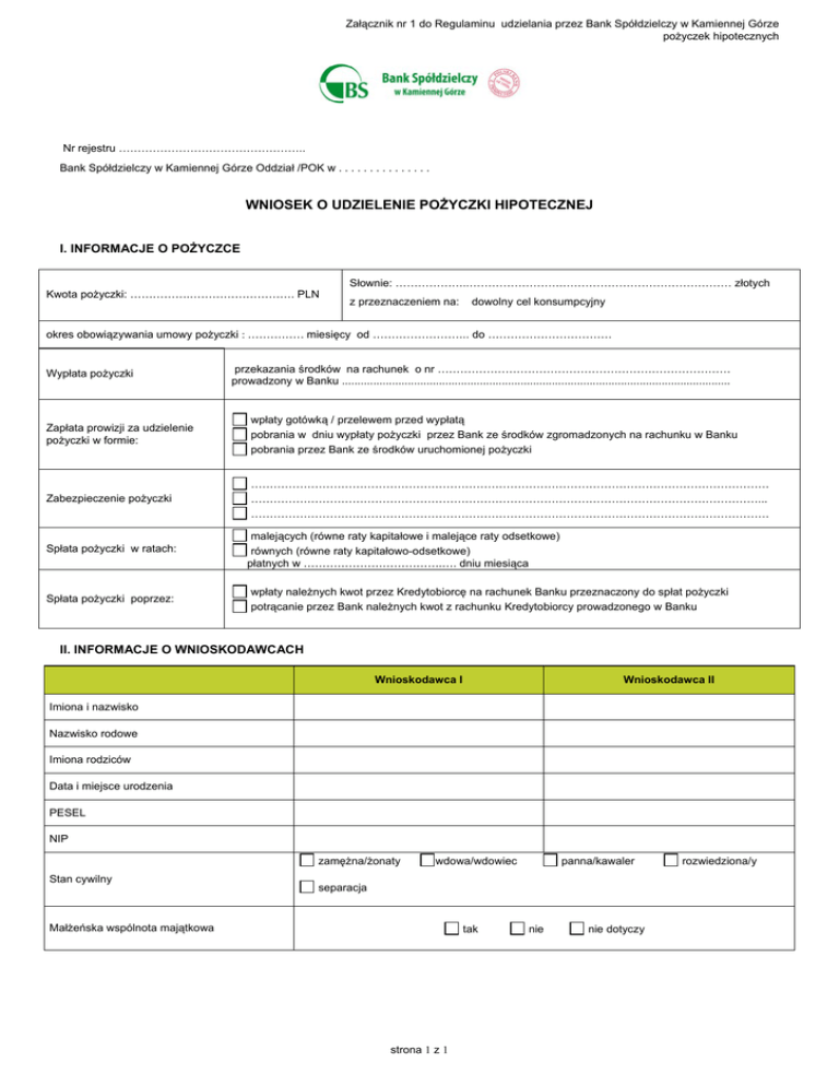 Załącznik nr 1 do Regulaminu udzielania przez Bank Spółdzielczy w Kamiennej Górze pożyczek hipotecznych Nr rejestru ………………………………………….. Bank Spółdzielczy w Kamiennej Górze Oddział /POK w . . . . . . . . . . . . . . . WNIOSEK O UDZIELENIE POŻYCZKI HIPOTECZNEJ I. INFORMACJE O POŻYCZCE Kwota pożyczki: …………….………………………. PLN Słownie: ………………..…………………….……………………………………… złotych z przeznaczeniem na: dowolny cel konsumpcyjny okres obowiązywania umowy pożyczki : …………… miesięcy od …………………….. do …………………………… Wypłata pożyczki przekazania środków na rachunek o nr …………………………………………………………………… prowadzony w Banku ............................................................................................................................ Zapłata prowizji za udzielenie pożyczki w formie: wpłaty gotówką / przelewem przed wypłatą pobrania w dniu wypłaty pożyczki przez Bank ze środków zgromadzonych na rachunku w Banku pobrania przez Bank ze środków uruchomionej pożyczki Zabezpieczenie pożyczki ………………………………………………………………………………………………………………………… ………………………………………………………………………………………………………………………... ………………………………………………………………………………………………………………………… Spłata pożyczki w ratach: Spłata pożyczki poprzez: malejących (równe raty kapitałowe i malejące raty odsetkowe) równych (równe raty kapitałowo-odsetkowe) płatnych w ……………………………….…. dniu miesiąca wpłaty należnych kwot przez Kredytobiorcę na rachunek Banku przeznaczony do spłat pożyczki potrącanie przez Bank należnych kwot z rachunku Kredytobiorcy prowadzonego w Banku II. INFORMACJE O WNIOSKODAWCACH Wnioskodawca I Wnioskodawca II Imiona i nazwisko Nazwisko rodowe Imiona rodziców Data i miejsce urodzenia PESEL NIP zamężna/żonaty Stan cywilny wdowa/wdowiec panna/kawaler separacja Małżeńska wspólnota majątkowa tak strona 1 z 1 nie nie dotyczy rozwiedziona/y Wnioskodawca I Cechy dokumentu tożsamości Adres zamieszkania Adres do korespondencji Nr telefonu (do wyboru) Wykształcenie Rachunek oszczędnościowo rozliczeniowy Wnioskodawca II Nazwa: …………………………………………. Nazwa: ………………………….………………. Seria…………………………………………….. Seria…………………………….……………….. Nr dokumentu: ……………….………………… Nr dokumentu: …………….…….……………… Wydany przez/dnia: ......................................... Wydany przez/dnia: .......................................... Ulica: ………………………….…………………. Ulica: ……………………………………………... Nr domu: ………………….…………………….. Nr domu: …………………………………………. Nr lokalu………………….……………………… Nr lokalu: …………………….…………………… Kod: ……………………………………………... Kod: …………………………….………………… Miejscowość: …………………….…………….. Miejscowość………………….………………….. Ulica……...………………………….…………… Ulica……...…………………….….……………… Nr domu: ……...………………………………… Nr domu: ……...…………………….…………… Nr lokalu: ……...……………...………………… Nr lokalu: ……...…………….…………………… Kod……...………….……….…………………… Kod……...………..…………….………………… Miejscowość: ……...…………………………… Miejscowość: …………....……………………… Adres e-mail ………………………………….. Adres e-mail …………………………………… Stacjonarny…………………………….………… stacjonarny: ……………………………………… komórkowy: ………………………….………….. komórkowy: ……………………….……………… wyższe magisterskie licencjat/inżynier średnie zasadnicze zawodowe podstawowe/gimnazjalne nie posiadam posiadam ROR nr ………………................. ……………………………………………………… w Banku ………………………………………….. wyższe magisterskie licencjat/inżynier średnie zasadnicze zawodowe podstawowe/gimnazjalne nie posiadam posiadam ROR nr …………………………. ......................................................................... w Banku …………………………………………. III. INFORMACJE O DOCHODACH I WYDATKACH Wnioskodawca I Wnioskodawca II Całkowity staż pracy (w latach) / czas prowadzenia obecnej dział. gospodarczej (w latach) Miesięczny dochód netto: Źródła dochodu Liczba osób pozostających we wspólnym gospodarstwie domowym Wydatki stałe gosp. domowego ..................................... PLN, w tym: umowa o pracę: ................................... emerytura: ........................................... renta: ................................................... zasiłek przedemerytalny: ..................... wolne zawody: ..................................... działalność gospodarcza: .................... działalność rolnicza: ............................ umowa cywilno-prawna: ...................... umowa najmu: ..................................... umowa o pracę na czas określony do…….............: