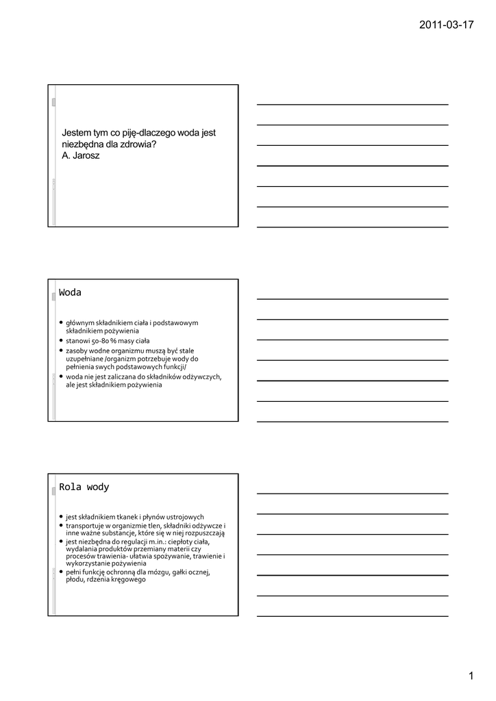 2011-03-17 Jestem tym co piję-dlaczego woda jest niezbędna dla zdrowia? A Jarosz A. Woda • głównym składnikiem ciała i podstawowym składnikiem pożywienia • stanowi 50‐80 % masy ciała • zasoby wodne organizmu muszą być stale uzupełniane /organizm potrzebuje wody do pełnienia swych podstawowych funkcji/ • woda nie jest zaliczana do składników odżywczych, ale jest składnikiem pożywienia Rola wody • jest składnikiem tkanek i płynów ustrojowych • transportuje w organizmie tlen, składniki odżywcze i inne ważne substancje, które się w niej rozpuszczają • jest niezbędna do regulacji m.in.: ciepłoty ciała, j ę g j p y , wydalania produktów przemiany materii czy procesów trawienia‐ ułatwia spożywanie, trawienie i wykorzystanie pożywienia • pełni funkcję ochronną dla mózgu, gałki ocznej, płodu, rdzenia kręgowego 1 2011-03-17 Średnie zapotrzebowanie na wodę zdrowej dorosłej osoby wynosi 2‐2,5l/dobę Źródło IŻŻ: Grupa Wiek( lata) Norma spożycia wody(ml/dobę) niemowlęta 0-0,5 0,5-1 700 800 dzieci 1-3 4-6 7-9 1300 1700 1900 mężczyźni >19 3700 kobiety >19 2700 Spożycie wody w ciąży i okresie karmienia Wzrost o ok. 300 ml/dobę w ciąży Wzrost o ok.600‐800 ml dziennie w okresie karmienia piersią Woda niskozmineralizowana z niską zawartością ą ą sodu, większą magnezu i wapnia grupa z wiek Norma spożycia ml/dobę ciąża 3000 karmienie 3800 Skutki niedoboru wody Odwodnienie: • odwodnienie w granicach 2‐3% masy ciała obniża wydolność fizyczną • niedobór wody sięgający 5‐8% niedobór wody sięgający 5 8% masy ciała powoduje dalsze zaburzenia wydolności fizycznej i psychicznej • utrata wody ustrojowej w ilości około 20% prowadzi do śmierci 2 2011-03-17 Źródła wody ¾ wypijane płyny‐ wszelkiego rodzaju napoje: soki, woda , herbata itd. Przeciętnie większość ludzi wypija ok. 1,6 l / dobę ¾ woda zawarta w pokarmach – zawartość wody jest różna w różnych produktach w rybach woda stanowi ok. 75% masy, a w rybie wędzonej ok. 47% produkty mięsne, jaja, nabiał zawierają 40‐60% kasze, mąki, makarony – 10‐15 % najwięcej wody zawierają warzywa i owoce: jadalna część owoców zawiera 75‐80%, a melon nawet ok. 90%, owoce suszone tylko 12‐16% jedynie w smalcu, cukrze, olejach nie ma wody produkty spożywcze przeciętnie dostarczają ok. 1 l wody • • • • • • • Własna produkcja wody • woda metaboliczna‐ powstaje w wyniku • przemian metabolicznych: białek, tłuszczów i węglowodanów u osób zdrowych stanowi ona ok.200 ‐ 500ml, w zależności od wartości energetycznej pożywienia Źródła dziennego spożycia wody • podstawowym źródłem wody dla organizmu są napoje, w tym woda, soki, herbata itd. ‐stanowią one ok. 62% • warzywa i owoce, które zapewniają ok. 18 % i k ó i j k 8 % mleko, l k napoje mleczne stanowią ok. 10% • pieczywo i produkty zbożowe dostarczają ok.8% • mięso i jego 2% 3 2011-03-17 Wzrost zapotrzebowania na wodę w stanach fizjologicznych: • wzmożony wysiłek fizyczny (intensywne ćwiczenia, ciężka praca fizyczna) • wysokie temperatury otoczenia /wynika to z konieczności wyrównania ubytków wody związanych z przyspieszonym oddychaniem i poceniem się/ • odpowiednie nawodnienie dodatnio wpływa na cerę w procesie starzenia się organizmu Wzrost zapotrzebowania na wodę w wielu procesach chorobowych: • w zapobieganiu i leczeniu kamicy nerkowej /osoba z • • • • • kamicą nerkową powinna wypijać około 3‐3,5l płynów/ w chorobach przebiegających z gorączką, w biegunkach o różnej etiologii w zaparciach w zespole jelita drażliwego w dietach: dieta niskoenergetyczna, dieta cukrzycowa Spożycie wody ‐ spożycie wody mineralnej w Polsce wciąż rośnie ‐ spożycie w 2005 r. wynosiło 41l /osobę (Canadean)‐ ponad 110ml dziennie ‐ wzrost spożycia do ponad 50 litrów w 2007 r wzrost spożycia do ponad 50 litrów w 2007 r. ‐ ilościowe udziały wody mineralnej gazowanej i niegazowanej rozkładają się po połowie ‐obecnie ok. 68l/rok/osobę‐ 1 szklanka wody 4 2011-03-17 Woda a masa ciała woda dostarcza zero kalorii pita między posiłkami zmniejsza poczucie głodu pita przed posiłkiem często powoduje zmniejszenie ilości spożywanych pokarmów Dlaczego ? Zaspakaja „ pragnienie” jedzenia ? Daje poczucie pełności? Wpływa na OUN? Ubytek masy ciała u osób dorosłych, które przez 12 tygodni piły wodę jako uzupełnienie diety (500 ml przed każdym głównym posiłkiem) ( Denis EA 2009) Udział % wypijanej wody dziennie wśród wszystkich wypijanych płynów dziennie w zależności od poziomu wykształcenia(TNS OBOP, , Żywiec Zdrój, IŻŻ,2010) 5 2011-03-17 6