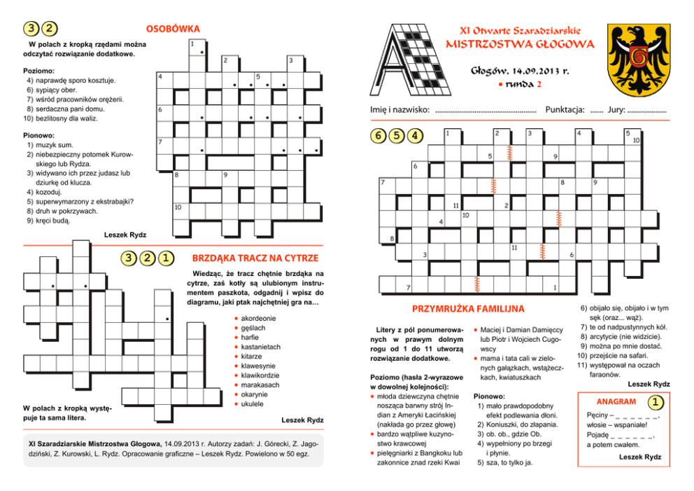 3 2 XI Otwarte Szaradziarskie OSOBÓWKA W polach z kropką rzędami można odczytać rozwiązanie dodatkowe. Poziomo: 4) naprawdę sporo kosztuje. 6) sypiący ober. 7) wśród pracowników orężerii. 8) serdaczna pani domu. 10) bezlitosny dla waliz. MISTRZOSTWA GŁOGOWA 1 2 3 4 Głogów, 14.09.2013 r. • runda 2 5 6 Pionowo: 1) muzyk sum. 2) niebezpieczny potomek Kurowskiego lub Rydza. 3) widywano ich przez judasz lub dziurkę od klucza. 4) kozoduj. 5) superwymarzony z ekstrabajki? 8) druh w pokrzywach. 9) kręci budą. Imię i nazwisko: ...................................................... 3 5 8 9 4 5 10 9 7 8 4 9 2 11 10 10 8 3 BRZDĄKA TRACZ NA CYTRZE Wiedząc, że tracz chętnie brzdąka na cytrze, zaś kotły są ulubionym instrumentem paszkota, odgadnij i wpisz do diagramu, jaki ptak najchętniej gra na… W polach z kropką występuje ta sama litera. 2 6 Leszek Rydz 3 2 1 1 6 5 4 7 Punktacja: ....... Jury: ..................... • • • • • • • • • • akordeonie gęślach harfie kastanietach kitarze klawesynie klawikordzie marakasach okarynie ukulele XI Szaradziarskie Mistrzostwa Głogowa, 14.09.2013 r. Autorzy zadań: J. Górecki, Z. Jagodziński, Z. Kurowski, L. Rydz. Opracowanie graficzne – Leszek Rydz. Powielono w 50 egz. 6 1 7 PRZYMRUŻKA FAMILIJNA Litery z pól ponumerowanych w prawym dolnym rogu od 1 do 11 utworzą rozwiązanie dodatkowe. Leszek Rydz 11 Poziomo (hasła 2-wyrazowe w dowolnej kolejności): • młoda dziewczyna chętnie nosząca barwny strój Indian z Ameryki Łacińskiej (nakłada go przez głowę) • bardzo wątpliwe kuzynostwo krawcowej • pielęgniarki z Bangkoku lub zakonnice znad rzeki Kwai • Maciej i Damian Damięccy lub Piotr i Wojciech Cugowscy • mama i tata cali w zielonych gałązkach, wstążeczkach, kwiatuszkach Pionowo: 1) mało prawdopodobny efekt podlewania dłoni. 2) Koniuszki, do złapania. 3) ob. ob., gdzie Ob. 4) wypełniony po brzegi i płynie. 5) sza, to tylko ja. 6) obijało się, obijało i w tym sęk (oraz... wąż). 7) te od nadpustynnych kół. 8) arcytycie (nie widzicie). 9) można po mnie dostać. 10) przejście na safari. 11) występował na oczach faraonów. Leszek Rydz ANAGRAM 1 Pęciny – _ _ _ _ _ _ , włosie – wspaniałe! Pojadę _ _ _ _ _ _ , a potem cwałem. Leszek Rydz 2 2 1 ODWROTKA Do diagramu należy wpisać dwuwyrazowe określenia podanych słów. Litery z pól od 1 do 13 utworzą rozwiązanie dodatkowe – objaśnienie słowa „meta”. 1 2 9 3 KRZYŻÓWKA Z WĘŻEM Litery z kolorowych pól, odczytane ciągiem, utworzą rozwiązanie dodatkowe – przysłowie. 1 2 3 PANTROPA Litery z pól ponumerowanych dodatkowo od 1 do 11 utworzą rozwiązanie dodatkowe. Odgadnięte wyrazy wpisz wzdłuż pogrubionych linii. Dopisane litery utworzą cytat z wiersza Konstantego Ildefonsa Gałczyńskiego. 1 4 2 4 6 3 1 O Z 6 10 4 9 2 5 5 4 3 1 2 3 4 5 6 7 8 9 10 Poziomo: 3) wójt. 5) odzew. 6) atom. 11 12 8 13 Pionowo: 1) zapas. 2) tubka. 4) detal. Początkowe litery wpisywanych haseł: MJ, NH, NP, PG, PH, ZM. 7 Poziomo: 2) Marcin Fyrstenberg i Mariusz Matkowski. 5) w rękach woźnicy. 6) dawna nazwa biretu (odszukaj wspak w imieniu słynnego indiańskiego wodza). 7) lądownik statku kosmicznego. 8) członek załogi samolotu, tkwi w astrokopule. Pionowo: 1) żona Mieszka I, matka Bolesława Chrobrego. 2) ktoś o wielkiej sile twórczej; artysta. 3) hulaka, birbant. 4) mąż Mickiewiczowskiej Grażyny. Józef Górecki Zbigniew Kurowski 2 1 JOLKA W CENTRALI RYBNEJ Litery z pól od 1 do 8 utworzą hasło dodatkowe. 2 1 8 4 I 4 I 3 1 8 1 7 6 P S O A U E I N T Z C A E C A Ł U I N 5 11 12 6 11 7 13 7 2 5 5 3 WYKSZTAŁCONA KRZYŻÓWKA 3 6 G 5 • rodzaj śledzia (wspólne objaśnienie 3 słów) • ryba mulistych akwenów • podobny do leszcza, posiada te same spółgłoski, 9 2 7 10 8 hodowana 8 Co ma lub przypomina kształt... Poziomo: 2) precla. 5) meduzy. 7) łazanki. 9) wanilii. Pionowo: 1) nerki. 3) ślimacznicy. 4) granatu. 5) liry. 6) rogala. 8) torpedy. Zbigniew Kurowski LOGOGRYF Dodatkowe rozwiązanie utworzą litery odczytane wzdłuż zaznaczonej linii. 1 1 2 • • • • • • • • • • • przed Juliuszem Cezarem kawałek wilka morskiego poszepcze, nim obali temperówka buraczków co jest grane przeczeszą w ogrodzie chłopcy do szycia na tronie w Albionie i Avalonie biedaczysko z firmamentem borowiczki? te lale scalę z Leoncavallem Leszek Rydz 3 KALAMBUR WIĄZANY 1) rondelek do smażenia mięsa. 2) imię astronauty Aldrina, płotkarza Mosesa. 3) ułatwia napełnianie butelki. • rybie jaja Józef Górecki P S Z A R Z R T O R 6 co karp • ma ostre zęby, żyje w dorzeczu Amazonki • smaczna ryba azjatycka, ponoć niehumanitarnie U T Zbigniew Kurowski Zbytki pani Ordonówny są w zwyczaju, kiedy wszyscy naraz chcą wsiąść do tramwaju. 1 Leszek Rydz SZYFROGRAM ptasi 1 1 2 3 Wszystkie litery, napisane od 1 do 21, utworzą rozwiązanie – aforyzm Lecha Konopińskiego. 13 16 21 17 2 4 8 7 14 3 5 11 19 12 18 9 10 20 15 6 1 1 2 3 4 5 6 7 8 9 10 11 12 13 14 15 16 17 18 19 20 21 13) ptaki podobne do jaskółek. 7) ptasia (kląskanie, trele) lub kurza ...! (przekleństwo). 18) ptak brodzący o nagiej szyi. Po skosie: 13) zięba ..., ptak z białym kuprem. Zbigniew Kurowski 1 Wn 4 7 5 1 KOLANKA PP II KK DD EE M M CC JJ AA 14 24 9 13 5 10 17 18 27 7 Poziomo: 1) Brodka – Monika, Broda – ? 4) chart – Kusy, bernardyn – ? 7) apetyt – aperitif, pożądanie – ? 9) John Lennon – żuki, Jim Morrison – ? 10) alkoholiczka – Piłat, praczka – ? 25 2 1 22 9 12 16 EE 4 28 LL 11 15 1 AA 26 29 2 3 4 5 6 7 8 9 10 11 12 13 14 15 16 17 18 19 20 21 22 23 24 25 26 27 28 29 SS CC 10 19 6 21 20 8 3 RR W kolorowe kolanka wpisz 4 dwuwyrazowe, powiązane ze sobą hasła, tak aby powstała krzyżówka. Leszek Rydz P 2 N TEKA+ Leszek Rydz REBUS ANAGRAMOWY Muzyka POP Pet Shop Boys Madonna Bee Gees Muzyka 2 23 1 Pionowo: 1) Jagienka – Zych, Danusia – ? 2) udekoruj – ustrój, pomniejsz – ? 3)