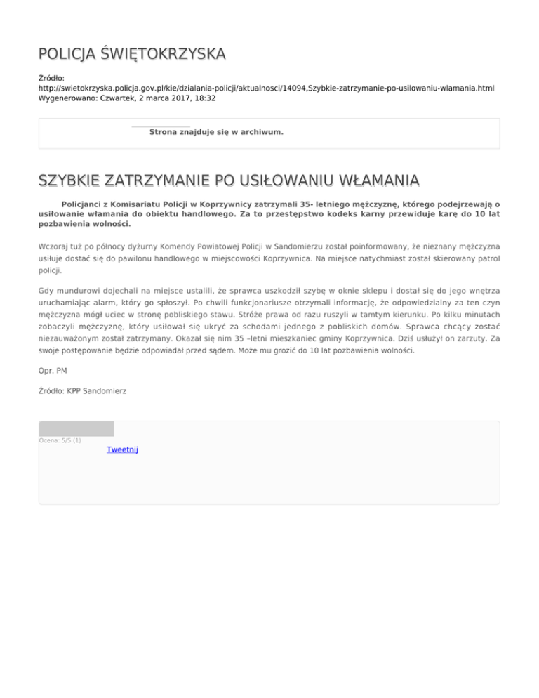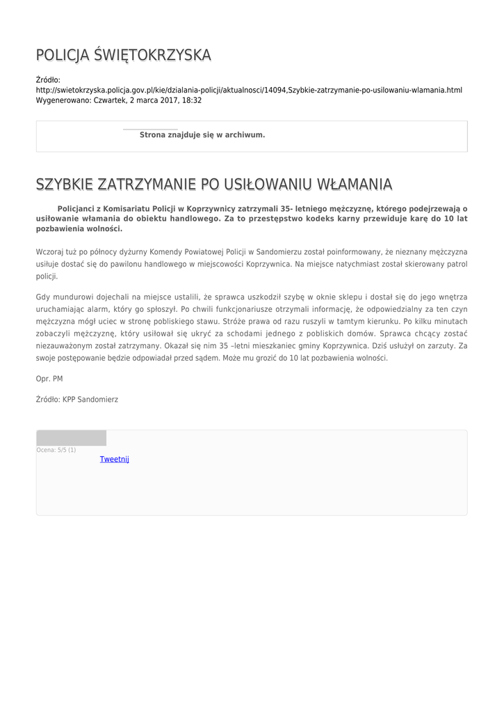POLICJA ŚWIĘTOKRZYSKA Źródło: http://swietokrzyska.policja.gov.pl/kie/dzialania-policji/aktualnosci/14094,Szybkie-zatrzymanie-po-usilowaniu-wlamania.html Wygenerowano: Czwartek, 2 marca 2017, 18:32 Strona znajduje się w archiwum. SZYBKIE ZATRZYMANIE PO USIŁOWANIU WŁAMANIA Policjanci z Komisariatu Policji w Koprzywnicy zatrzymali 35- letniego mężczyznę, którego podejrzewają o usiłowanie włamania do obiektu handlowego. Za to przestępstwo kodeks karny przewiduje karę do 10 lat pozbawienia wolności. Wczoraj tuż po północy dyżurny Komendy Powiatowej Policji w Sandomierzu został poinformowany, że nieznany mężczyzna usiłuje dostać się do pawilonu handlowego w miejscowości Koprzywnica. Na miejsce natychmiast został skierowany patrol policji. Gdy mundurowi dojechali na miejsce ustalili, że sprawca uszkodził szybę w oknie sklepu i dostał się do jego wnętrza uruchamiając alarm, który go spłoszył. Po chwili funkcjonariusze otrzymali informację, że odpowiedzialny za ten czyn mężczyzna mógł uciec w stronę pobliskiego stawu. Stróże prawa od razu ruszyli w tamtym kierunku. Po kilku minutach zobaczyli mężczyznę, który usiłował się ukryć za schodami jednego z pobliskich domów. Sprawca chcący zostać niezauważonym został zatrzymany. Okazał się nim 35 –letni mieszkaniec gminy Koprzywnica. Dziś usłużył on zarzuty. Za swoje postępowanie będzie odpowiadał przed sądem. Może mu grozić do 10 lat pozbawienia wolności. Opr. PM Źródło: KPP Sandomierz Ocena: 5/5 (1) Tweetnij