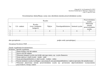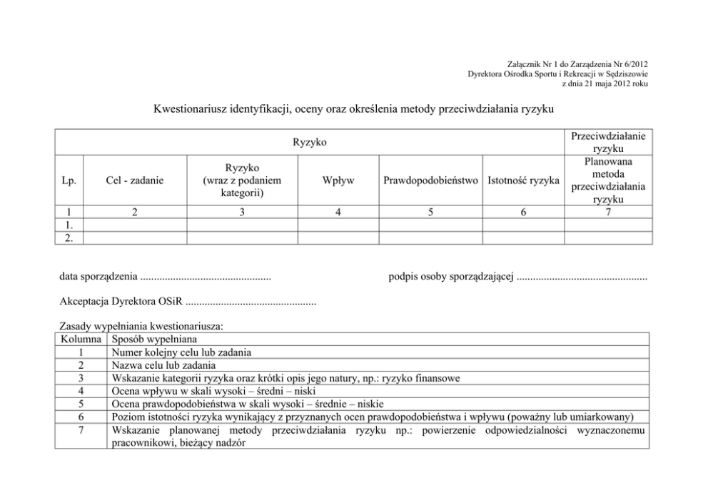 Załącznik Nr 1 do Zarządzenia Nr 6/2012 Dyrektora Ośrodka Sportu i Rekreacji w Sędziszowie z dnia 21 maja 2012 roku Kwestionariusz identyfikacji, oceny oraz określenia metody przeciwdziałania ryzyku Ryzyko Lp. Cel - zadanie Ryzyko (wraz z podaniem kategorii) Wpływ 1 1. 2. 2 3 4 data sporządzenia ................................................ Prawdopodobieństwo Istotność ryzyka 5 6 Przeciwdziałanie ryzyku Planowana metoda przeciwdziałania ryzyku 7 podpis osoby sporządzającej ................................................ Akceptacja Dyrektora OSiR ................................................ Zasady wypełniania kwestionariusza: Kolumna Sposób wypełniana 1 Numer kolejny celu lub zadania 2 Nazwa celu lub zadania 3 Wskazanie kategorii ryzyka oraz krótki opis jego natury, np.: ryzyko finansowe 4 Ocena wpływu w skali wysoki – średni – niski 5 Ocena prawdopodobieństwa w skali wysoki – średnie – niskie 6 Poziom istotności ryzyka wynikający z przyznanych ocen prawdopodobieństwa i wpływu (poważny lub umiarkowany) 7 Wskazanie planowanej metody przeciwdziałania ryzyku np.: powierzenie odpowiedzialności wyznaczonemu pracownikowi, bieżący nadzór