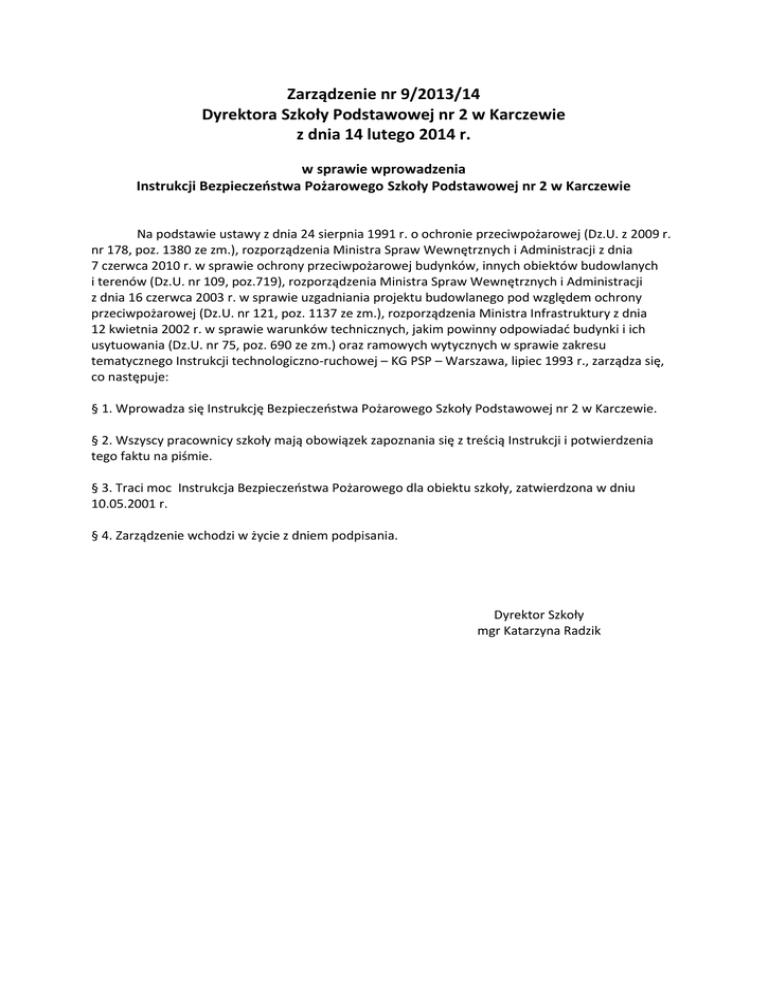 Zarządzenie nr 9/2013/14 Dyrektora Szkoły Podstawowej nr 2 w Karczewie z dnia 14 lutego 2014 r. w sprawie wprowadzenia Instrukcji Bezpieczeństwa Pożarowego Szkoły Podstawowej nr 2 w Karczewie Na podstawie ustawy z dnia 24 sierpnia 1991 r. o ochronie przeciwpożarowej (Dz.U. z 2009 r. nr 178, poz. 1380 ze zm.), rozporządzenia Ministra Spraw Wewnętrznych i Administracji z dnia 7 czerwca 2010 r. w sprawie ochrony przeciwpożarowej budynków, innych obiektów budowlanych i terenów (Dz.U. nr 109, poz.719), rozporządzenia Ministra Spraw Wewnętrznych i Administracji z dnia 16 czerwca 2003 r. w sprawie uzgadniania projektu budowlanego pod względem ochrony przeciwpożarowej (Dz.U. nr 121, poz. 1137 ze zm.), rozporządzenia Ministra Infrastruktury z dnia 12 kwietnia 2002 r. w sprawie warunków technicznych, jakim powinny odpowiadać budynki i ich usytuowania (Dz.U. nr 75, poz. 690 ze zm.) oraz ramowych wytycznych w sprawie zakresu tematycznego Instrukcji technologiczno-ruchowej – KG PSP – Warszawa, lipiec 1993 r., zarządza się, co następuje: § 1. Wprowadza się Instrukcję Bezpieczeństwa Pożarowego Szkoły Podstawowej nr 2 w Karczewie. § 2. Wszyscy pracownicy szkoły mają obowiązek zapoznania się z treścią Instrukcji i potwierdzenia tego faktu na piśmie. § 3. Traci moc Instrukcja Bezpieczeństwa Pożarowego dla obiektu szkoły, zatwierdzona w dniu 10.05.2001 r. § 4. Zarządzenie wchodzi w życie z dniem podpisania. Dyrektor Szkoły mgr Katarzyna Radzik