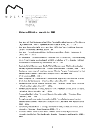 Biblioteka MOCAK-u – nowości, luty 2015 Aoki Noe : All that floats down / Aoki Noe, Toyota Municipal Museum of Art, Nagoya City Art Museum. - Aichi : Toyota Municipal Museum of Art, 2012 r. - 136 s. Aoki Noe : Embracing Light: iron / Aoki Noe, HAS II, Lee Yoon Jin Gallery, Keumsan Gallery. - Hashimoto Art Office, 2007 r. - 1 t. Aoki Noe : Protoplasm / Aoki Noe, Hashimoto Art Office. - Tokio : Hashimoto Art Office, 2014 r. - 192 s. Art Is Freedom : Exhibition of Works From The MOCAK Collection / Yuriy Hnatkovsky, Maria Anna Potocka, Monika Kozioł, MOCAK, Lviv Palace of Art. - Kraków : MOCAK Muzeum Sztuki Współczesnej w Krakowie, 2014 r. - 40 s. Bakakaj : Witold Gombrowicz: Dzieła / Witold Gombrowicz, Rita Gombrowicz, Jan Błoński, Wydawnictwo Literackie. - Kraków : Wydawnictwo Literackie, 1986 . - 204 s. Bioetyka w epoce nowych mediów / Joanna Żylińska, Patrycja Poniatowska, Instytut Badań Literackich PAN. - Warszawa : Instytut Badań Literackich PAN Wydawnictwo, 2013 . - 268 s. Bitwa o Legnicę : W 14 wierszach 27 prozach i 66 zdjęciach / Artur Burszta, Mariusz Grzebalski, Bohdan Zadura. - Wrocław : Biuro Literackie, 2004 . - 136 s. Bohdan Zadura : Szkice, recenzje, felietony tom 1 / Bohdan Zadura, Biuro Literackie. - Wrocław : Biuro Literackie, 2007 . - 544 s. Bohdan Zadura : Szkice, recenzje, felietony tom 2 / Bohdan Zadura, Biuro Literackie. - Wrocław : Biuro Literackie, 2007 . - 520 s. Centrum likwidacji szkód / Krzysztof Siwczyk, Biuro Literackie. - Wrocław : Biuro Literackie, 2008 . - 38 s. Czasopisma społeczno-kulturalne w okresie PRL / Urszula Jakubowska, Instytut Badań Literackich PAN. - Warszawa : Instytut Badań Literackich PAN Wydawnictwo, 2012. - 593 s. Dokumenty mające służyć za kanwę / Raymond Roussel, Andrzej Sosnowski, Biuro Literackie. - Wrocław : Biuro Literackie, 2008 . - 73 s. Dramaty : Witold Gombrowicz: Dzieła / Witold Gombrowicz, Wydawnictwo Literackie, Jan Błoński, Rita Gombrowicz Kraków : Wydawnictwo Literackie, 1986 . 326 s. 1 Drogi mojego życia : wspomnienia skrzypaczki z Birkenau / Helena Dunicz-Niwińska, Maria Szewczyk. - Oświęcim : Państwowe Muzeum Auschwitz-Birkenau, 2013. - 181 s. Dymy nad Birkenau / Seweryna Szmaglewska. - Wyd. 21. Warszawa : Wydawnictwo "Książka i Wiedza", 2012. - 334, [2] s. Dzieła, języki, tradycje / Ryszard Nycz, Włodzimierz Bolecki, Instytut Badań Literackich PAN. - Warszawa : Instytut Badań Literackich PAN Wydawnictwo, 2006 . - 395 s. Dziennik 1953-1956 : Witold Gombrowicz: Dzieła / Witold Gombrowicz, Rita Gombrowicz, Jan Błoński, Wydawnictwo Literackie. - Kraków : Wydawnictwo Literackie, 1986 . - 376 s. Dziennik 1957-1961 : Witold Gombrowicz: Dzieła / Witold Gombrowicz, Rita Gombrowicz, Jan Błoński, Wydawnictwo Literackie. - Kraków : Wydawnictwo Literackie, 1986 . - 308 s. Dziennik 1961-1966 : Witold Gombrowicz: Dzieła / Witold Gombrowicz, Rita Gombrowicz, Jan Błoński, Wydawnictwo Literackie. - Kraków : Wydawnictwo Literackie, 1986 . - 264 s. Dziennik 1967-1969 : Witold Gombrowicz: Dzieła / Witold Gombrowicz, Rita Gombrowicz, Jan Błoński, Wydawnictwo Literackie. - Kraków : Wydawnictwo Literackie, 1986 . - 188 s. Europa i jej narody / Krzysztof Pomian, Państwowy Instytut Wydawniczy. - Warszawa : Państwowy Instytut Wydawniczy, 1992 . - 220 s. Ferdydurke : Witold Gombrowicz: Dzieła / Witold Gombrowicz, Rita Gombrowicz, Jan Błoński, Wydawnictwo Literackie. - Kraków : Wydawnictwo Literackie, 1986 . 276 s. Fotograf z Auschwitz / Anna Dobrowolska, Wilhelm Brasse, Instytut Pamięci Narodowej. - Warszawa : Grupa Filmowa REKONTRPLAN, 2013. - 282, [6] s. G / Ryszard Krynicki, Maria Anna Potocka, MOCAK. - wyd. II. - Kraków : MOCAK Muzeum Sztuki Współczesnej w Krakowie, 2014 r. - 21 s. Gdybym wiedział : Rozmowy z Ryszardem Krynickim / Ryszard Krynicki, Maria Anna Potocka, Biuro Literackie. - Wrocław : Biuro Literackie, 2014 . - 268 s. Graficzny warsztat ekspresjonisty : Linoryty i rysunki Stefana Szmaja (1893-1970) / Stefan Szmaj, Galeria Piekary, Agnieszka Salamon-Radecka. - Poznań : Galeria Piekary, 2014 r. - 136 s. Grudzień 1970 / Zygmunt Korybutowicz, Instytut Literacki. - Paryż : Instytut Literacki, 1983 . - 160 s. 2 Holokaust : auto(tanato)grafie / Aleksandra Ubertowska, Instytut Badań Literackich PAN. - Warszawa : Instytut Badań Literackich PAN. - Wydawnictwo, 2014 . - 367 s. Idea potencjalności : możliwość filozofii według Giorgio Agambena / Paweł Mościcki, Instytut Badań Literackich PAN. - Warszawa : Instytut Badań Literackich PAN Wydawnictwo, 2012 . - 429 s. Jan Mioduszewski. Fabryka mebli / Jan Mioduszewski, Dorota Folga-Januszewska, Agnieszka Rayzacher, Janek Owczarek. - Warszawa : Fundacja Lokal Sztuki / Lokal_30, 2015 r. - 207 s. Kadysz. Strony o Tadeuszu Kantorze / Jan Kott, Tadeusz Kantor, Wydawnictwo słowo/obraz terytoria. - Gdańsk : słowo/obraz terytoria, 1997 . - 53 s. Komos : Witold Gombrowicz: Dzieła / Witold Gombrowicz, Rita Gombrowicz, Jan Błoński, Wydawnictwo Literackie. - Kraków : Wydawnictwo Literackie, 1986 . - 152 s. I Międzynarodowe Biennale plakatu społeczno-politycznego / Leszek Szuster, Elżbieta Pasternak, Beata Kozłowska et. al. . - Oświęcim : Fundacja na Rzecz Międzynarodowego Domu Spotkań Młodzieży, 2006. - 45, [12] s. II Międzynarodowe Biennale plakatu społeczno-politycznego / Beata Kozłowska, Leszek Szuster, Paweł Warchoł et. al. - Oświęcim : Fundacja na Rzecz Międzynarodowego Domu Spotkań Młodzieży, 2008. - 41, [16] s. III Międzynarodowe Biennale plakatu społeczno-politycznego / Joanna Klęczar, Leszek Szuster, Paweł Warchoł et. al. - Oświęcim : Fundacja na Rzecz Międzynarodowego Domu Spotkań Młodzieży, 2010. - 43, [17] s. V Międzynarodowe Biennale plakatu społeczno-politycznego / Paweł Warchoł, Bożena Grzywa, Leszek Szuster. - Oświęcim : Fundacja na Rzecz Międzynarodowego Domu Spotkań Młodzieży, 2014. - 52, [18] s. Modalność modernizmu : studia, analizy, interpretacje / W