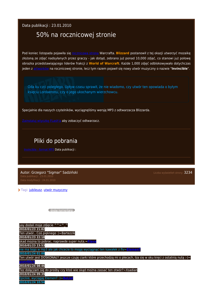 Data publikacji : 23.01.2010 50% na rocznicowej stronie Pod koniec listopada pojawiła się rocznicowa strona Warcrafta. Blizzard postanowił z tej okazji utworzyć mozaikę złożoną ze zdjęć nadsyłanych przez graczy - jak dotąd, zebrano już ponad 10,000 zdjęć, co stanowi już połowę obrazka przedstawiającego liderów frakcji z World of Warcraft. Każde 1,000 zdjęć odblokowywało dotychczas jeden z artworków na rocznicowej stronie, lecz tym razem pojawił się nowy utwór muzyczny o nazwie "Invincible". Oda ku czci poległego. Upływ czasu sprawił, że nie wiadomo, czy utwór ten opowiada o byłym księciu Lordaeronu, czy o jego ukochanym wierzchowcu. Specjalnie dla naszych czytelników, wyciągnęliśmy wersję MP3 z odtwarzacza Blizzarda. Zainstaluj wtyczkę FLash'a aby zobaczyć odtwarzacz. Pliki do pobrania Invincible - format MP3 Data publikacji : Autor: Grzegorz "Sigmar" Sadziński Liczba wyświetleń strony: 3234 Data publikacji : 23.01.2010 Data modyfikacji : 24.01.2010 Tagi: jubileusz, utwór muzyczny Komentarz (8) dodaj komentarz yay dodali moje zdjęcie ^^~^_^ 2010/01/23 21:02 Ten utwór.. Coś pięknego :)~Bartezzik 2010/01/23 22:18 skad mozna to pobrac, naprawde super nuta.~Flava 2010/01/23 23:53 nie ma tego w mp3 ale jak chcecie to mogę wyciągnąć ten kawałek z flv~ElemenT 2010/01/24 01:00 Ten utwór jest DOSKONAŁY jeszcze czuję ciarki które przechodzą mi o plecach, łza się w oku kręci z ostatnią nutą :-)~ pietr00ch 2010/01/24 08:46 Tez dołączam się do prośby czy ktoś wie skąd można zassać ten otwór?~Xsadian 2010/01/24 09:39 Epickie, wyciągaj ElemenT :)~BeLial 2010/01/24 10:54 link do pliku znajduje się w newsie, nie wklejajcie tutaj kolejnych "mirrorów"~ElemenT 2010/01/24 19:39 dodaj komentarz Pozostałe nowości Zapowiedź zmian w klasach - Mnich Legion wkroczył w fazę alfa testów w czasie których dostępna jest póki co jedynie lokacja startowa łowców demonów, a my przyglądamy się temu, jakich zmian doczeka się klasa, która stosunkowo niedawno pojawiła się w World of Warcraft. Oto co na najnowszy dodatek Blizzard przygotował dla mnichów.Data publikacji: 24.11.20150 Zapowiedź zmian w klasach - Wojownik Po krótkiej przerwie wracamy z tłumaczeniami blogów poświęconych zmianom, jakie pojawią się w klasach w nadchodzącym dodatku do World of Warcraft. Oto czego powinni spodziewać się wojownicy z Azeroth w LegionieData publikacji: 23.11.20150 Zapowiedź zmian w klasach - Szaman Kolejna zapowiedzieć, która pojawiła się jakiś czas temu na łamach oficjalnej strony społecznościowej dotyczy szamana. Największe zmiany w przypadku tej klasy dotknęły totemy oraz system zasobów specjalizacji Elemental oraz EnhancementData publikacji: 16.11.20150 11 urodziny World of Warcraft World of Warcraft obchodzi już swoje 11 urodziny. Z tej okazji Blizzard przygotował kilka zabawek, które powinny wszystkim przypomnieć sam początek przygody w świecie Azeroth - w rolach głównych Edwin VanCleef, Hogger, murlok oraz Windfury (w wersji nadmuchiwanej).Data publikacji: 16.11.20150 Zapowiedź zmian w klasach - Rycerz śmierci Kolejna zapowiedź opublikowana na łamach oficjalnej strony społecznościowej World of Warcraft poświęcona jest klasie rycerzy śmierci. Poniżej znajdziecie informacje między innymi o ujednoliceniu wszystkich run oraz nowej umiejętności specjalizacji Blood, która została zainspirowana Lordem Marrowgarem z Icecrown Citadel.Data publikacji: 15.11.20150 Wszystkie nowości