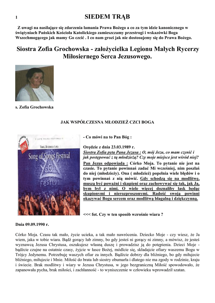 1 SIEDEM TRĄB Z uwagi na nasilające się zdarzenia łamania Prawa Bożego a co za tym idzie kanonicznego w świątyniach Pańskich Kościoła Katolickiego zamieszczamy przestrogi i wskazówki Boga Wszechmogącego jak mamy Go czcić . I co nam grozi jak nie dostosujemy się do Prawa Bożego. Siostra Zofia Grochowska - założycielka Legionu Małych Rycerzy Miłosiernego Serca Jezusowego. s. Zofia Grochowska JAK WSPÓŁCZESNA MŁODZIEŻ CZCI BOGA - Co mówi na to Pan Bóg : Orędzie z dnia 23.03.1989 r. Siostra Zofia pyta Pana Jezusa : O, mój Jezu, co mam czynić i jak postępować z tą młodzieżą? Czy moje miejsce jest wśród niej? Pan Jezus odpowiada : Córko Moja. To pytanie nie jest na czasie. To pytanie powinnaś zadać Mi wcześniej, nim poszłaś do niej (młodzieży). Ona ( młodzież) popełnia wiele błędów i o tym powinnaś z nią mówić. Gdy schodzą się na modlitwę, muszą być poważni i skupieni oraz zachowywać się tak, jak Ja, bym był z nimi. O wiele więcej doznaliby łask będąc skupionymi i nierozproszonymi. Radość swoją powinni okazywać Bogu sercem oraz modlitwą błagalną i dziękczynną. <<< fot. Czy w ten sposób wzrośnie wiara ? Dnia 09.09.1990 r. Córko Moja. Czasu tak mało, życie ucieka, a tak mało nawrócenia. Dziecko Moje - czy wiesz, że Ja wiem, jaka w tobie wiara. Bądź gorący lub zimny, bo gdy jesteś ni gorący ni zimny, a mówisz, że jesteś wyznawcą Jezusa Chrystusa, oszukujesz własną duszę i prowadzisz ją do potępienia. Dzieci Moje bądźcie czujne na ostatnie czasy, żyjcie w łasce Bożej, módlcie się, składajcie ofiary waszemu Bogu w Trójcy Jedynemu. Potrzebuję waszych ofiar za innych. Bądźcie dobrzy dla bliźniego, bo gdy miłujecie bliźniego, miłujecie i Mnie. Miłość do brata lub siostry obumarła i dlatego nie ma zgody w rodzinie, kraju i świecie. Brak modlitwy i wiary w Jezusa Chrystusa, w jego bezgraniczną Miłość spowodowało, że zapanowała pycha, brak miłości, i zachłanność - to wyniszczenie w człowieku wprowadził szatan. 2 Bardzo dużo młodzieży odeszło od Boga i wiary w Niebo - to wina rodziców. Sami chodzą w ciemności i swoje dzieci prowadzą na zatracenie. Młodzież będzie umierać przedwcześnie, będę ich zabierał, aby w ten sposób ratować ich od potępienia. W tych czasach będą was wołać, głosem boleści Ojca waszego, o nawrócenie do Boga. Proście, dzieci Moje, o Miłosierdzie Boże dla siebie i dla bliźnich. <<< Czy to nie przypomina jakiegoś transu , na jakie siły się otwierają ci młodzi ludzie ? Wniosek : Pobożna i pokorna modlitwa na kolanach może okazać się dla tych młodych ludzi zbyt nudna. W ten sposób wychowani przez laicką naukę nie przyjmą sensu i nauki płynącej z Krzyża. Będą szukali coraz to nowych wrażeń . Trzeba stanowczo zabronić takich praktyk czczenia Boga, ponieważ obraża to Jego Osobę pokazując Jego fałszywy obraz. Z życia wzięte: Spotkaliśmy raz taką młodą osobę na peronie , była z koleżanką i nieładnie , wulgarnie się wyrażała, poczuliśmy się ją upomnieć i powiedzieliśmy jej że Pan Jezus za takie grzechy cierpiał na krzyżu, ona nam odpowiedziała że to Jego sprawa i że Pan Jezus był masochistą ze dał wyniszczyć tak swoje Ciało. Zrozumieliśmy po tej wypowiedzi jak daleko zaszedł dzisiejszy Kościół pozwalając na luz . Są to opłakane owoce modernizmu. Szatan może wtedy bez przeszkód zniewalać dusze, ponieważ nie może być wypraszana Łaska Boża kiedy jest znieważany nasz Obrońca. Gdyby było inaczej ta biedna osoba którą spotkaliśmy nie powiedziała by tak haniebnych i obrażających Pana Jezusa słów, ponieważ nie miała by do tego siły którą jej dał zły duch. BÓG WSZECHMOGĄCY DO DUCHOWIEŃSTWA <<< A co na to Mówi Pan Bóg : Dnia 27.12.1993 r. Córko Moja, ten przekaz jest przeznaczony dla duchowieństwa. W tych ostatnich czasach niech kapłani i biskupi głoszą przyjście Pana i niech grzesznicy opamiętają się, bo przyjście Pana jest bliskie. Nawracajcie się, bo czasu jest mało. Gdy ziemia wyda wielkie wstrząsy, odczujecie lęk i przerażenie. To jest czas człowiecze, abyś zaczął żyć dla Boga i wypełniał Moich dziesięć przykazań. Moi synowie kapłani, tak wiele łask wam przydzieliłem, dając wam do ręki Moje Przenajświętsze Ciało, abyście Nim karmili Moje dzieci, które potrzebują tego pokarmu, aby mogły siebie i innych zbawić. Pragnę was synowie, kapłani, ostrzec. Bądźcie świętymi, jak Ja jestem Świętym. Każdy kapłan wie, jak ma służyć Bogu, Kościołowi i ludziom, którzy go otaczają. Jako dobrzy pasterze otoczcie ich opieką, bo zły pasterz rozprasza Moje owieczki, a Ja Jezus wykupiłem ich własną Krwią. 3 Nie rozpraszajcie ich, a ogarniajcie swoją miłością, radą, aby ci mali rozpoznali, że jesteście Moimi pasterzami. Dobry pasterz ma wielką moc i wiele światła. Każda dusza rozpoznaje płynące światło, umacnia się i wychodzi ze świątyni umocniona światłem Bożym. Nadchodzą takie czasy, że będziecie chcieli mieć wielu ludzi w kościołach, ale tak jak w innych krajach, ich nie będzie. Nie wprowadzajcie zwyczajów z zachodu, bądźcie cichymi, pokornymi sługami ludu Bożego. Po to was powołałem, abyście mi służyli i przez wasze życie kapłańskie rozpoznawali, że Ja, Jezus, jestem w was i przez wasze serce ogarniam każdą osobę, która się zbliża do dobrego i świętego kapłana. To wszystko znacie, tylko wam kapłani przypominam, gdy przyjdę, żebyście nie byli zawstydzeni. To Pan wasz mówi przez tę córkę, którą wybrałem i powierzyłem jej to dzieło Miłosierdzia Bożego. Każde wezwanie i upomnienie jest Miłosierdziem Bożym. dalej: O fałszywych prorokach : Dnia 15.11.1994 r. Mówi Pan Jezus do siostry Zofii : Córko Moja. To co czynisz jest potrzebne światu. Jest to dzieło Boże, a ty jesteś tylko narzędziem. Jeszcze wielu ludzi nie pojmuje i odrzuca te or