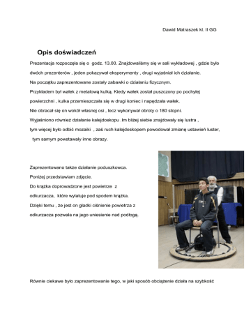 Dawid Matraszek kl. II GG Opis doświadczeń Prezentacja rozpoczęła się o godz. 13.00. Znajdowaliśmy się w sali wykładowej , gdzie było dwóch prezenterów , jeden pokazywał eksperymenty , drugi wyjaśniał ich działanie. Na początku zaprezentowane zostały zabawki o działaniu fizycznym. Przykładem był wałek z metalową kulką. Kiedy wałek został puszczony po pochyłej powierzchni , kulka przemieszczała się w drugi koniec i napędzała wałek. Nie obracał się on wokół własnej osi , lecz wykonywał obroty o 180 stopni. Wyjaśniono również działanie kalejdoskopu .Im bliżej siebie znajdowały się lustra , tym więcej było odbić mozaiki , zaś ruch kalejdoskopem powodował zmianę ustawień luster, tym samym powstawały inne obrazy. Zaprezentowano także działanie poduszkowca. Poniżej przedstawiam zdjęcie. Do krążka doprowadzone jest powietrze z odkurzacza, które wylatuje pod spodem krążka. Dzięki temu , że jest on gładki ciśnienie powietrza z odkurzacza pozwala na jego uniesienie nad podłogą. Równie ciekawe było zaprezentowanie tego, w jaki sposób obciążenie działa na szybkość obrotu. Mężczyzna siedzący na obrotowym krześle w obu rękach trzymał hantle. Wprawiony w ruch, kiedy rozkładał ręce, kręcił się wolniej gdy zaś ręce z hantlami przybliżał do siebie, wtedy przyspieszał. Poniżej prezentuję zdjęcie. Dowiedzieliśmy się także , że jeśli np. talerzyk wprowadzimy w ruch, to będzie się on mógł utrzymać , nawet na cienkim patyku i nie spadnie. Tu także załączam zdjęcie Potem panowie zaprezentowali nam kolejną ciekawostkę. Przygotowany był pochyły i spiralny tor , po którym jechał wagonik ze szklanką wody. Ku naszemu zdumieniu mimo trudnego toru woda ze szklanki nie wylała się. A to zdjęcie z tego pokazu Następnie przeszliśmy do innej sali. Tam odbyły się kolejne pokazy. Na stole stała kolba z niebieską cieczą , która była połączona z termometrem. Pan rozgrzał swoje ręce pocierając je o siebie a następnie dotknął nimi kolby, wtedy zauważyliśmy , że temperatura w termometrze zwiększyła się . Świadczy to o przepływie ciepła przez różne ciała fizyczne . Bardzo ciekawe było doświadczenie z ciekłym azotem i balonem. Polegało ono na tym , aby włożyć napompowany balon do ciekłego azotu. Kiedy to się stało, balon zmniejszał swoją objętość, jakby uchodziło z niego powietrze. Zadziało się tak dlatego ,że powietrze się skropliło w balonie. Po wyjęciu z ciekłego azotu temperatura zwiększyła się, a balon znów powiększył swoją objętość. Zdjęcie z tego pokazu Kolejna prezentacja dotyczyła wprowadzenia rzędu kulek w ruch. Początkowo poruszały się one tak samo a , potem zaczęły tworzyć węża. Wszystkie te pokazy były bardzo ciekawe i widowiskowe. Sądzę , że uczniom się bardzo podobały. To dobry pomysł aby takie pokazy odbywały się corocznie , ponieważ pokazują one , że fizyka jest bardzo ciekawa i uczniowie chętniej będą się jej uczyć.