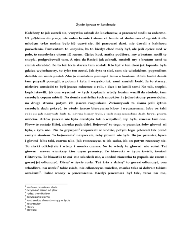 Życie i praca w kołchozie Kołchozy te jak zaczeli sie, wszystko zabrali do kołchozów, a pracować szedli za zadarmo. Ni pójdziesz do pracy, nie dadzo krowie i siana, ni konia ni dadzo zaorać ogród. A dla młodym tyko można było iść uczyć sie, iść pracować dzieś, nie dawali z kałchozu pozwolenia. Pamientam to wszysko, bo to kiedyś choć mały był, ale jeśli ojciec szed w pole, to czszebyła z ojcem iść razem. Ojciec kosi, matka podbiera, my z bratam nosili te snopki, podgrabywali tam. A ojca da Rasieji jak zabrali, musieli my z bratam sami ta ziemia obrabiać. Bo to też takie starsze tam zostali. Kto był w ten dzeń jak łapanka była gdziesi wyjechawszy, to tyko ten został. Jak żyta ta siać, sam nie wiedziałem, poprosiłem dziaćki, on mnie posiał. Ależ ja musiałem pomagać jemu z koniem. A tak łonki skosić tam przyszli pomogli, a potym i żyta, i wszysko już, sami musieli kosić. Ja to starszy, niektóre sonsiedzi to byli jeszcze młoczsze o rok, o dwa i to kosili sami. No tak, snopki, kopki stawili, jak ona wyschni w tych kopkach, wtedy konim wuzili da stodoły, tam czszebyła cepam młócić. Na ziemia naścielisz tych snopków i z jednej strony przewrócisz, na druga strona, potym ich jeszcze rozpuskasz. Zwionzywali ta słoma jeśli żytnia czszebyła dach pokryć, to wtedy jeszcze bierzysz za kłosy i wyczszensasz, żeby on taki robi sie jak nazywali kuli te, równa koncy byli, a jeśli niepoczszebne dach kryć, prosta młócim. Arfów jeszcz`e nie była czszebyła tak o wiejałku1, czy była, rzucasz tam ona. Plewy te zostajo bliżej, ziarnka pada dalej. Bejsować2 to tego, to pszenica, żeby głowni ni była, a żyta nie. Nu to gryszpan3 rozpuskali w wodzie, potym tegu polewali tak przed samym sianiem. Ta bejsowania4 nazywa sie, żeby głowni nie była. Bu jak pszenica, bywa i głowni kłos taki, czarna taka. Jak rozeczszysz, to jak sadza, jak on potym rozeczszy sie. To ziarki odkleji sie i wtedy i monka czarna. Nu to wtedy te głowni nie rośni. Tej głowni nawet wienkszy kłos czym pszenicy. Te bławatki w życie kwitli, konkul filitowym. Te bławatki to oni nie szkodzili nic, a konkul ziareczka ta pupada sie razem i gorzej jej odłonczyć. Dirsa5 w życie rosła. Też żyta z dzirsy6 to gorzaj odłonczyć, ona szkodliwa, nu uszaki7 takie miała, nie odłonczysz, zmielisz, monka taka ni dobra z takimi oszakami8. Takie wonsy w jenczmieniu. Kiedyś jenczmień był taki, teras nie ma, 1 szufla do przesiewu zboża oczyszczać ziarno od plew 3 rodzaj chemikaliów 4 oczyszczanie ziarna 5 kostrzewica; chwast rosnący w życie 6 kostrzewicy 7 plewy 8 plewami 2 sześcirzenny9 nawet, kłos gruby, nu ji dwóchrzenny10. To teras o tiko dwóchrzenny. A kiejiś też sześciurzenny sieli, a potym dwórzenny. Sześcirzenny kałchozy byli, nie sieli, bo najwiencej kołchoz dawał du browaru, na piwa, a ten sześcirzenny na piwa nie szed i kołchozy tak nie sieli jego. Owias też był pinglik taki nazywali, takie o kosy11 wisieli, ale jego czszebyła dopilniować, jeśli cokolak w pora nie skosił, wiatr dmuchnoł, on wtedy i osypuje sie. Kołchozy potym takiego nie sieli, bo oni nie mogli zebrać. Litwin nazywali, taki wysoki taki ros, i tutej takie jak jodełka, ale tam mało tych była ziarek. To takie oni wielkie, tyko sieli na zielone, na zielony karm. Było dużo słomy z niego. A te sowieckie jeszcze nazywali owies. Nu to on taki jak teras taki. Ugór nazywali, ugór ten zostawiali, żyta sieli potym, ten ugór krowy paszo, póki łonki skoszo, łonki skosili, wtedy orzo, tak cienko orali. Potym jakiś czas ona pobeńdzi już przed sianiu, tedy tam bronowali, drapakowali i orali wtedy drugi raz już głymboko orali. I jakie dwa, czszy tygodni po tym zaoraniu, wtedy sieli żyta. Nawozu nie była tak co, ten jak ugór pobeńdzi tak, taki dyrwan12, to potym żyta lepiej rosła. Nia była, dzie tak o mokra miejscy byli, łonki, takie rojst13 tam. Była takich dużo tych rojstow14. Luny15 to u nas była taka łonka, nazywali luny, ale tam nie powiedzieć że ona taka mokra, jak który rok, to tam koniem jechać nie można była, ale trawa tam rosła. Była dalej od naszej wsi, sznury jak nazywali, pupodzielone, luny16 te. Rojsty17 na polu bywa, dziesz taka wrodzie18 jak sadzawka jaka. A takich kupow na polu nie była, u nas tu tych kamieni dużo zabrali kościół z kamieniu. Dookoła o kościoła mur, nu to kiedyśći te kamieni zwozili tutej, dali o gdzieś ut kościoła była takich dużych kamieni. Nu a tak jak te kamieni gdzieś tam nałożona, to nazywali chruśnia19 [Korwie, MŁ33] O zamiłowaniu do techniki W kołchozie ja najpierw jak emteesy20 te byli, mnie posłali do tego emteesu, tam, wszysko, paliwa tam i naczyślać te piniendzy i te paliwa cała prowadzić tam buhalteria. Nu ale to mało płaciło sie, to ja poprosiłem inżyniera żeby mnie dał traktor. W brygadzie 9 sześciorzędny; mający sześć rzędów dwóchrzędny; mający dwa rzędy 11 warkocze 12 odłóg 13 bagno, mokre miejsce 14 bagien 15 bagno, mokradło 16 bagna 17 mokradła 18 niby 19 kupa kamieni w polu 10 20 stał, ni było, nu to on był dawszy. Móji21 on niesprawny. Ja mówia, ja odremontuja. Ja odremontował, pracował. Potym na tych młócarniach w emteesie i ten traktor mały jak miałem, to ja kosił siana, bo byli te żniwiarki konna, to ja do tego traktora przyrobił. I tak mnie interesowała. Gdzieś jak nowa technika przyjdzie, to ja musiał obejrzać wszystko, jak to co. Nu tak była. W emteesie niemieckie młócarni jak przyszli i czszebyła nazywali koniuszyna młócić, tam i inżynier, mechanik jak po sielch`osmaszynam no i nie mogli dowiedzieć sie jak można ta koniuszyna. Wyzwali mnie, ja tam popaczszył, też ja tołku nie dobił sie jak ta koniuszyna. Oni ta młócarnia mówi ciongnij do kołchozu, jak tam dobijeś sie tołku, wtedy nam pozwonisz. Ja przyciongnuł, postawił do gumna ta koniuszyna młócić wózek taki, jej pod spod czszebyła stawić, za