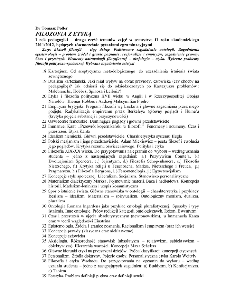 Dr Tomasz Poller FILOZOFIA Z ETYKĄ I rok pedagogiki – druga część tematów zajęć w semestrze II roku akademickiego 2011/2012, będących równocześnie pytaniami egzaminacyjnymi Zarys historii filozofii – ciąg dalszy. Podstawowe zagadnienia ontologii . Zagadnienia epistemologii – problem źródeł i granic poznania, racjonalizm i empiryzm, zagadnienie prawdy. Czas i przestrzeń. Elementy antropologii filozoficznej – aksjologia – etyka. Wybrane problemy filozofii polityczno-społecznej. Wybrane zagadnienia estetyki 18. Kartezjusz. Od sceptycyzmu metodologicznego do uzasadnienia istnienia świata zewnętrznego 19. Dualizm kartezjański. Jaki miał wpływ na obraz przyrody, człowieka (czy choćby na pedagogikę)? Jak odnieśli się do odziedziczonych po Kartezjuszu problemów : Malebranche, Hobbes, Spinoza i Leibniz? 20. Etyka i filozofia polityczna XVII wieku w Anglii i w Rzeczypospolitej Obojga Narodów. Thomas Hobbes i Andrzej Maksymilian Fredro 21. Empiryzm brytyjski. Program filozofii wg Locke’a i główne zagadnienia przez niego podjęte. Radykalizacja empiryzmu przez Berkeleya (główny pogląd) i Hume’a (krytyka pojęcia substancji i przyczynowości) 22. Oświecenie francuskie. Dominujące poglądy i główn i przedstawiciele 23. Immanuel Kant. „Przewrót kopernikański w filozofii”. Fenomeny i noumeny. Czas i przestrzeń. Etyka Kanta 24. Idealizm niemiecki. Główni przedstawiciele. Charakterystyka systemu Hegla 25. Polski mesjanizm i jego przedstawiciele. Adam Mickiewicz – poeta filozof i ewolucja jego poglądów. Krytyka rozumu oświeceniowego. Polityka i etyka 26. Filozofia XIX-XX wieku. Do przygotowania na egzamin do wyboru – według uznania studenta – jedno z następujących zagadnień: a.) Pozytywizm Comte’a, b.) Ewolucjonizm Spencera, c.) Scjentyzm, d.) Filozofia Schopenhauera, e.) Filozofia Nietzschego, f.) Krytyka religii u Feuerbacha, Marksa, Nietzschego i Freuda , g.) Pragmatyzm, h.) Filozofia Bergsona, i. ) Fenomenologia, j.) Egzystencjalizm 27. Koncepcje etyki społecznej. Liberalizm. Socjalizm. Stanowisko personalistyczne 28. Materializm dialektyczny Marksa . Pojmowanie materii. Baza i nadbudowa. Koncepcja historii. Marksizm-leninizm i utopia komunistyczna 29. Spór o istnienie świata. Główne stanowiska w ontologii – charakterystyka i przykłady Realizm – idealizm. Materializm – spirytualizm. Ontologiczny monizm, dualizm, pluralizm 30. Ontologia Romana Ingardena jako przykład ontologii pluralistycznej. Sposoby i typy istnienia. Inne ontologie. Próby redukcji kategorii ontologicznych. Reizm. E wentyzm 31. Czas i przestrzeń w ujęciu absolutystycznym (newtonowskim), u Immanuela Kanta oraz w teorii względności Einsteina 32. Epistemologia. Źródła i granice poznania. Racjonalizm i empiryzm (oraz ich wersje) 33. Koncepcje prawdy (klasyczna oraz nieklasyczne) 34. Koncepcje człowieka 35. Aksjologia. Różnorodność stanowisk (absolutyzm – relatywizm, subiektywizm – obiektywizm). Hierarchia wartości. Koncepcja Maxa Schelera 36. Główne kierunki etyki na przestrzeni dziejów. Próba klasyfikacji koncepcji etycznych 37. Personalizm. Źródła doktryny. Pojęcie osoby. Personalistyczna etyka Karola Wojtyły 38. Filozofia i etyka Wschodu. Do przygotowania na egzamin do wyboru – według uznania studenta – jedno z następujących zagadnień: a) Buddyzm, b) Konfucjanizm, c) Taoizm 39. Estetyka. Problem definicji piękna oraz definicji sztuki 40. Co oznaczają pojęcia: determinizm , indeterminizm, teizm, deizm, panteizm, ateizm, idea (w filozofii nowożytnej, np. u Kartezjusza), scjentyzm, agnostycyzm, liberalizm, libertynizm, utylitaryzm, osoba (definicja klasyczna) , redukcjonizm, zdanie w sensie logicznym, zdanie a priori, zdanie a posteriori, zdanie analityczne, zdanie syntetyczne? Uwagi dla osób zdających egzamin 1. Zgodnie z ustaleniami podjętymi na p ierwszych zajęciach egzamin obejmuje 5 pytań. Zakres każdego z pytań pokrywa się z treścią jed nego z podanych 40 punktów. 2. Z uwagi na podstawowy charakter kursu „Filozofia z etyką” wymagana jest elementarna wiedza podręcznikowa (wiedzy tej musi oczywiście towarzyszyć rozumienie). W wypadku sporej części zagadnień poziomem wymaganym jest poziom podręcznika Władysława Tatarkiewicza „Historia filozofii” . Jeśli chodzi np. o zagadnienia z pogranicza filozofii i nauk ścisłych (czas i przestrzeń – 31), wymagane są najbardziej podstawowe wiadomości z wykładu (znajdują się one także w podanej jako lektura uzupełniająca popularyzatorskiej pracy Michała Hellera „Kosmiczna przygoda człowieka mądr ego”). Część zagadnień (np. filozofia Kartezjusza – 18) przybliża lektura tekstów źródłowych (Kartezjusza „Rozprawa o metodzie”) będących przedmiotem analizy i dyskusji podczas konwersatorium. 3. Chcąc odpowiedzieć na dane pytanie, starajmy się na początku skupić nad tym, co w danym zagadnieniu najważniejsze. Np. przygotowując się do egzaminu z pytania dotyczącego m.in. charakterystyki systemu Hegla (24), postarajmy się przede wszystkim spróbować określić, co tak naprawdę stanowi istotę poglądów tego filozofa (być może da się ją ująć w kilku zdaniach) . Podobnie, w przypadku pytania o kierunki etyki społecznej (27), skupmy się przede wszystkim na kwestii najprostszej: jakie główne cele stawiają sobie takie doktryny, jak liberalizm czy socjalizm? 4. Do zdania egzaminu absolutnie konieczne jest rozumienie pojęć oraz ogólna orientacja w zakresie głównych problemów stanowiących przedmiot zajęć. Osobom uczęszczającym na wykłady i biorącym czynny udział w konwersatorium, które równocześnie sięgną do literatury podstawowej, nie powinno to sprawić trudności. W celu otrzymania oceny dobrej lub bardzo dobrej należy wykazać się odpowiednio większą i bardziej systematyczną wiedzą, zdobytą m.in. dzięki indywidualnej pracy z podaną literaturą. 5. Jasna, konkretna, zwięzł
