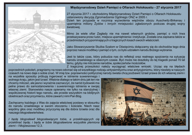 Międzynarodowy Dzień Pamięci o Ofiarach Holokaustu - 27 stycznia 2017 27 stycznia 2017 r. obchodzimy Międzynarodowy Dzień Pamięci o Ofiarach Holokaustu ustanowiony decyzją Zgromadzenia Ogólnego ONZ w 2005 r. Dzień ten przypada w rocznicę wyzwolenia więźniów obozu Auschwitz-Birkenau i upamiętnia miliony Żydów i innych mniejszości zgładzonych podczas drugiej wojny światowej. Mimo że wiele ofiar Zagłady nie ma nawet własnych grobów, pamięć o nich trwa przekazywana przez ludzi, miejsca upamiętnienia i instytucje. Została ona zapisana także w przedmiotach przypominających o tragicznych losach swoich właścicieli. Jako Stowarzyszenie Służba Szalom w Oświęcimiu dołączamy się do obchodów tego dnia poprzez nasze modlitwy i pamięć o tym, co było udziałem narodu Bożego wybrania. Jest to także czas, który pobudza nas do refleksji oraz realnego spojrzenia na sytuację narodu izraelskiego w obecnym czasie. Być może nie doszłoby do tej tragedii ponad 70 lat temu, gdyby nie milczenie narodów, społeczeństw i kościołów. Z tragicznej przeszłości należy wyciągnąć właściwe wnioski. Ucząc się na błędach poprzednich pokoleń, pragniemy na nowo odcinać się od wszelkiego rodzaju antysemityzmu oraz antysyjonizmu, który niestety w naszych czasach na nowo daje o sobie znać. W imię tzw. poprawności politycznej narody świata chcą pozbawić Izrael prawa do ich własnej ziemi i na wszelkie sposoby próbują ingerować w istnienie suwerennego i wolnego kraju, jakim jest Izrael. Właśnie dlatego w takim dniu jak ten nie chcemy milczeć, ale jasno i wyraźnie zaznaczyć, że naród żydowski ma pełne prawo do samostanowienia i suwerennego istnienia w swojej własnej ziemi. Stanowisko nasze opieramy nie tylko na starożytnej i współczesnej historii tego narodu, ale przede wszystkim na biblijnych obietnicach oraz przymierzu, które zawarł z nimi Pan Bóg. Zachęcamy każdego z Was do zajęcia właściwej postawy w stosunku do narodu izraelskiego w swoim otoczeniu i kościele. Niech nasz wspólny głos oraz modlitwy przyczynią się dla dobra Izraela oraz dla naszego błogosławieństwa. I będę błogosławił błogosławiącym tobie, a przeklinających cię przeklinać będę; i będą w tobie błogosławione wszystkie plemiona ziemi – I Mojżeszowa 12,3.