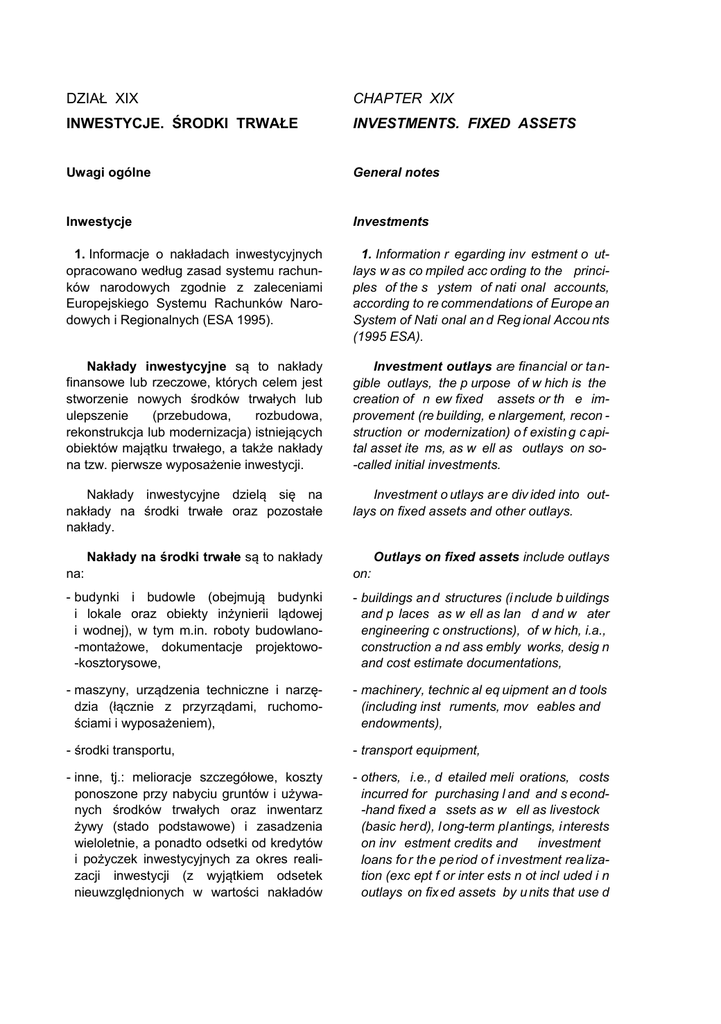 DZIAŁ XIX CHAPTER XIX INWESTYCJE. ŚRODKI TRWAŁE INVESTMENTS. FIXED ASSETS Uwagi ogólne General notes Inwestycje Investments 1. Informacje o nakładach inwestycyjnych opracowano według zasad systemu rachunków narodowych zgodnie z zaleceniami Europejskiego Systemu Rachunków Narodowych i Regionalnych (ESA 1995). 1. Information r egarding inv estment o utlays w as co mpiled acc ording to the principles of the s ystem of nati onal accounts, according to re commendations of Europe an System of Nati onal an d Reg ional Accou nts (1995 ESA). Nakłady inwestycyjne są to nakłady finansowe lub rzeczowe, których celem jest stworzenie nowych środków trwałych lub ulepszenie (przebudowa, rozbudowa, rekonstrukcja lub modernizacja) istniejących obiektów majątku trwałego, a także nakłady na tzw. pierwsze wyposażenie inwestycji. Investment outlays are financial or ta ngible outlays, the p urpose of w hich is the creation of n ew fixed assets or th e improvement (re building, e nlargement, recon struction or modernization) o f existin g c apital asset ite ms, as w ell as outlays on so-called initial investments. Nakłady inwestycyjne dzielą się na nakłady na środki trwałe oraz pozostałe nakłady. Investment o utlays ar e div ided into outlays on fixed assets and other outlays. Nakłady na środki trwałe są to nakłady Outlays on fixed assets include outlays na: on: - budynki i budowle (obejmują budynki i lokale oraz obiekty inżynierii lądowej i wodnej), w tym m.in. roboty budowlano-montażowe, dokumentacje projektowo-kosztorysowe, - buildings an d structures (i nclude b uildings and p laces as w ell as lan d and w ater engineering c onstructions), of w hich, i.a., construction a nd ass embly works, desig n and cost estimate documentations, - maszyny, urządzenia techniczne i narzędzia (łącznie z przyrządami, ruchomościami i wyposażeniem), - machinery, technic al eq uipment an d tools (including inst ruments, mov eables and endowments), - środki transportu, - transport equipment, - inne, tj.: melioracje szczegółowe, koszty ponoszone przy nabyciu gruntów i używanych środków trwałych oraz inwentarz żywy (stado podstawowe) i zasadzenia wieloletnie, a ponadto odsetki od kredytów i pożyczek inwestycyjnych za okres realizacji inwestycji (z wyjątkiem odsetek nieuwzględnionych w wartości nakładów - others, i.e., d etailed meli orations, costs incurred for purchasing l and and s econd-hand fixed a ssets as w ell as livestock (basic her d), l ong-term pl antings, i nterests on inv estment credits and investment loans fo r th e pe riod o f i nvestment rea lization (exc ept f or inter ests n ot incl uded i n outlays on fix ed assets by u nits that use d INVESTMENTS. FIXED ASSETS na środki trwałe przez podmioty stosujące od 2005 r. Międzynarodowe Standardy Rachunkowości - MSR). since 2005 Internati Standards - IAS). onal Accou 315 nting Pozostałe nakłady są to nakłady na tzw. pierwsze wyposażenie inwestycji oraz inne koszty związane z realizacją inwestycji. Nakłady te nie zwiększają wartości środków trwałych. Other outlays are o utlays on so-c alled initial investments as w ell as oth er c osts connected w ith invest ment reali zation. These outl ays do not incr ease the valu e of fixed assets. 2. Nakłady inwestycyjne zaliczono do odpowiednich sekcji Polskiej Klasyfikacji Działalności (PKD 2007) zgodnie z zaklasyfikowaniem działalności inwestora (podmiotu gospodarki narodowej), z wyjątkiem nakładów na obiekty niezwiązane z jego podstawową działalnością, które zaliczono do odpowiednich sekcji według kryterium przeznaczenia obiektu (dotyczy np.: budynków i lokali mieszkalnych, obiektów przeznaczonych dla potrzeb edukacji, ochrony zdrowia, sportu i rekreacji). 2. Investment outlays are incl uded into the appropriate se ctions of the N ACE Rev. 2 in accordance w ith the classifi cation of the investor’s activity ( entity of the natio nal economy), w ith the exception of o utlays on structures not connected with its basic activity, which were included into the appropriate sections according to the criteria of structure destination (concer ning, e.g.: reside ntial buildings a nd places, bui ldings for ed ucation, he alth c are, sport a nd recre ational purposes). Od 2005 r. nakłady inwestycyjne na drogi publiczne, ulice i place zalicza się do sekcji „Transport i gospodarka magazynowa”. Investment outlays on pu blic roads, streets and s quares are included i n the section “T ransportation an d storage” si nce 2005. Środki trwałe Fixed assets 1. Do środków trwałych zalicza się kompletne i nadające się do użytku, składniki majątkowe o przewidywanym okresie używania dłuższym niż rok, w tym również drogi publiczne, ulice i place łącznie z poboczami i podbudową, uzbrojenie terenu, zasadzenia wieloletnie, melioracje, budowle wodne, grunty i inwentarz żywy (stado podstawowe) oraz od 1 I 2002 r. spółdzielcze własnościowe prawo do lokalu mieszkalnego i spółdzielcze prawo do lokalu niemieszkalnego (użytkowego). 1. Fixed assets include asset components and oth er o bjects compl eted and rea dy fo r usage w ith a n exp ected p eriod of utility exceeding 1 year, of w hich also p ublic roads, streets and sq uares, together w ith shoulders and found ations, deve lopment o f tracts of land, lon g-term pla ntings, meli orations, w ater structures, lan d and liv estock (basic herd) a s w ell as si nce 1 I 20 02 co -operative ow nership rig ht to reside ntial premise an d co -operative ri ght to non -residential (utilitarian) premise. Dane o środkach trwałych nie obejmują wartości gruntów uznanych od 1 I 1991 r. za środki trwałe zgodnie z rozporządzeniem Rady Ministrów z dnia 12 XII 1990 r. (Dz. U. Nr 90, poz. 529) oraz prawa użytkowania wieczystego gruntu uznanego od 1 I 2002 r. Data reg arding fixed ass ets do not include the value of land reco gnised, since 1 I 1991, as fixed assets, in ac cordance w ith th