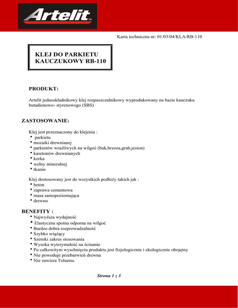 Karta techniczna nr: 01/03/04/KLA/RB-110 KLEJ DO PARKIETU KAUCZUKOWY RB-110 PRODUKT: Artelit jednoskładnikowy klej rozpuszczalnikowy wyprodukowany na bazie kauczuku butadienowo- styrenowego (SBS) ZASTOSOWANIE: Klej jest przeznaczony do klejenia : h parkietu hmozaiki drewnianej hparkietów wrażliwych na wilgoć (buk,brzoza,grab,jesion) hkasetonów drewnianych hkorka hwełny mineralnej htkanin Klej dostosowany jest do wszystkich podłoży takich jak : hbeton hzaprawa cementowa hmasa samopoziomująca hdrewno BENEFITY : hNajwyższa wydajność hElastyczna spoina odporna na wilgoć hBardzo dobra rozprowadzalność hSzybko wiążący hSzeroki zakres stosowania hWysoka wytrzymałość na ścinanie hPo całkowitym wyschnięciu produktu jest fizjologicznie i ekologicznie obojętny hNie powoduje przebarwień drewna hNie zawiera Toluenu. Strona 1 z 3 SPOSÓB UŻYCIA : 1.Przygotowanie podłoża Podłoże oczyścić, odpylić, osuszyć i wyrównać. Podłoże musi być równe, nośne, wolne od pęknięć, suche, czyste, i wolne od materiałów utrudniających przyczepność. 2.Gruntowanie : Przed przystąpieniem do klejenia zaleca się gruntować podłoże gruntem rozpuszczalnikowym Artelit RB-110 z oferty Selena S.A. lub klejem rozcieńczonym w rozpuszczalniku w proporcji 1:1 lub 1:2 w zależności od chłonności podłoża. 3.Obróbka : hKlej przed użyciem wymieszać, następnie za pomocą odpowiedniej szpachli zębatej nanieść równomiernie na podłoże. Nanosić taką ilość kleju, jaką można pokryć parkietem w przeciągu 10 minut. hElementy parkietu ułożyć na kleju, lekko przesunąć, a następnie silnie docisnąć do podłoża hPomiędzy ścianą a parkietem należy zachować odstęp 10-15 mm, który trzeba zabezpieczyć klinami. Po ułożeniu parkietu kliny usunąć . hCyklinowanie i lakierowanie wykonać po całkowitym związaniu kleju. hNarzędzia po użyciu oczyścić rozpuszczalnikiem. hPo zakończeniu prac pomieszczenia wietrzyć do zaniku zapachu. DANE TECHNICZNE : hSkład : kauczuki SBS, żywice węglowodorowe, rozpuszczalniki organiczne, wypełniacze mineralne. hKolor : beżowy hRodzaj spoiny : elastyczna hGęstość : ok.1,2 g/cm3 hCzas pracy : 15-20 min.(w temp.200 C) hCzas pełnego utwardzenia : 3-5 dni (w zależności od warunków otoczenia i chłonności podłoża) hDobre rozpuszczalniki : benzyna ekstrakcyjna hWydajność : 0,7-1,0 kg/m2 OPAKOWANIE : Produkt dostępny w opakowaniach: Ilość sztuk na palecie • 1 kg 546 • 3,5 kg 132 • 6 kg 100 • 14 kg 44 • 21 kg 33 Strona 2 z 3 PRZECHOWYWANIE : Klej należy przechowywać w oryginalnie zamkniętych opakowaniach w temperaturze od 10 do 250 C. Data ważności i numer partii na opakowaniu. BEZPIECZEŃSTWO : Produkt łatwopalny i drażniący. Wszelkie prace wykonywać w dobrze wentylowanych pomieszczeniach z dala od jakichkolwiek źródeł ognia. Przestrzegać ogólnych przepisów BHP i p.poż. dotyczących prac z substancjami łatwopalnymi. ATESTY : Produkt posiada: • Atest PZH nr HK/B/2220/04/2002 08.03.04 Powyższe dane, zalecenia i wskazówki opierają się na naszej najlepszej wiedzy, badaniach oraz doświadczeniach i zostały udzielone w dobrej wierze, zgodnie z zasadami obowiązującymi w naszej firmie i u naszych dostawców. Zaproponowane sposoby postępowania uznane są za powszechne, jednak każdy z użytkowników tego materiału powinien upewnić się na wszelkie możliwe sposoby, włącznie ze sprawdzeniem produktu końcowego w odpowiednich warunkach, o przydatności dostarczanych materiałów dla osiągnięcia celów przez niego zamierzonych. Ani Spółka, ani jej upoważnieni przedstawiciele nie mogą ponosić odpowiedzialności za jakiekolwiek straty poniesione na skutek nieprawidłowego, bądź błędnego użycia jej materiałów. Strona 3 z 3