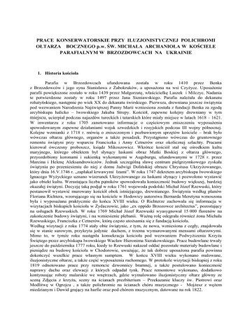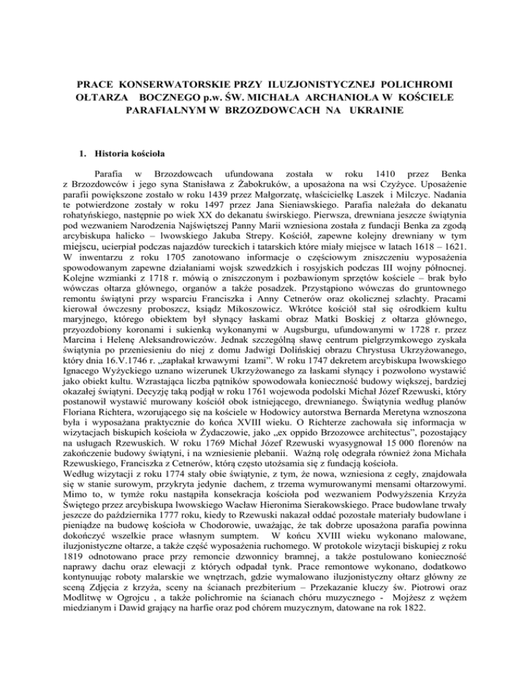 PRACE KONSERWATORSKIE PRZY ILUZJONISTYCZNEJ POLICHROMI OŁTARZA BOCZNEGO p.w. ŚW. MICHAŁA ARCHANIOŁA W KOŚCIELE PARAFIALNYM W BRZOZDOWCACH NA UKRAINIE 1. Historia kościoła Parafia w Brzozdowcach ufundowana została w roku 1410 przez Benka z Brzozdowców i jego syna Stanisława z Żabokruków, a uposażona na wsi Czyżyce. Uposażenie parafii powiększone zostało w roku 1439 przez Małgorzatę, właścicielkę Laszek i Milczyc. Nadania te potwierdzone zostały w roku 1497 przez Jana Sieniawskiego. Parafia należała do dekanatu rohatyńskiego, następnie po wiek XX do dekanatu świrskiego. Pierwsza, drewniana jeszcze świątynia pod wezwaniem Narodzenia Najświętszej Panny Marii wzniesiona została z fundacji Benka za zgodą arcybiskupa halicko – lwowskiego Jakuba Strepy. Kościół, zapewne kolejny drewniany w tym miejscu, ucierpiał podczas najazdów tureckich i tatarskich które miały miejsce w latach 1618 – 1621. W inwentarzu z roku 1705 zanotowano informacje o częściowym zniszczeniu wyposażenia spowodowanym zapewne działaniami wojsk szwedzkich i rosyjskich podczas III wojny północnej. Kolejne wzmianki z 1718 r. mówią o zniszczonym i pozbawionym sprzętów kościele – brak było wówczas ołtarza głównego, organów a także posadzek. Przystąpiono wówczas do gruntownego remontu świątyni przy wsparciu Franciszka i Anny Cetnerów oraz okolicznej szlachty. Pracami kierował ówczesny proboszcz, ksiądz Mikoszowicz. Wkrótce kościół stał się ośrodkiem kultu maryjnego, którego obiektem był słynący łaskami obraz Matki Boskiej z ołtarza głównego, przyozdobiony koronami i sukienką wykonanymi w Augsburgu, ufundowanymi w 1728 r. przez Marcina i Helenę Aleksandrowiczów. Jednak szczególną sławę centrum pielgrzymkowego zyskała świątynia po przeniesieniu do niej z domu Jadwigi Dolińskiej obrazu Chrystusa Ukrzyżowanego, który dnia 16.V.1746 r. „zapłakał krwawymi łzami”. W roku 1747 dekretem arcybiskupa lwowskiego Ignacego Wyżyckiego uznano wizerunek Ukrzyżowanego za łaskami słynący i pozwolono wystawić jako obiekt kultu. Wzrastająca liczba pątników spowodowała konieczność budowy większej, bardziej okazałej świątyni. Decyzję taką podjął w roku 1761 wojewoda podolski Michał Józef Rzewuski, który postanowił wystawić murowany kościół obok istniejącego, drewnianego. Świątynia według planów Floriana Richtera, wzorującego się na kościele w Hodowicy autorstwa Bernarda Meretyna wznoszona była i wyposażana praktycznie do końca XVIII wieku. O Richterze zachowała się informacja w wizytacjach biskupich kościoła w Żydaczowie, jako „ex oppido Brzozowce architectus”, pozostający na usługach Rzewuskich. W roku 1769 Michał Józef Rzewuski wyasygnował 15 000 florenów na zakończenie budowy świątyni, i na wzniesienie plebanii. Ważną rolę odegrała również żona Michała Rzewuskiego, Franciszka z Cetnerów, którą często utożsamia się z fundacją kościoła. Według wizytacji z roku 1774 stały obie świątynie, z tym, że nowa, wzniesiona z cegły, znajdowała się w stanie surowym, przykryta jedynie dachem, z trzema wymurowanymi mensami ołtarzowymi. Mimo to, w tymże roku nastąpiła konsekracja kościoła pod wezwaniem Podwyższenia Krzyża Świętego przez arcybiskupa lwowskiego Wacław Hieronima Sierakowskiego. Prace budowlane trwały jeszcze do października 1777 roku, kiedy to Rzewuski nakazał oddać pozostałe materiały budowlane i pieniądze na budowę kościoła w Chodorowie, uważając, że tak dobrze uposażona parafia powinna dokończyć wszelkie prace własnym sumptem. W końcu XVIII wieku wykonano malowane, iluzjonistyczne ołtarze, a także część wyposażenia ruchomego. W protokole wizytacji biskupiej z roku 1819 odnotowano prace przy remoncie dzwonnicy bramnej, a także postulowano konieczność naprawy dachu oraz elewacji z których odpadał tynk. Prace remontowe wykonano, dodatkowo kontynuując roboty malarskie we wnętrzach, gdzie wymalowano iluzjonistyczny ołtarz główny ze sceną Zdjęcia z krzyża, sceny na ścianach prezbiterium – Przekazanie kluczy św. Piotrowi oraz Modlitwę w Ogrojcu , a także polichromie na ścianach chóru muzycznego - Mojżesz z wężem miedzianym i Dawid grający na harfie oraz pod chórem muzycznym, datowane na rok 1822. W kopule wykonano kompozycję Wniebowstąpienia, na pendentywach natomiast przedstawienia czterech Ewangelistów malowane „en grisaille” datowane na rok 1821. Kolejne wizytacje z roku 1829 określają zarówno stan budynku kościelnego jak i wyposażenia jako dobry. Dopełnieniem wystroju świątyni było zamontowanie w roku 1884 organów, które sfinansowano z funduszy pozyskanych od kolatorów jak i ze składek wiernych. Z powodu wzrastającej liczby pątników przymierzano się w latach międzywojennych do powiększenia kościoła od strony północnej, ale zamierzenia te spełzły na niczym. Ostatecznie wykonano jedynie w roku 1932 prace remontowe podczas których uzupełniono tynki na elewacjach oraz poddano renowacji elementy wystroju kamieniarskiego. W latach II wojny światowej kościół nie poniósł szczególnych strat poza rekwizycją przez Niemców dwóch dzwonów. Wskutek przesunięcia granic po drugiej wojnie światowej Brzozowce pozostały poza terytorium państwa polskiego co zaważyło na dalszych losach świątyni. Już 16. X 1945 r. ksiądz Michał Kaspruk odprawił ostatnią msze i opuścił Brzozdowce zabierając ze sobą obraz Chrystusa Ukrzyżowanego wraz z wotami, niewielką część argentariów, chorągwie kościelne, ornaty i kapy. Większość uratowanego przed zniszczeniem wyposażenia została przewieziona do katedry w Kamieniu Pomorskim, pozostała część umieszczona została w kościołach filialnych katedry kamieńskiej. Opuszczony przez większość wiernych kościół w Brzozowcach został zamknięty w 1947 r. i zamieniony na magazyn kołchozowy w którym przechowywano nawozy, p