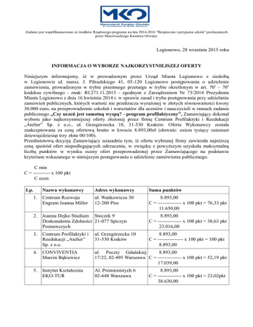 Zadanie jest współfinansowane ze środków Rządowego programu na lata 2014-2016 "Bezpieczna i przyjazna szkoła" przekazanych przez Mazowieckiego Kuratora Oświaty. Legionowo, 28 września 2015 roku INFORMACJA O WYBORZE NAJKORZYSTNIEJSZEJ OFERTY Niniejszym informujemy, iż w prowadzonym przez Urząd Miasta Legionowo z siedzibą w Legionowie ul. marsz. J. Piłsudskiego 41, 05-120 Legionowo postępowaniu o udzielenie zamówienia, prowadzonym w trybie pisemnego przetargu w trybie określonym w art. 701 – 705 kodeksu cywilnego - znak: Rf.271.11.2015 - zgodnym z Zarządzeniem Nr 73/2014 Prezydenta Miasta Legionowo z dnia 16 kwietnia 2014 r. w sprawie zasad i trybu postępowania przy udzielaniu zamówień publicznych, których wartość nie przekracza wyrażonej w złotych równowartości kwoty 30.000 euro, na przeprowadzenie szkoleń i warsztatów dla uczniów i nauczycieli w ramach zadania publicznego „Czy uczeń jest samotną wyspą? - program profilaktyczny”, Zamawiający dokonał wyboru jako najkorzystniejszej oferty złożonej przez firmę Centrum Profilaktyki i Reedukacji „Atelier” Sp. z o.o., ul. Grzegórzecka 10, 31-530 Kraków. Oferta Wykonawcy została zaakceptowana za cenę ofertową brutto w kwocie 8.893,00zł (słownie: osiem tysięcy osiemset dziewięćdziesiąt trzy złote 00/100). Przedmiotową decyzję Zamawiający uzasadnia tym, iż oferta wybranej firmy zawierała najniższą cenę spośród ofert niepodlegających odrzuceniu, w związku z powyższym uzyskała maksymalną liczbę punktów w wyniku oceny ofert przeprowadzonej przez Zamawiającego na podstawie kryterium wskazanego w niniejszym postępowaniu o udzielenie zamówienia publicznego. C min C = ---------- x 100 pkt C ocen Lp. Nazwa wykonawcy Adres wykonawcy Suma punktów 1. Centrum Rozwoju Engram Joanna Miller ul. Wańkowicza 30 12-200 Pisz 8.893,00 C = -------------- x 100 pkt = 76,33 pkt 11.650,00 2. Joanna Dejko Studium Stoczek 9 Doskonalenia Zdolności 21-077 Spiczyn Poznawczych 8.893,00 C = -------------- x 100 pkt = 38,63 pkt 23.016,00 3. Centrum Profilaktyki i Reedukacji „Atelier” Sp. z o.o. ul. Grzegórzecka 10 31-530 Kraków 8.893,00 C = --------------- x 100 pkt = 100 pkt 8.893,00 4. CONVIVENTIA Marcin Bąkiewicz ul. Poczty Gdańskiej 8.893,00 17/22, 02-495 Warszawa C = -------------- x 100 pkt = 52,19 pkt 17.039,00 5. Instytut Kształcenia EKO-TUR Al. Promienistych 6 02-648 Warszawa 8.893,00 C = -------------- x 100 pkt = 23,02pkt 38.630,00 Zadanie jest współfinansowane ze środków Rządowego programu na lata 2014-2016 "Bezpieczna i przyjazna szkoła" przekazanych przez Mazowieckiego Kuratora Oświaty. Ponadto informujemy, iż oferta firmy Studio Rozwojowe Olga Matecka ul. Gallusa 12, 40-594 Katowice oraz oferta firmy TIME EXPERT ul. Armii Ludowej 26-32c/6, 87-100 Toruń zostały odrzucone zgodnie z Zarządzeniem Nr 73/2014 Prezydenta Miasta Legionowo z dnia 16.04.2014 r. w sprawie zasad i trybu postępowania przy udzielaniu zamówień publicznych, których wartość nie przekracza wyrażonej w złotych równowartości kwoty 30.000 euro (zawiera rażąco niską cenę w stosunku do przedmiotu zamówienia; zamawiający odrzuca ofertę wykonawcy, który nie złożył wyjaśnień lub jeżeli dokonana ocena wyjaśnień wraz z dostarczonymi dowodami potwierdza, że oferta zawiera rażąco niską cenę w stosunku do przedmiotu zamówienia). PREZYDENT MIASTA mgr Roman Smogorzewski