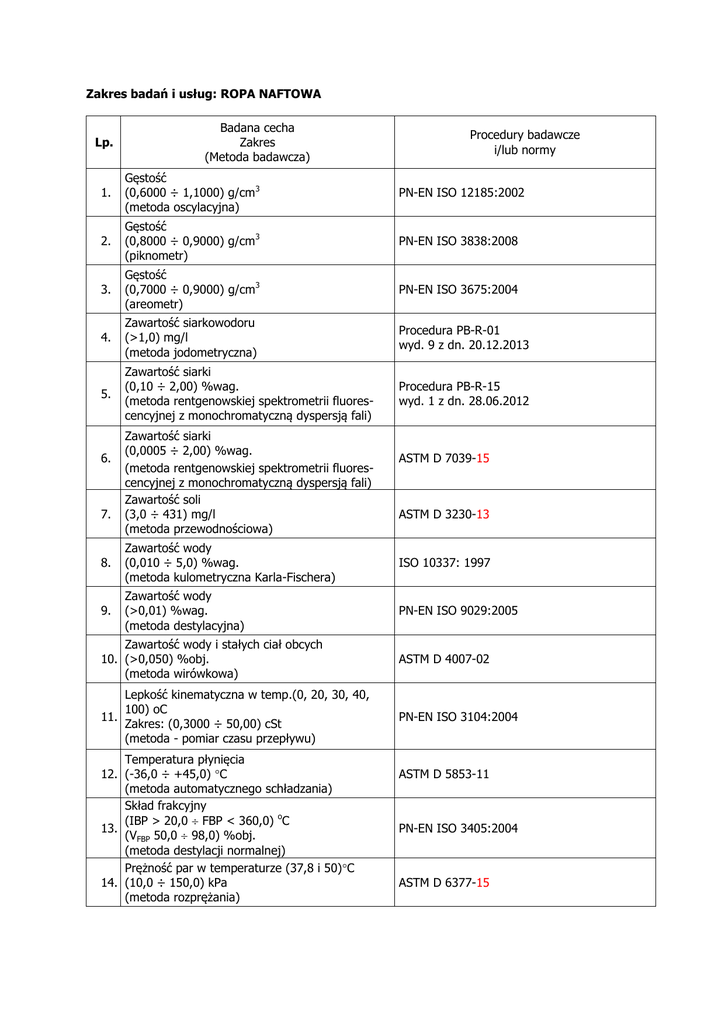 Zakres badań i usług: ROPA NAFTOWA Lp. Badana cecha Zakres